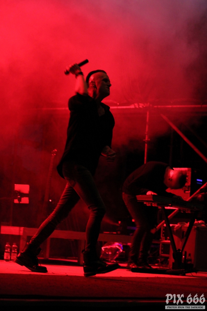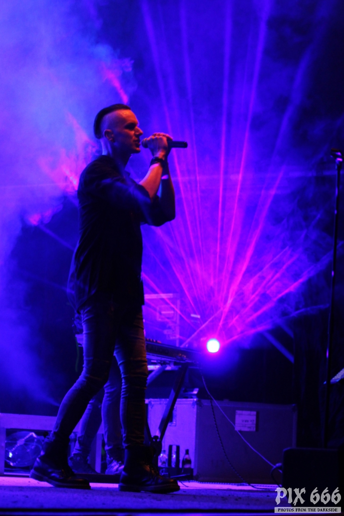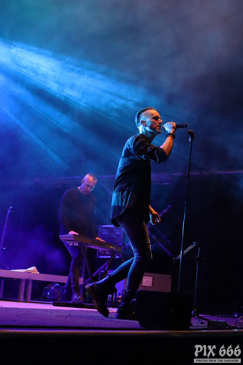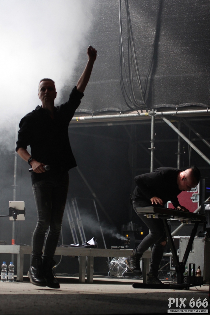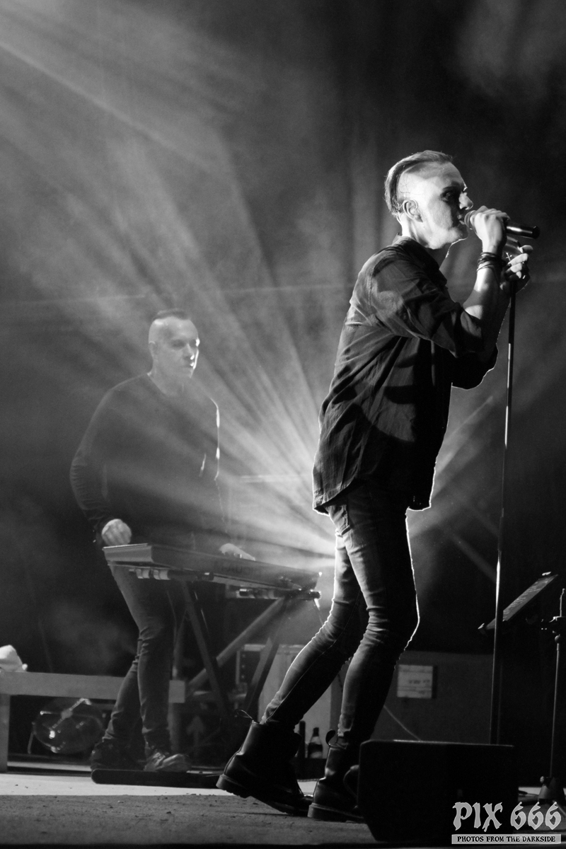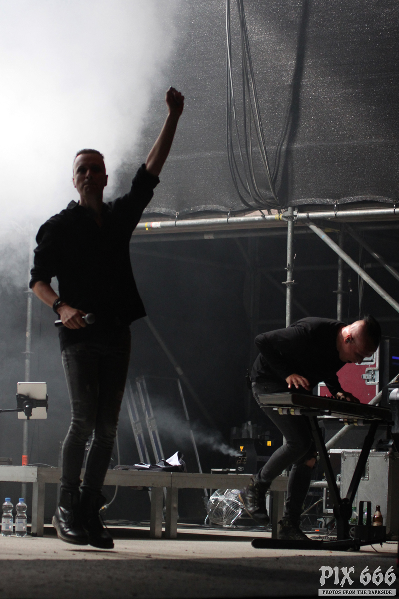 Das Gelände füllte sich nur zögerlich. Aber pünktlich zu Konzertbeginn war die Parkbühne dann ganz in ‚Schwarz‘. Viele Besucher trugen Solar Fake Fanshirts oder die coolen Shadowplay e.V. Jacken – eine gute Wahl, denn nach Sonnenuntergang wurde es spürbar kälter. Die Open Air Veranstaltung war mit knapp über 500 Menschen ausverkauft. Dafür wurden 500 Stühle auf dem Areal verteilt – die Stühle waren in Vierergruppen aufgestellt – mit jeweils genügend Sicherheitsabstand zu allen Seiten.