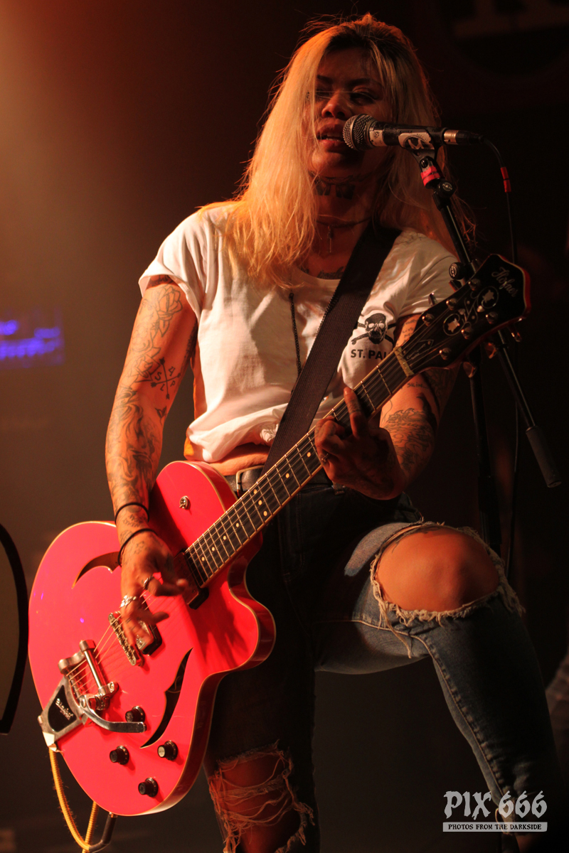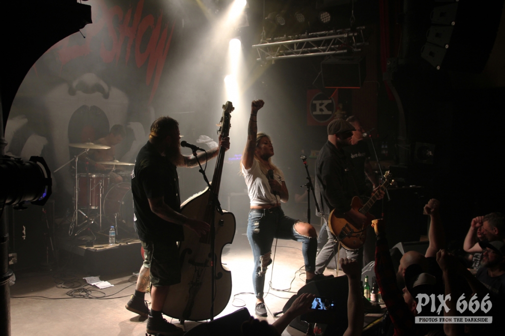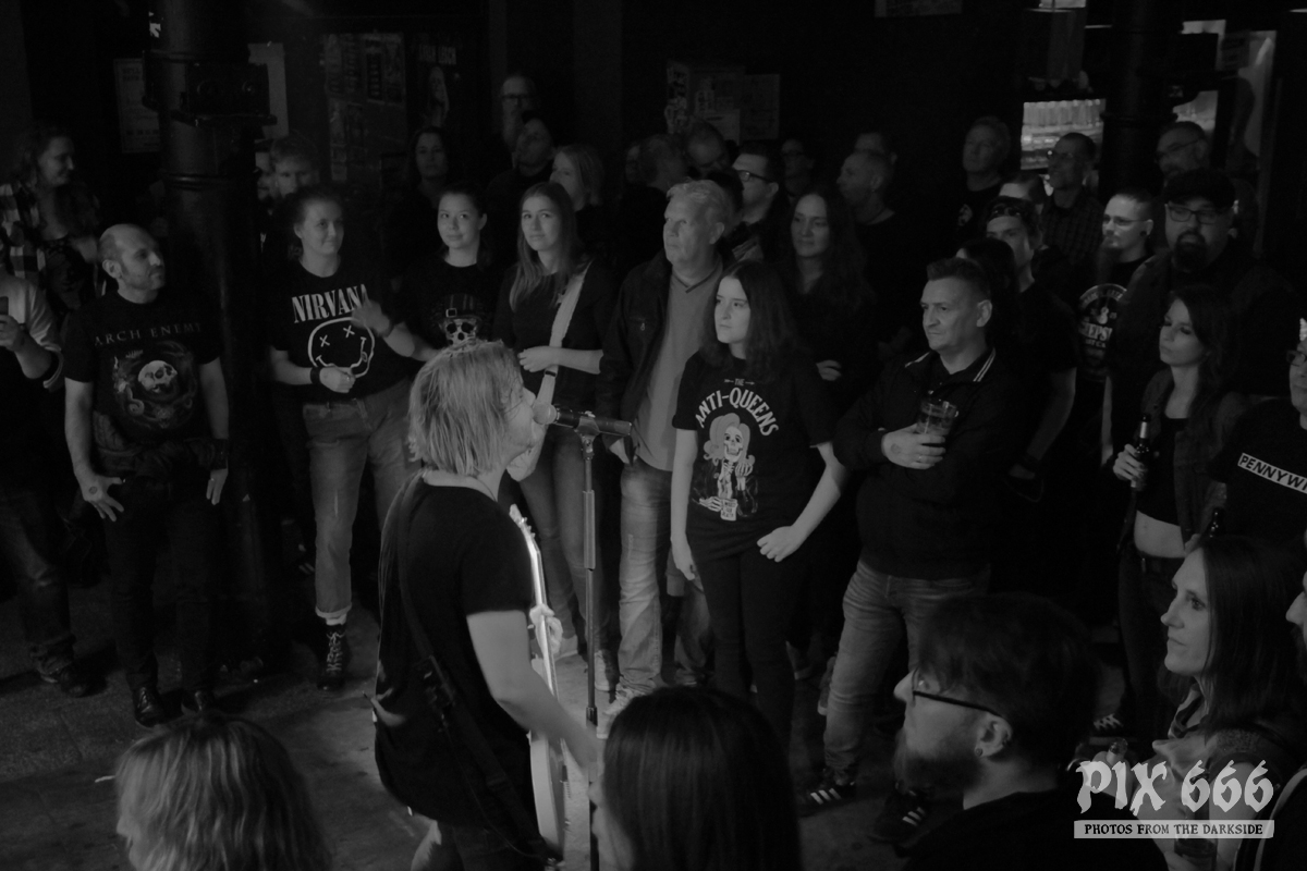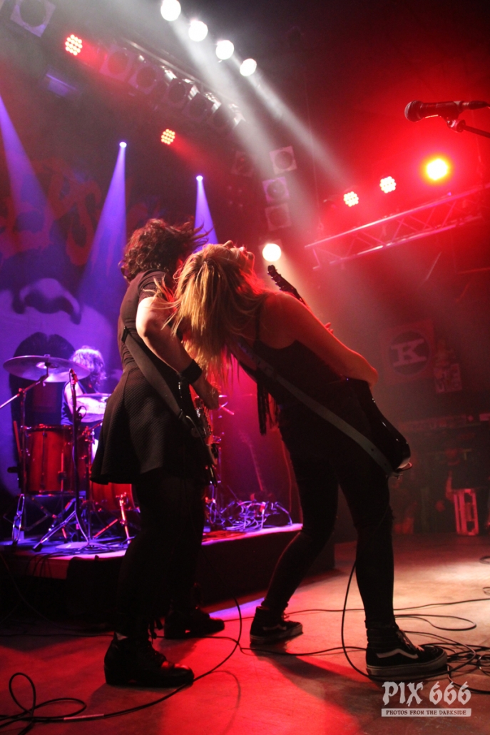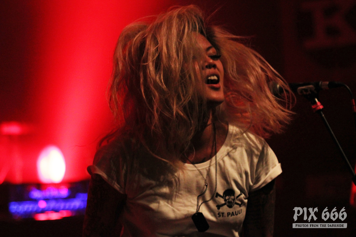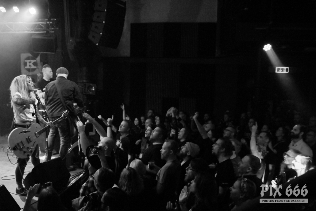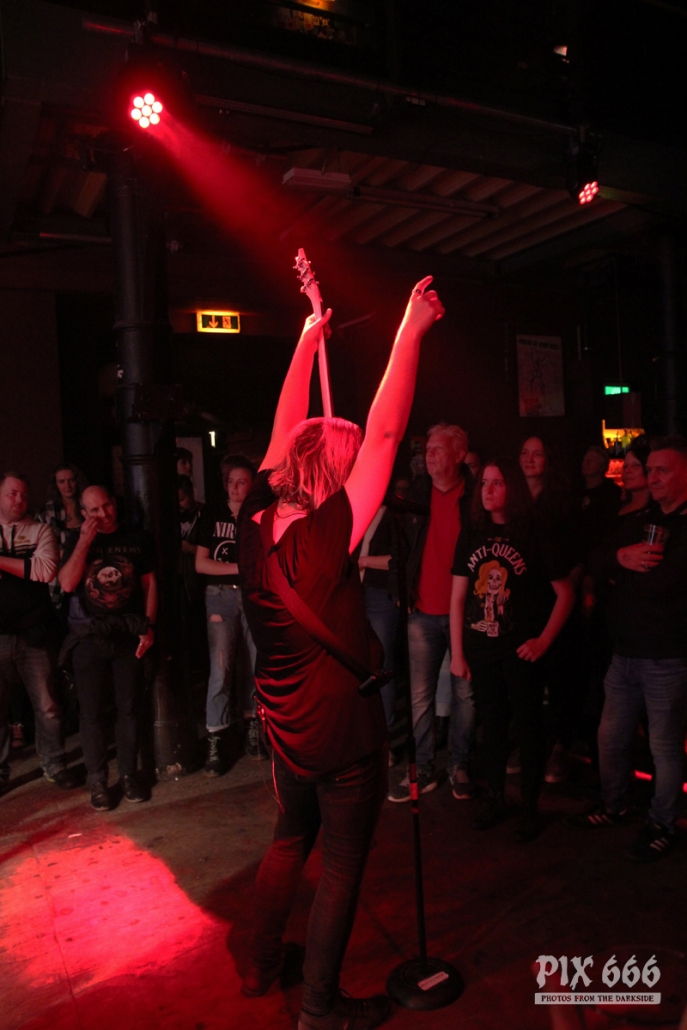 Jetzt war richtig Partystimmung und sogar ‚Happy Birthday‘ wurde angestimmt – Alex, ein Fan im Publikum hatte Geburtstag. Die Band sagte, es ist ihr ‚Lieblingsdeutscher‘. Volle Energie gab es dann bei ‚Grave Diggers‘ – auf und vor der Bühne. Es war reichlich Abwechselung geboten, bei einem Song tauschte Kenda ihre rote E-Gitarre gegen eine schwarze Akustik Gitarre, dann gab es einen Song, den sie schon lange nicht mehr gespielt hatten und einen Song, den die Männer alleine performten – kurze Pause für Sängerin Kenda. Bei ‚Death At My Door‘ sagte ‚Sickboy‘: „Hamburg, ich kann euch nicht hören.“ Und sofort waren die Fans wieder voll da. Bei ‚Shake‘ drehte Kenda eine Runde durchs Publikum. „Wir brauchen jetzt eure Hilfe – alle die Hände in die Luft – und zwar so…“ Und dann ging bei ‚Sticks and Stones‘ die Post so richtig ab, die Hamburger waren nun nicht mehr zu halten. „Könnt ihr mit uns singen? – Wollt ihr mit uns singen?“ ‚Ohhooohooo ooooo see you in hell‘ schallte es dann aus hunderten Kehlen – total cool „Lauter! Komm los, Hamburg“.