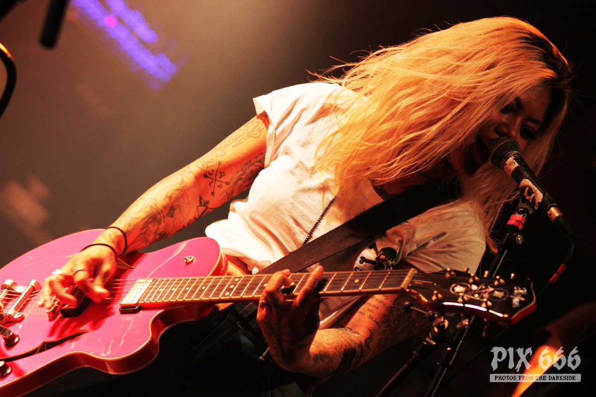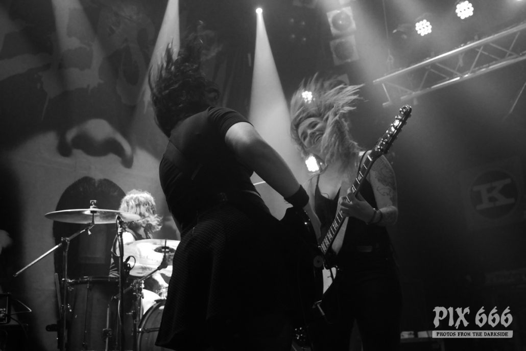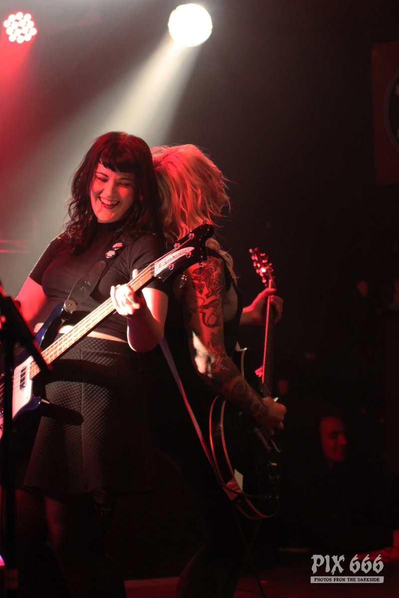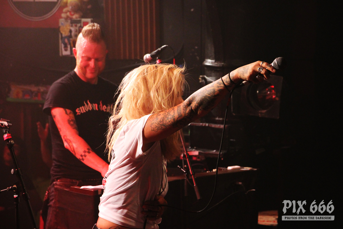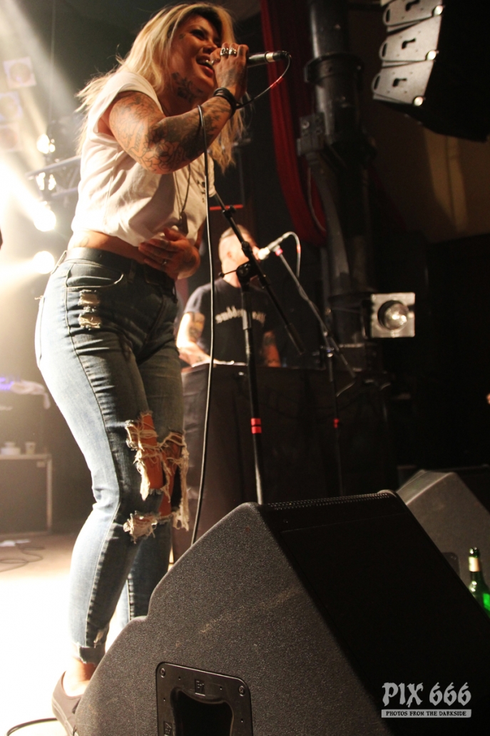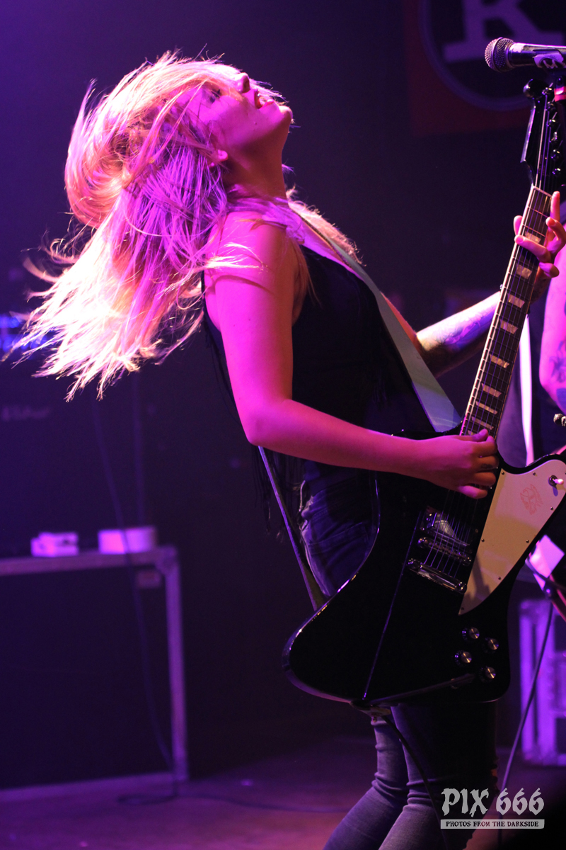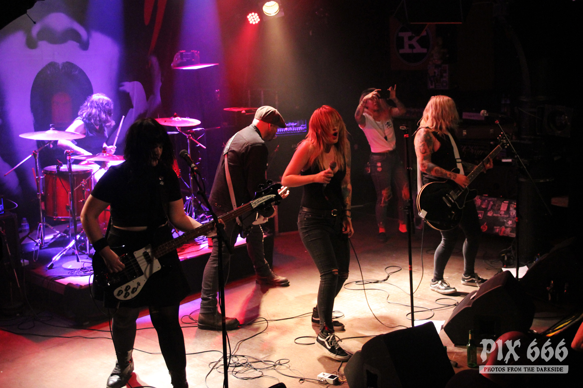 Jetzt war richtig Partystimmung und sogar ‚Happy Birthday‘ wurde angestimmt – Alex, ein Fan im Publikum hatte Geburtstag. Die Band sagte, es ist ihr ‚Lieblingsdeutscher‘. Volle Energie gab es dann bei ‚Grave Diggers‘ – auf und vor der Bühne. Es war reichlich Abwechselung geboten, bei einem Song tauschte Kenda ihre rote E-Gitarre gegen eine schwarze Akustik Gitarre, dann gab es einen Song, den sie schon lange nicht mehr gespielt hatten und einen Song, den die Männer alleine performten – kurze Pause für Sängerin Kenda. Bei ‚Death At My Door‘ sagte ‚Sickboy‘: „Hamburg, ich kann euch nicht hören.“ Und sofort waren die Fans wieder voll da. Bei ‚Shake‘ drehte Kenda eine Runde durchs Publikum. „Wir brauchen jetzt eure Hilfe – alle die Hände in die Luft – und zwar so…“ Und dann ging bei ‚Sticks and Stones‘ die Post so richtig ab, die Hamburger waren nun nicht mehr zu halten. „Könnt ihr mit uns singen? – Wollt ihr mit uns singen?“ ‚Ohhooohooo ooooo see you in hell‘ schallte es dann aus hunderten Kehlen – total cool „Lauter! Komm los, Hamburg“.