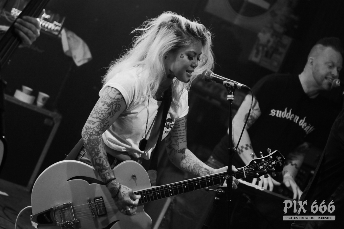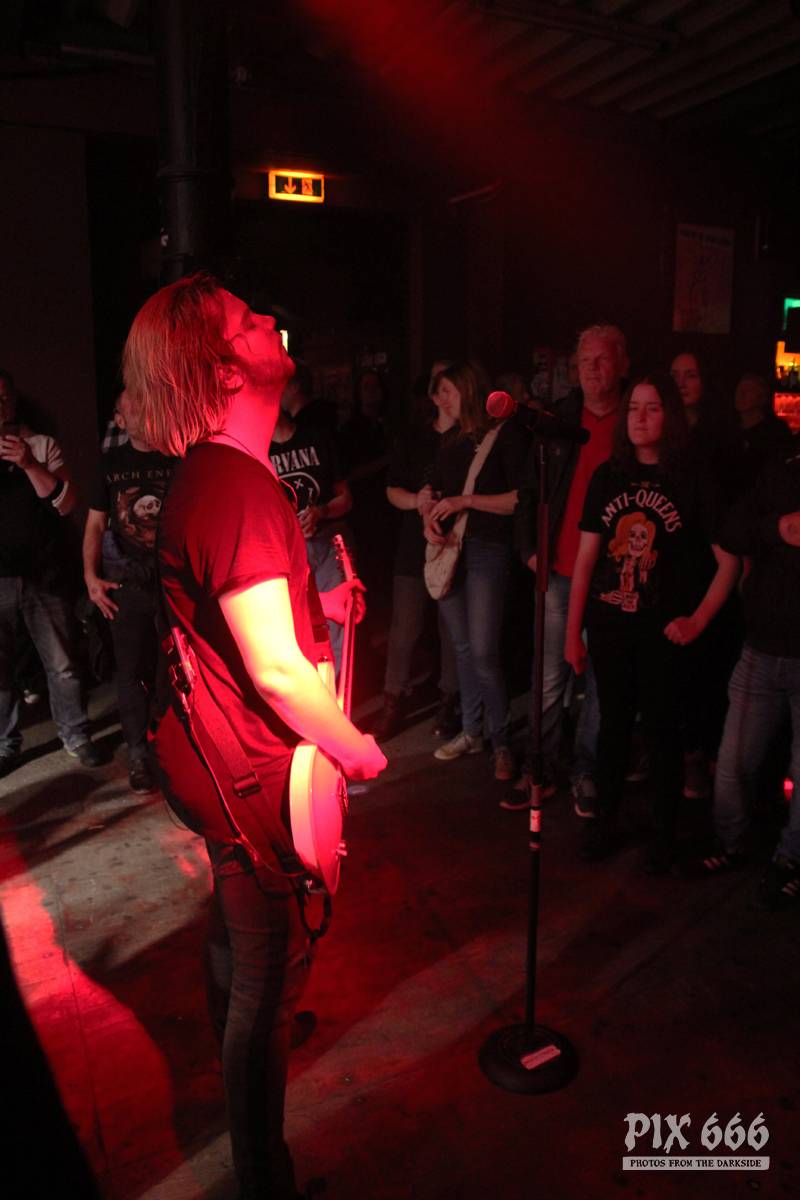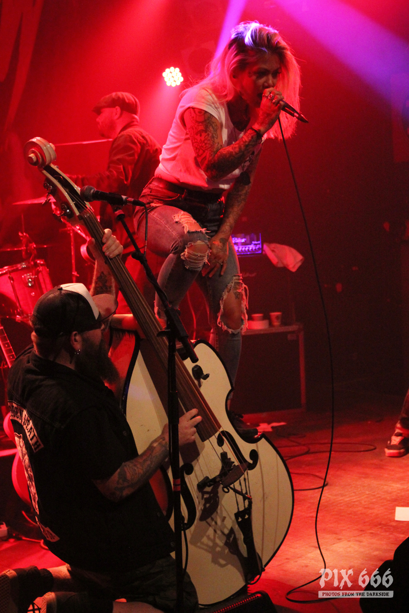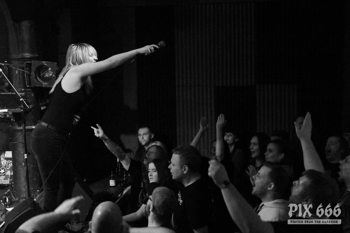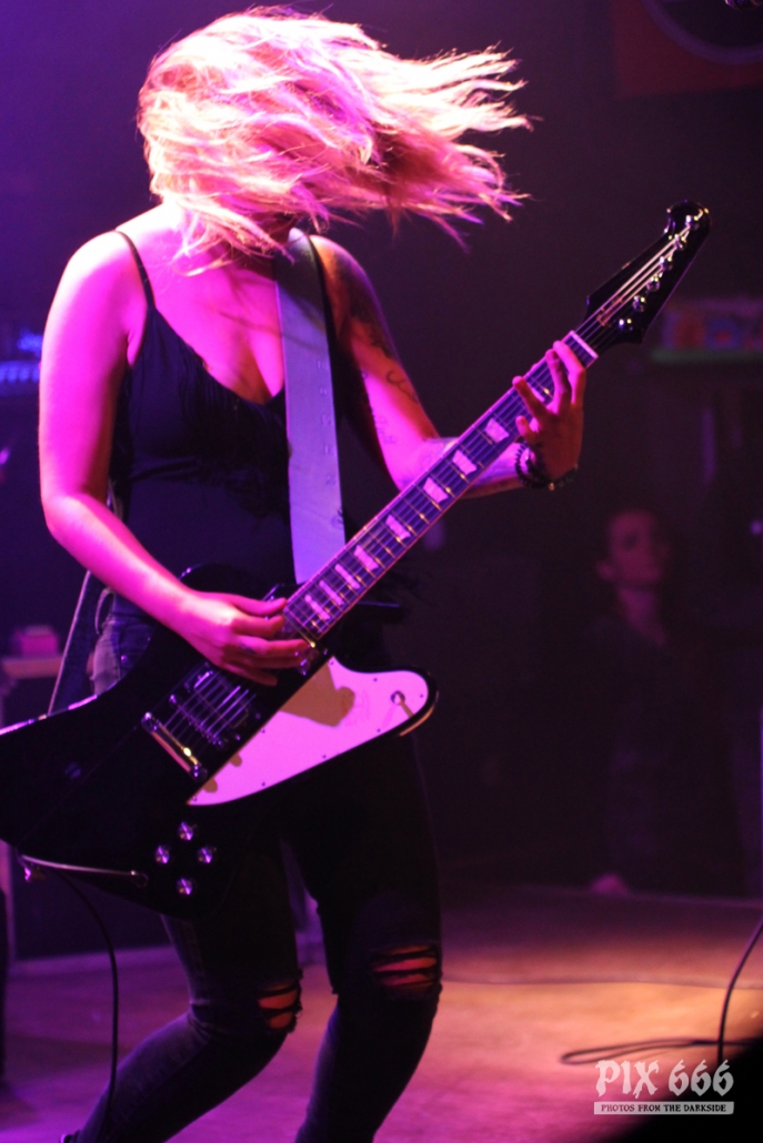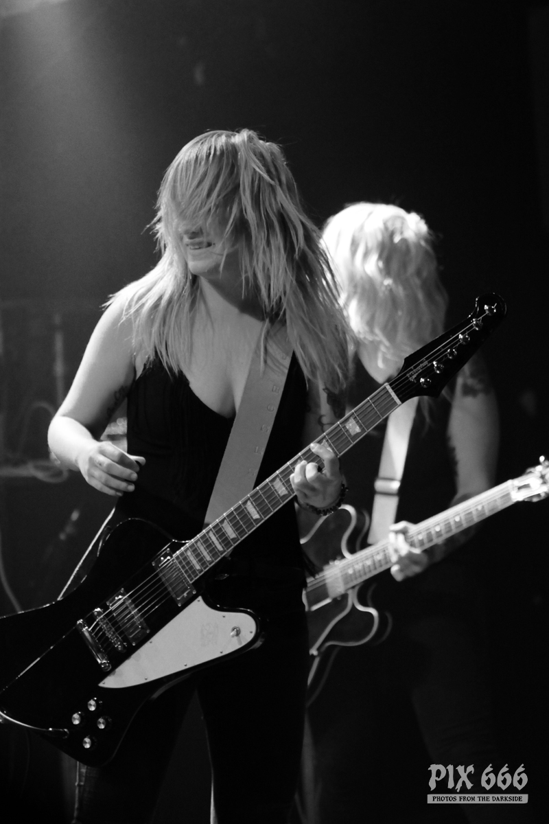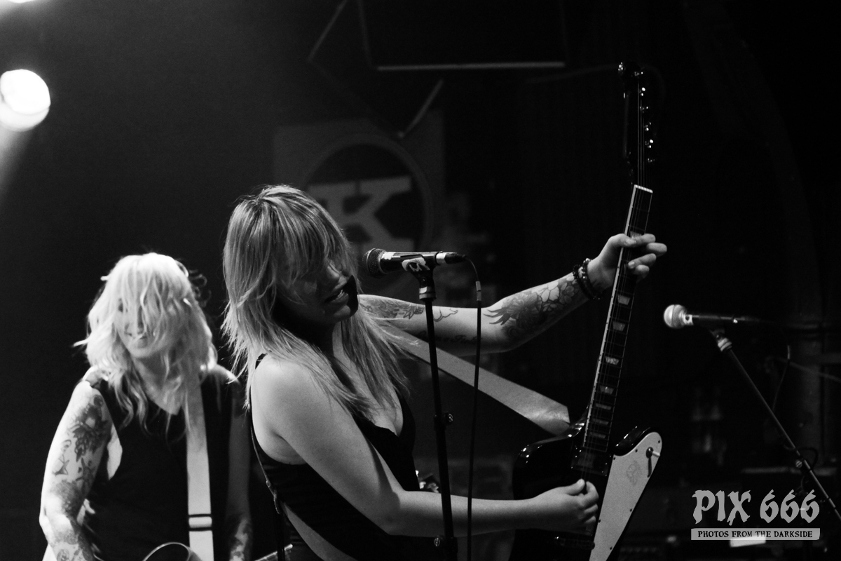 Jetzt war richtig Partystimmung und sogar ‚Happy Birthday‘ wurde angestimmt – Alex, ein Fan im Publikum hatte Geburtstag. Die Band sagte, es ist ihr ‚Lieblingsdeutscher‘. Volle Energie gab es dann bei ‚Grave Diggers‘ – auf und vor der Bühne. Es war reichlich Abwechselung geboten, bei einem Song tauschte Kenda ihre rote E-Gitarre gegen eine schwarze Akustik Gitarre, dann gab es einen Song, den sie schon lange nicht mehr gespielt hatten und einen Song, den die Männer alleine performten – kurze Pause für Sängerin Kenda. Bei ‚Death At My Door‘ sagte ‚Sickboy‘: „Hamburg, ich kann euch nicht hören.“ Und sofort waren die Fans wieder voll da. Bei ‚Shake‘ drehte Kenda eine Runde durchs Publikum. „Wir brauchen jetzt eure Hilfe – alle die Hände in die Luft – und zwar so…“ Und dann ging bei ‚Sticks and Stones‘ die Post so richtig ab, die Hamburger waren nun nicht mehr zu halten. „Könnt ihr mit uns singen? – Wollt ihr mit uns singen?“ ‚Ohhooohooo ooooo see you in hell‘ schallte es dann aus hunderten Kehlen – total cool „Lauter! Komm los, Hamburg“.