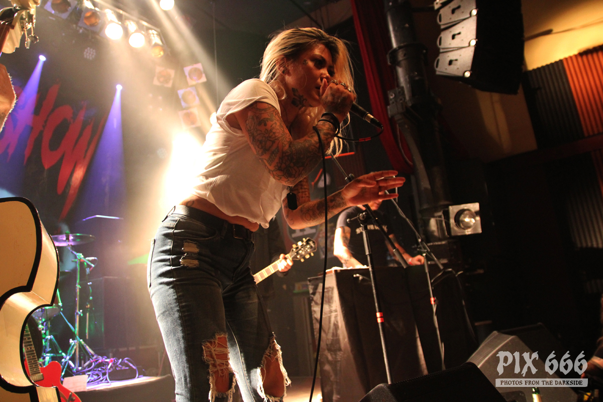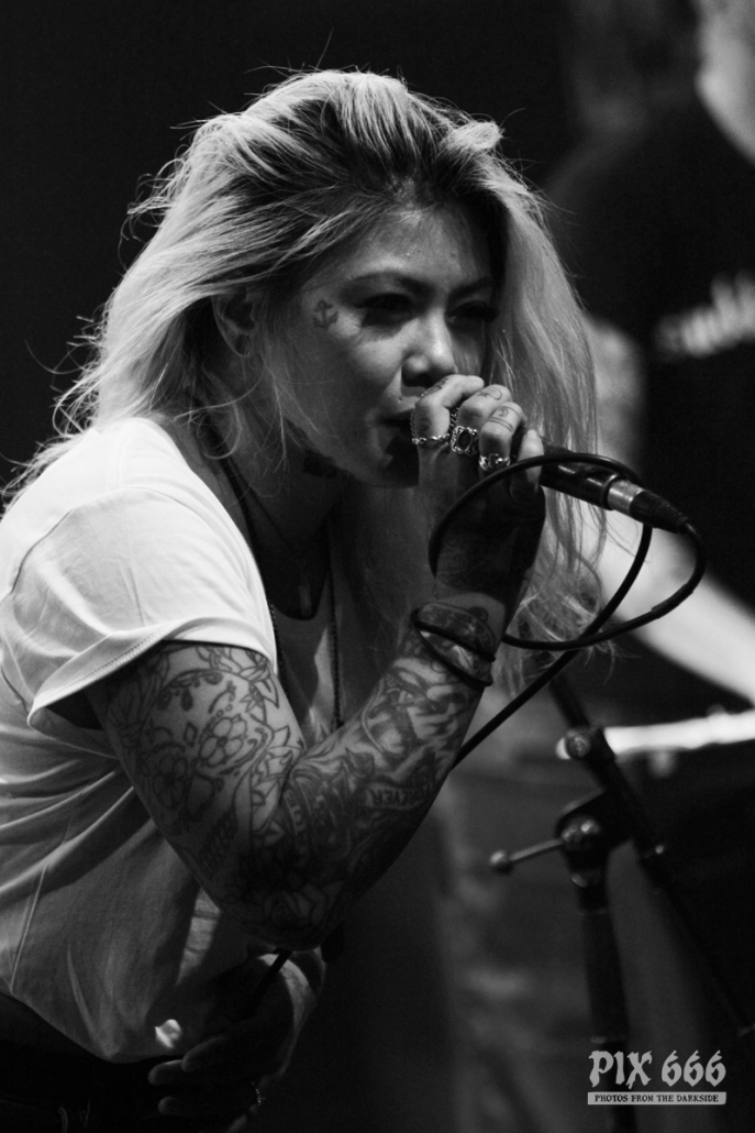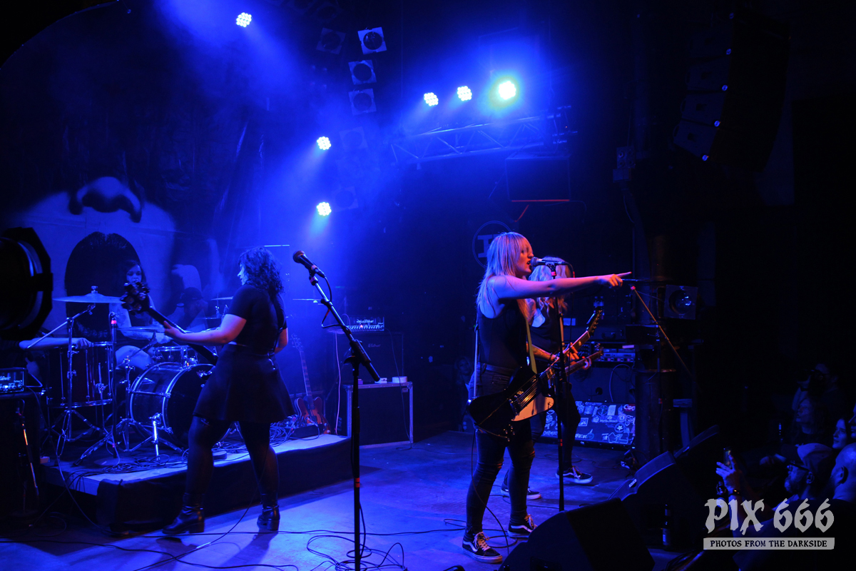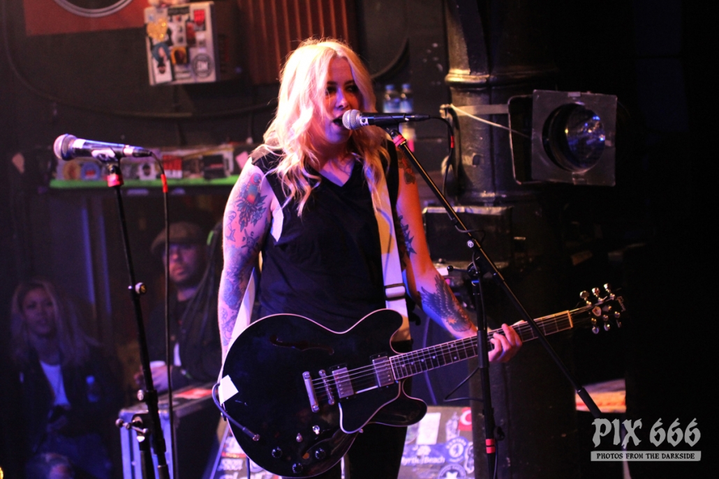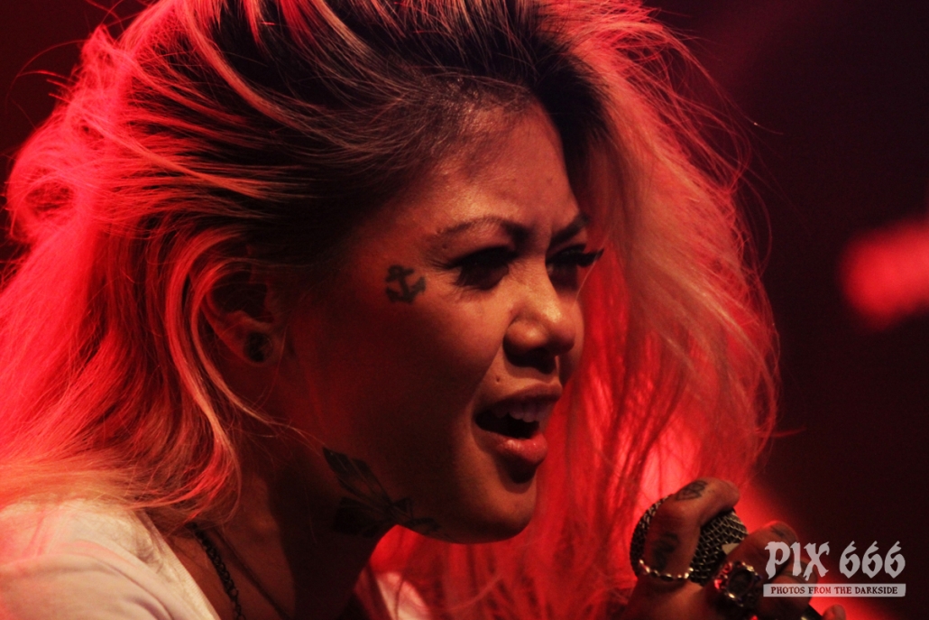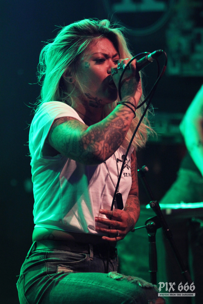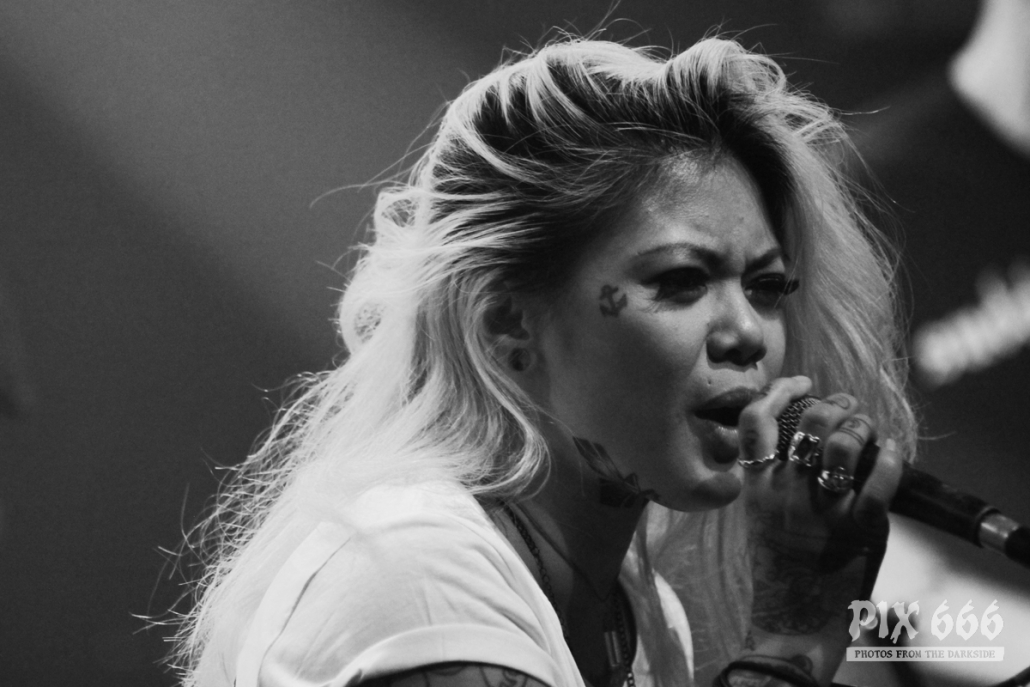 Jetzt war richtig Partystimmung und sogar ‚Happy Birthday‘ wurde angestimmt – Alex, ein Fan im Publikum hatte Geburtstag. Die Band sagte, es ist ihr ‚Lieblingsdeutscher‘. Volle Energie gab es dann bei ‚Grave Diggers‘ – auf und vor der Bühne. Es war reichlich Abwechselung geboten, bei einem Song tauschte Kenda ihre rote E-Gitarre gegen eine schwarze Akustik Gitarre, dann gab es einen Song, den sie schon lange nicht mehr gespielt hatten und einen Song, den die Männer alleine performten – kurze Pause für Sängerin Kenda. Bei ‚Death At My Door‘ sagte ‚Sickboy‘: „Hamburg, ich kann euch nicht hören.“ Und sofort waren die Fans wieder voll da. Bei ‚Shake‘ drehte Kenda eine Runde durchs Publikum. „Wir brauchen jetzt eure Hilfe – alle die Hände in die Luft – und zwar so…“ Und dann ging bei ‚Sticks and Stones‘ die Post so richtig ab, die Hamburger waren nun nicht mehr zu halten. „Könnt ihr mit uns singen? – Wollt ihr mit uns singen?“ ‚Ohhooohooo ooooo see you in hell‘ schallte es dann aus hunderten Kehlen – total cool „Lauter! Komm los, Hamburg“.