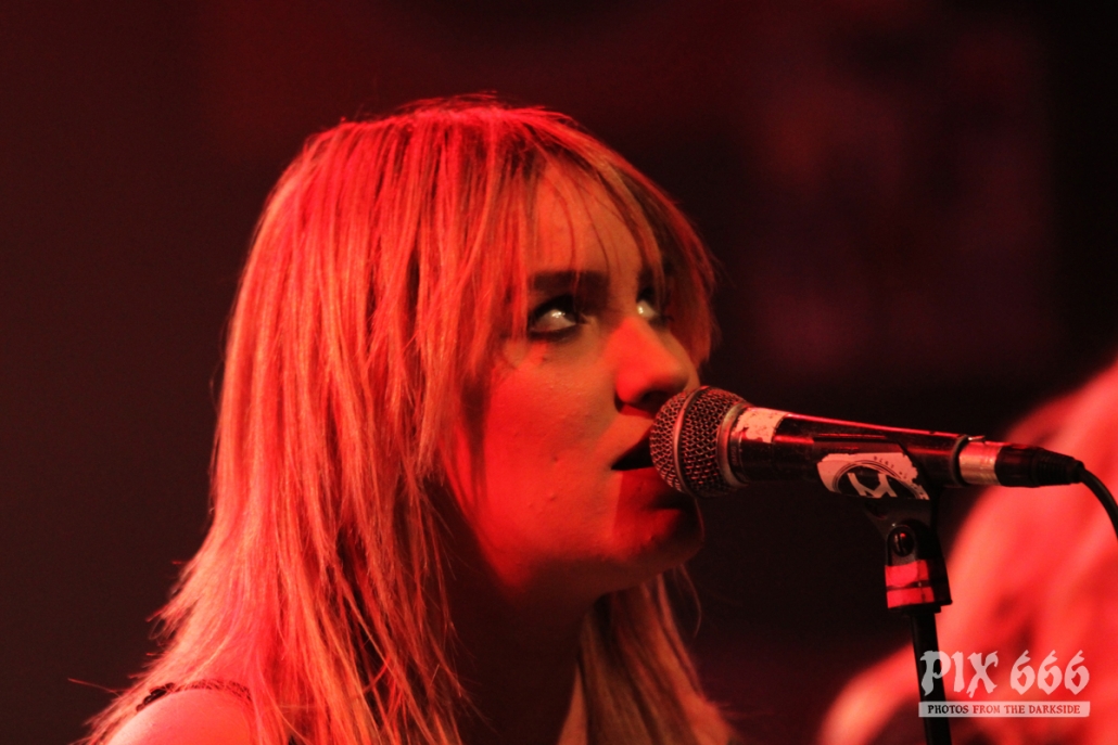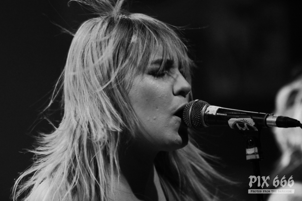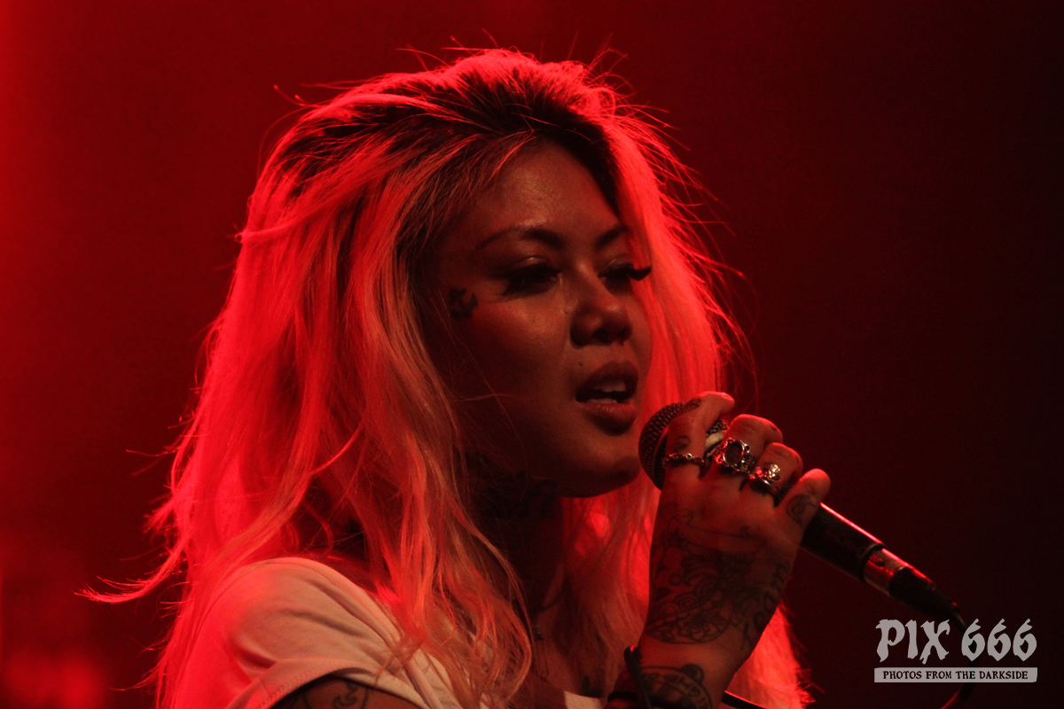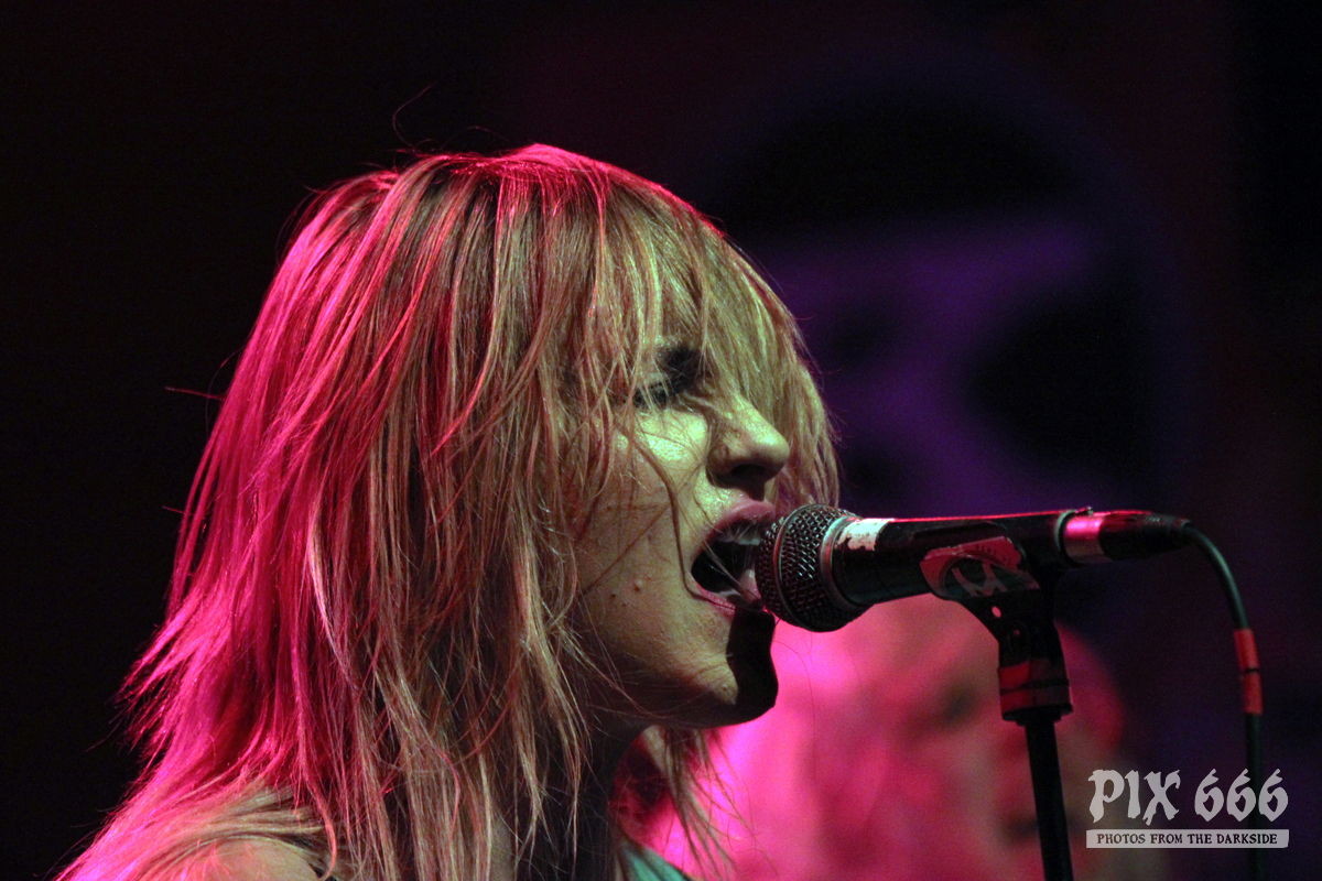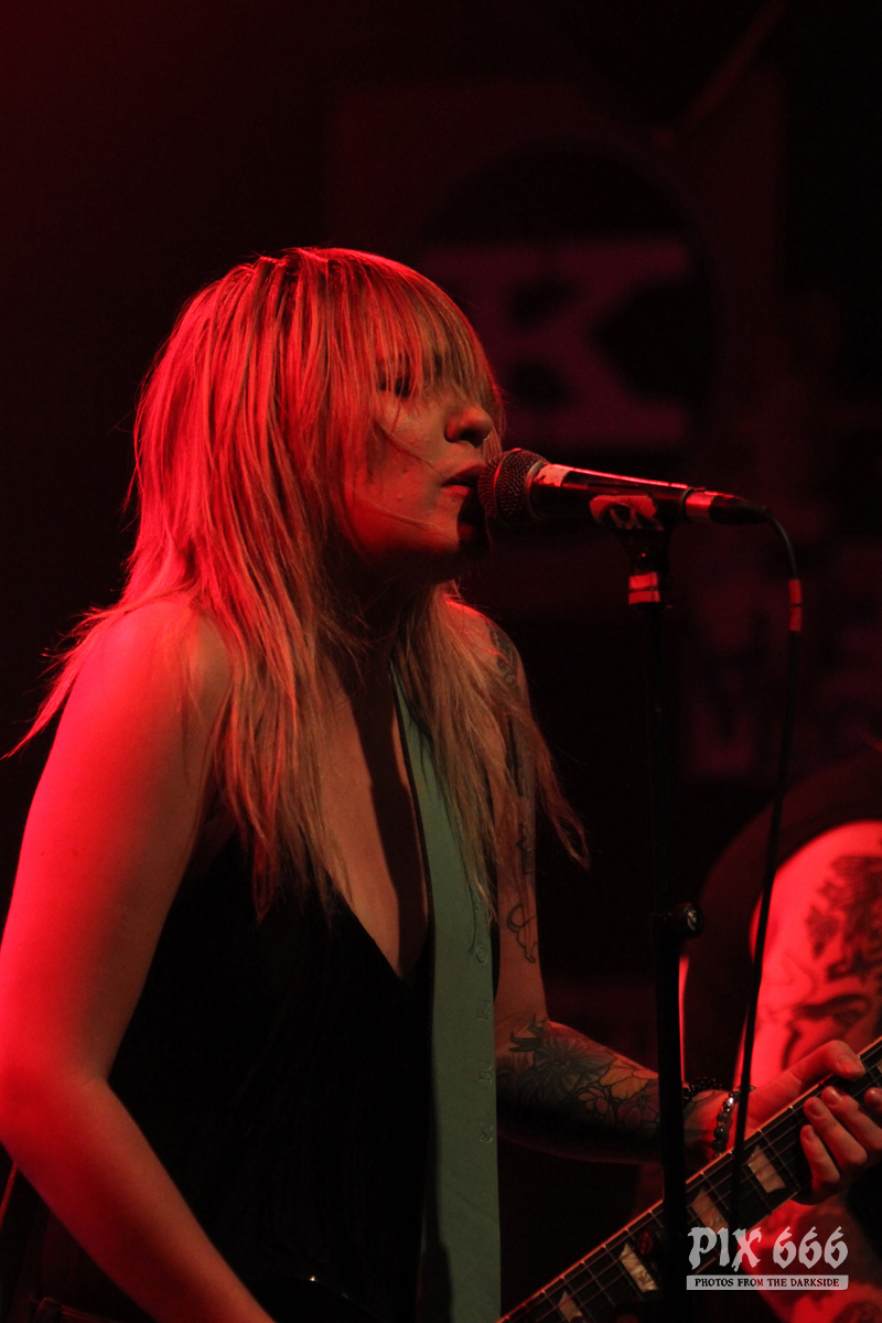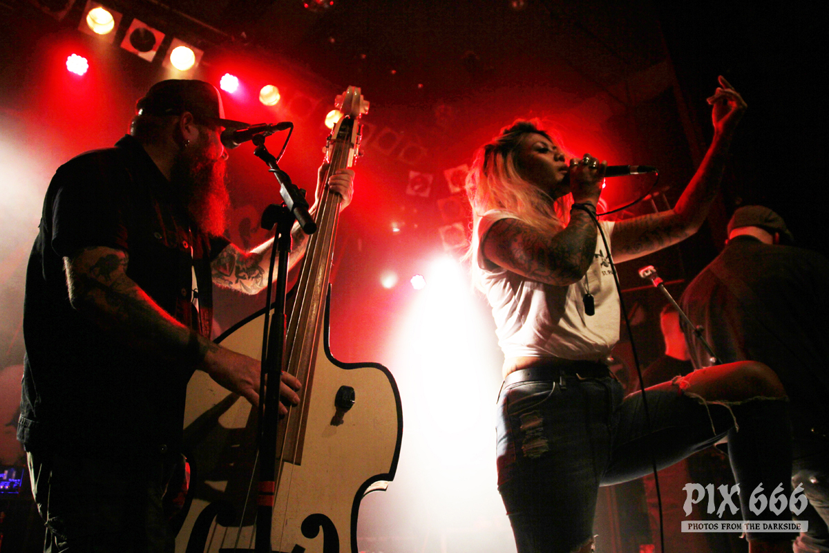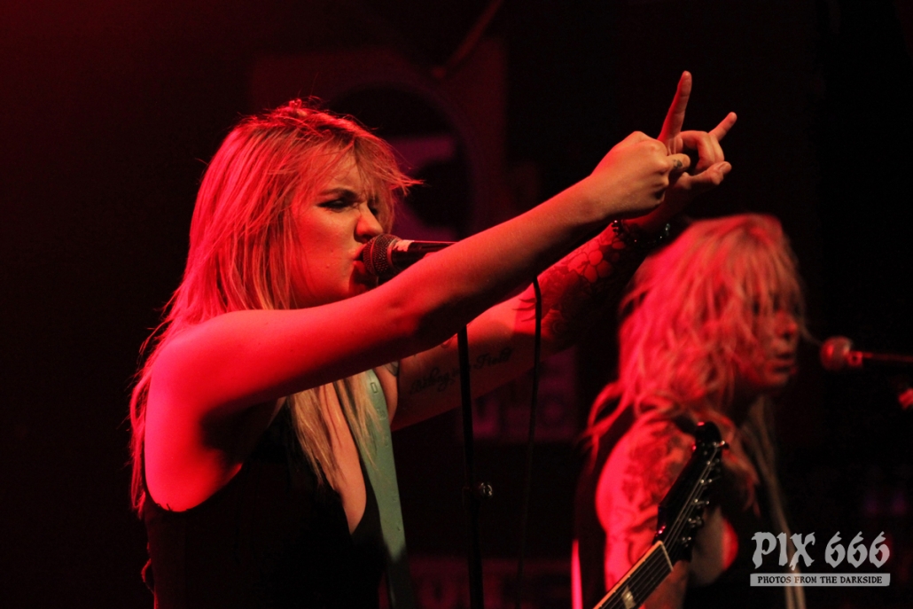 Jetzt war richtig Partystimmung und sogar ‚Happy Birthday‘ wurde angestimmt – Alex, ein Fan im Publikum hatte Geburtstag. Die Band sagte, es ist ihr ‚Lieblingsdeutscher‘. Volle Energie gab es dann bei ‚Grave Diggers‘ – auf und vor der Bühne. Es war reichlich Abwechselung geboten, bei einem Song tauschte Kenda ihre rote E-Gitarre gegen eine schwarze Akustik Gitarre, dann gab es einen Song, den sie schon lange nicht mehr gespielt hatten und einen Song, den die Männer alleine performten – kurze Pause für Sängerin Kenda. Bei ‚Death At My Door‘ sagte ‚Sickboy‘: „Hamburg, ich kann euch nicht hören.“ Und sofort waren die Fans wieder voll da. Bei ‚Shake‘ drehte Kenda eine Runde durchs Publikum. „Wir brauchen jetzt eure Hilfe – alle die Hände in die Luft – und zwar so…“ Und dann ging bei ‚Sticks and Stones‘ die Post so richtig ab, die Hamburger waren nun nicht mehr zu halten. „Könnt ihr mit uns singen? – Wollt ihr mit uns singen?“ ‚Ohhooohooo ooooo see you in hell‘ schallte es dann aus hunderten Kehlen – total cool „Lauter! Komm los, Hamburg“.
