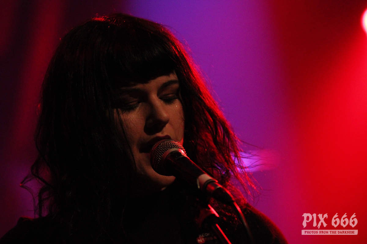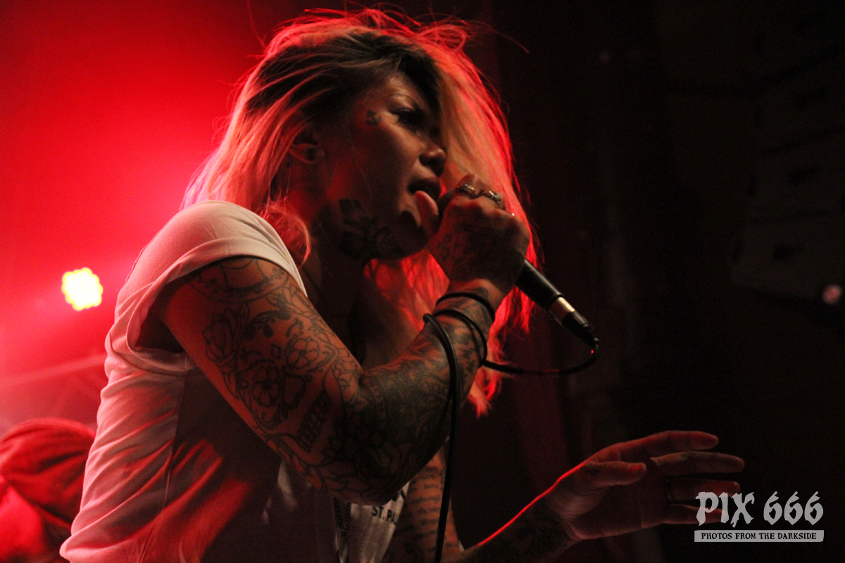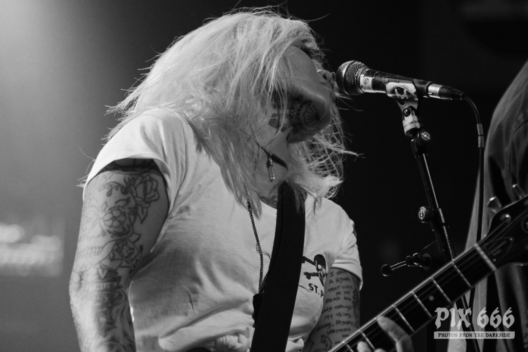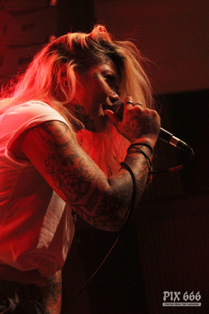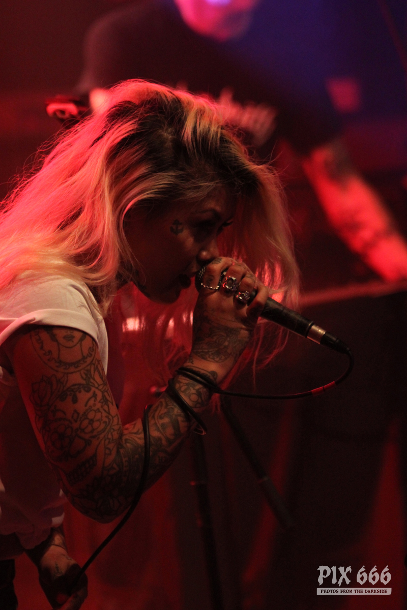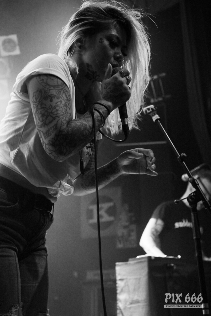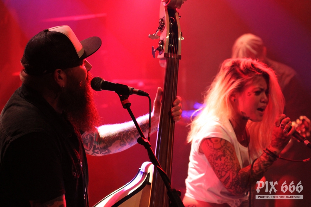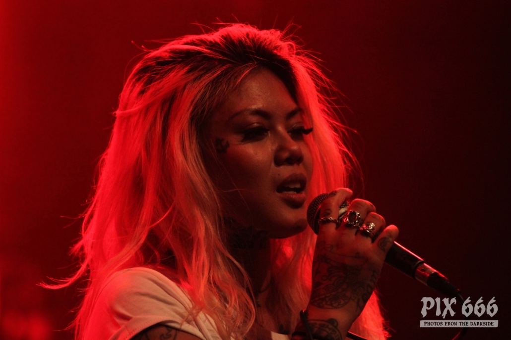 Jetzt war richtig Partystimmung und sogar ‚Happy Birthday‘ wurde angestimmt – Alex, ein Fan im Publikum hatte Geburtstag. Die Band sagte, es ist ihr ‚Lieblingsdeutscher‘. Volle Energie gab es dann bei ‚Grave Diggers‘ – auf und vor der Bühne. Es war reichlich Abwechselung geboten, bei einem Song tauschte Kenda ihre rote E-Gitarre gegen eine schwarze Akustik Gitarre, dann gab es einen Song, den sie schon lange nicht mehr gespielt hatten und einen Song, den die Männer alleine performten – kurze Pause für Sängerin Kenda. Bei ‚Death At My Door‘ sagte ‚Sickboy‘: „Hamburg, ich kann euch nicht hören.“ Und sofort waren die Fans wieder voll da. Bei ‚Shake‘ drehte Kenda eine Runde durchs Publikum. „Wir brauchen jetzt eure Hilfe – alle die Hände in die Luft – und zwar so…“ Und dann ging bei ‚Sticks and Stones‘ die Post so richtig ab, die Hamburger waren nun nicht mehr zu halten. „Könnt ihr mit uns singen? – Wollt ihr mit uns singen?“ ‚Ohhooohooo ooooo see you in hell‘ schallte es dann aus hunderten Kehlen – total cool „Lauter! Komm los, Hamburg“.