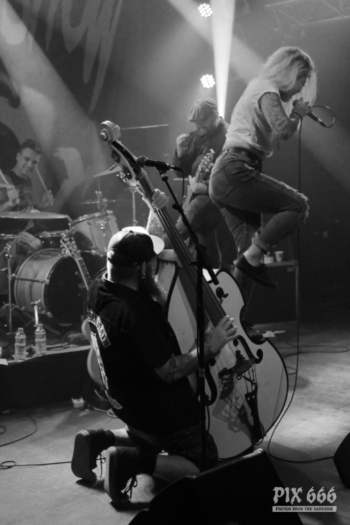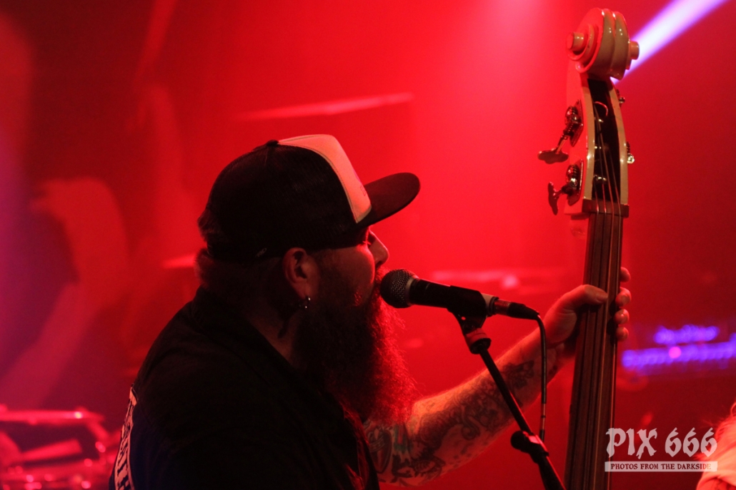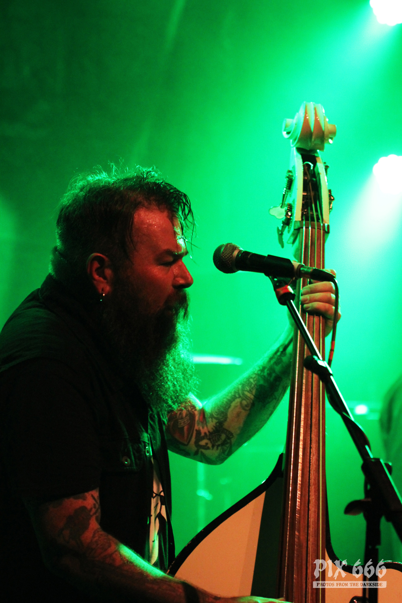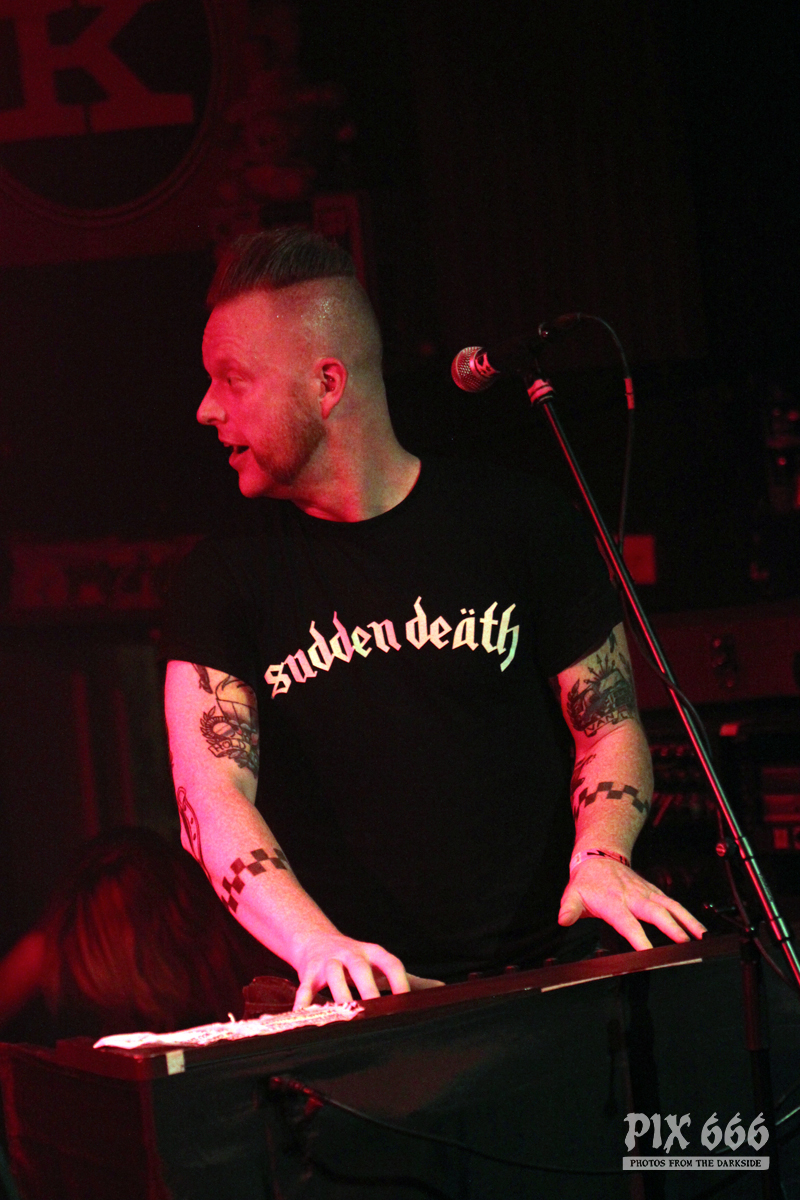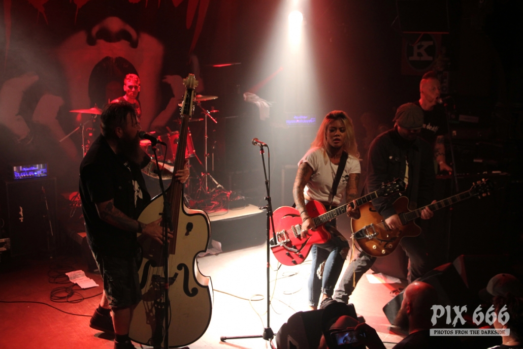 Die Bühne im Knust ist wirklich nicht sehr breit – wir waren schon vorher gespannt, wie das vom Platz her mit Keyboard und Kontrabass so aussehen wird. Wieder ging alles sehr schnell mit dem Changeover. Bereits um 22.40 Uhr ertönte das Intro und die Headliner des Abends betraten die Bühne. Die Fans standen nun bei The Creepshow endlich dicht gedrängt vor der Bühne – so gehört sich das bei einem Konzert. Es ging mit ‚Rue Morgue‘ sofort rasant los auf der Psychobilly-Autobahn. Nach ‚Run for your Life‘ sagte Sean ‚Sickboy‘ tatsächlich auf Deutsch: „Heilige Scheiße“ und das tat er, weil er vom Hamburger Publikum begeistert war – die kühlen Norddeutschen wurden sofort warm mit The Creepshow und hatten bis zum Schluss mega Spaß. Ja ja, die Kanadischen Jungs können scheinbar alle etwas Deutsch – Keyboarder ‚Mc Ginty‘ mit seinem schicken ‚Sudden Deäth‘ Shirt hatte sogar ein „Moin Hamburg“ im Repertoire.
