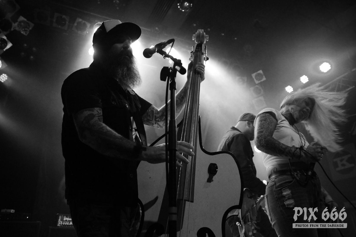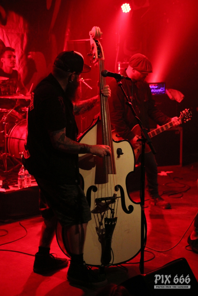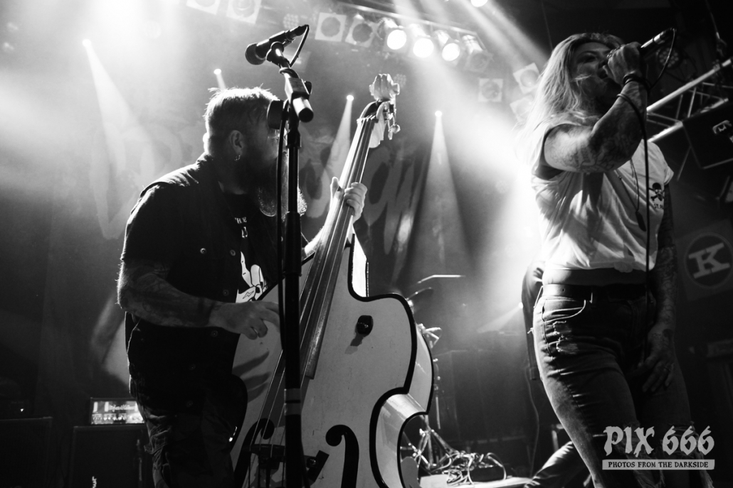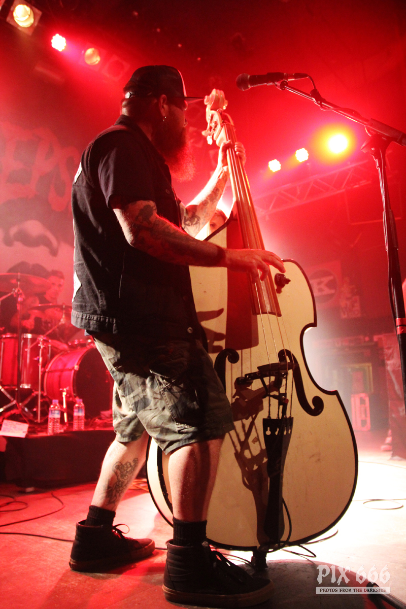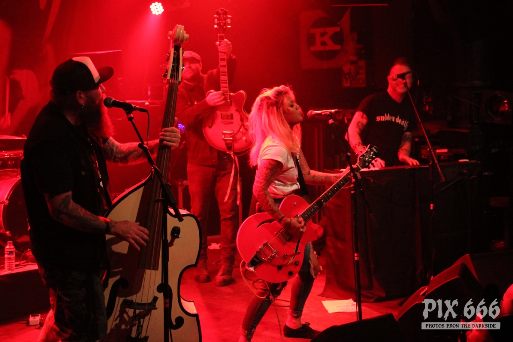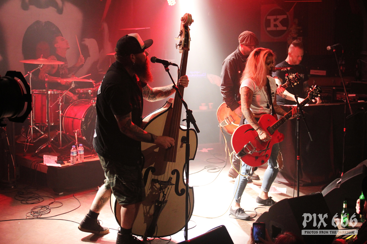 Die Bühne im Knust ist wirklich nicht sehr breit – wir waren schon vorher gespannt, wie das vom Platz her mit Keyboard und Kontrabass so aussehen wird. Wieder ging alles sehr schnell mit dem Changeover. Bereits um 22.40 Uhr ertönte das Intro und die Headliner des Abends betraten die Bühne. Die Fans standen nun bei The Creepshow endlich dicht gedrängt vor der Bühne – so gehört sich das bei einem Konzert. Es ging mit ‚Rue Morgue‘ sofort rasant los auf der Psychobilly-Autobahn. Nach ‚Run for your Life‘ sagte Sean ‚Sickboy‘ tatsächlich auf Deutsch: „Heilige Scheiße“ und das tat er, weil er vom Hamburger Publikum begeistert war – die kühlen Norddeutschen wurden sofort warm mit The Creepshow und hatten bis zum Schluss mega Spaß. Ja ja, die Kanadischen Jungs können scheinbar alle etwas Deutsch – Keyboarder ‚Mc Ginty‘ mit seinem schicken ‚Sudden Deäth‘ Shirt hatte sogar ein „Moin Hamburg“ im Repertoire.