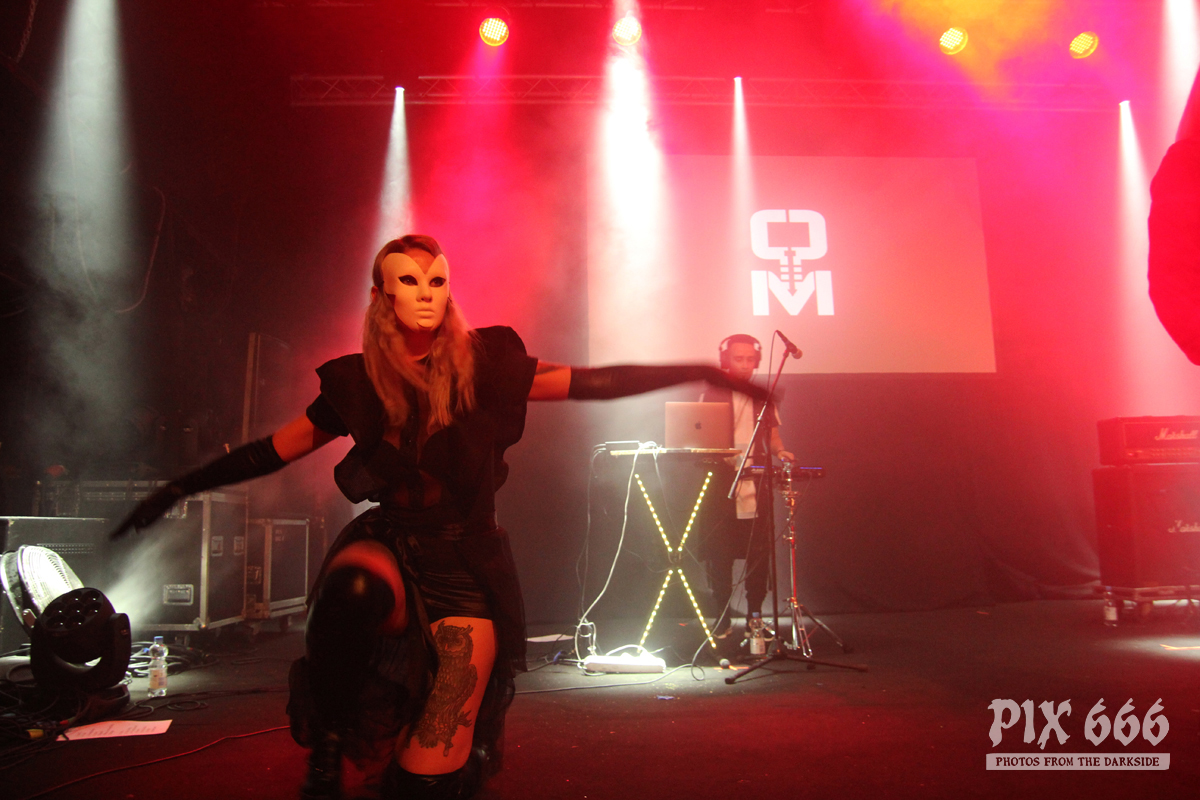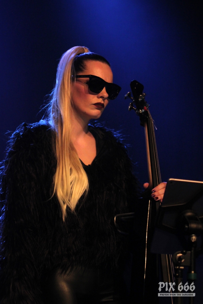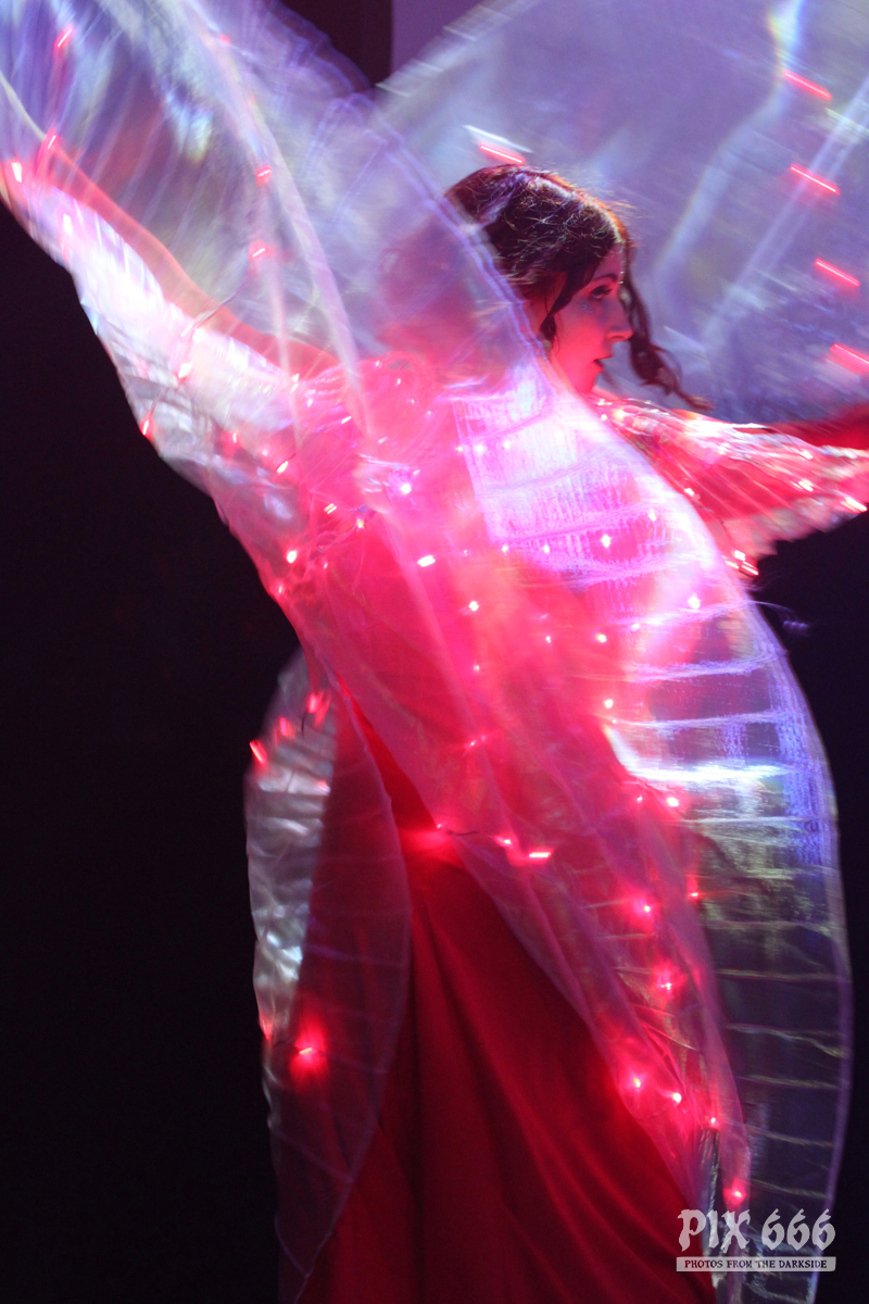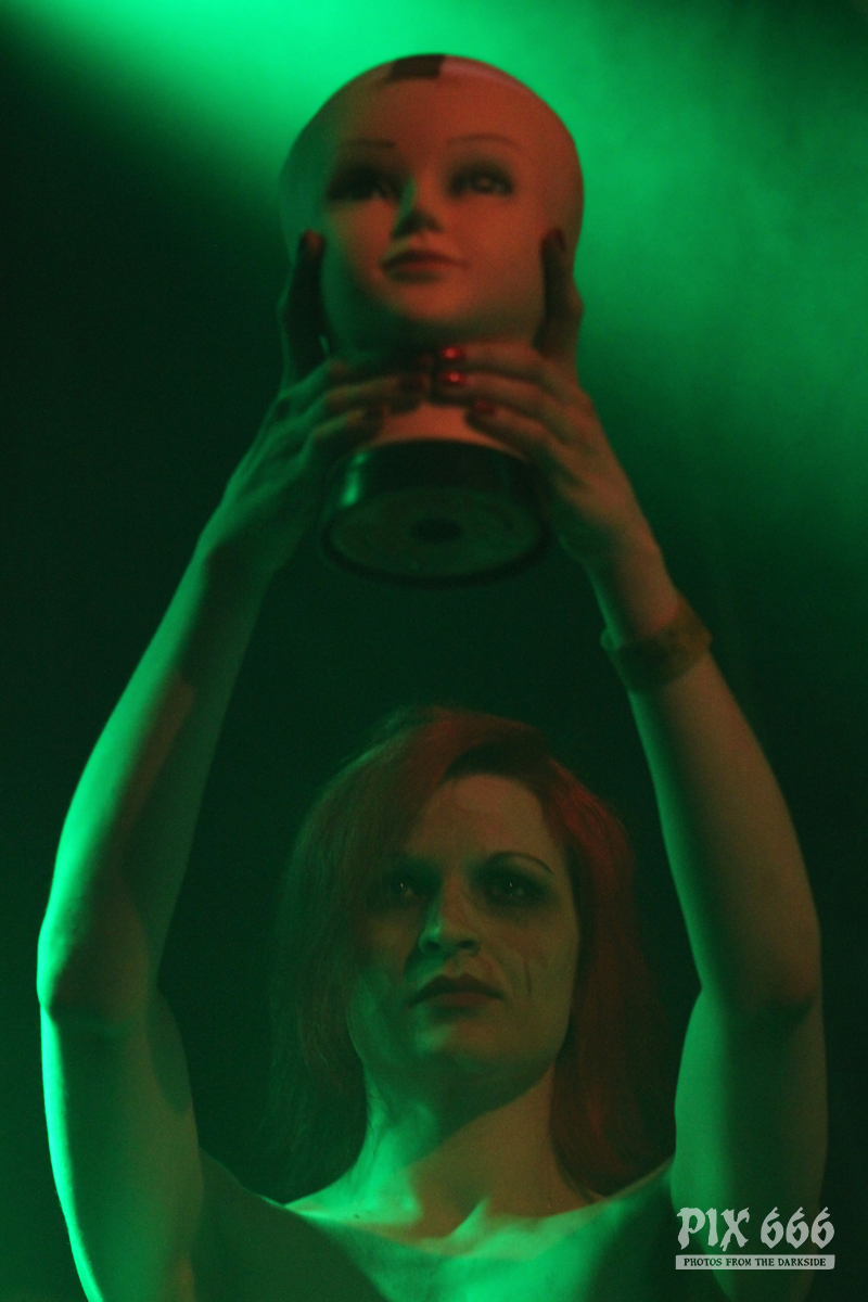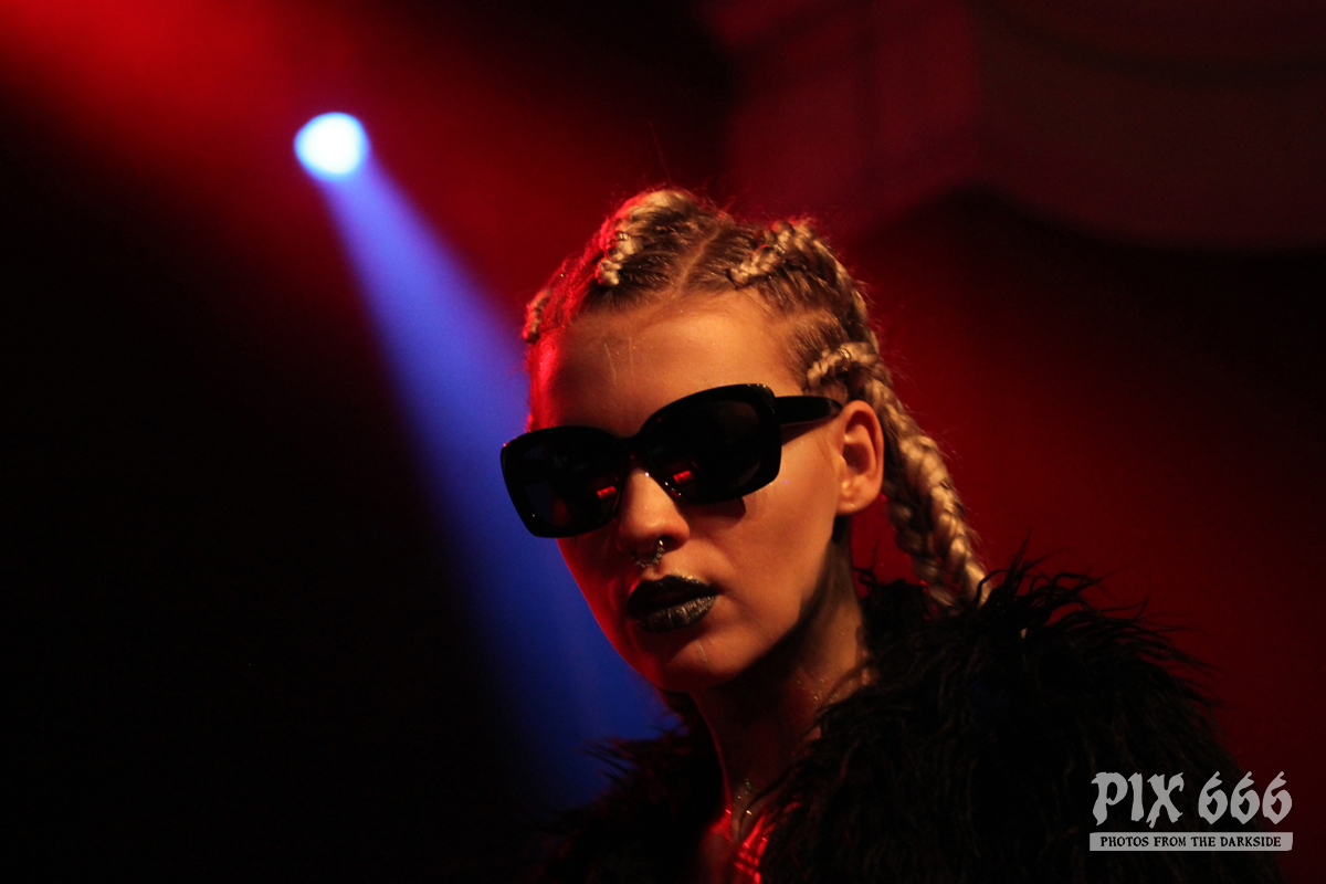 Im Felsenkeller war es jetzt fast so heiss wie in einer Sauna. Aber das war nicht der Grund dafür, warum die Damen halbnackt auf der Bühne standen. Die 2009 gegründete Band Grausame Töchter ist inzwischen für ihre extravaganten Bühnenshows bekannt. Außerdem werden während der Konzerte von der Band selbst produzierte Filme auf der Videoleinwand angezeigt – doch heute beim Auftritt auf dem Wave Gotik Treffen war die Videoleinwand defekt. „Mal sehen, ob wir das noch hinbekommen -sonst müsst ihr zu einem unserer anderen Konzerte kommen“ sagte Sängerin Aranea Peel.