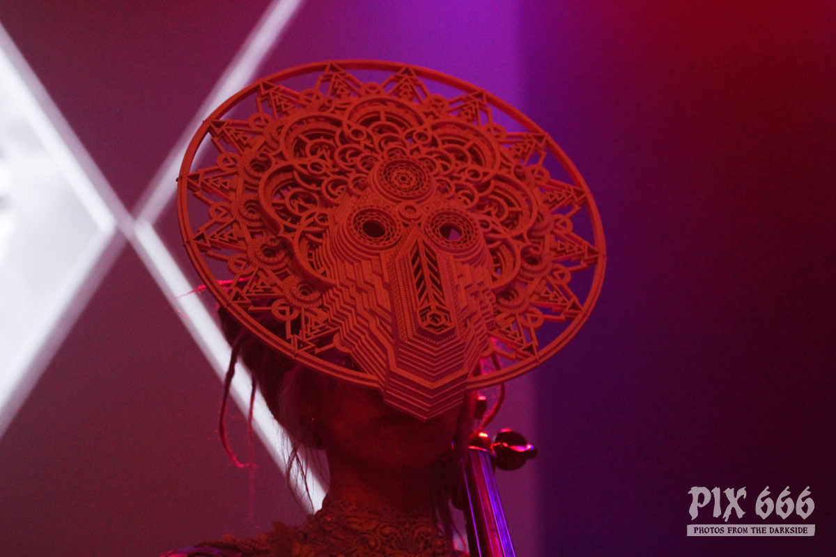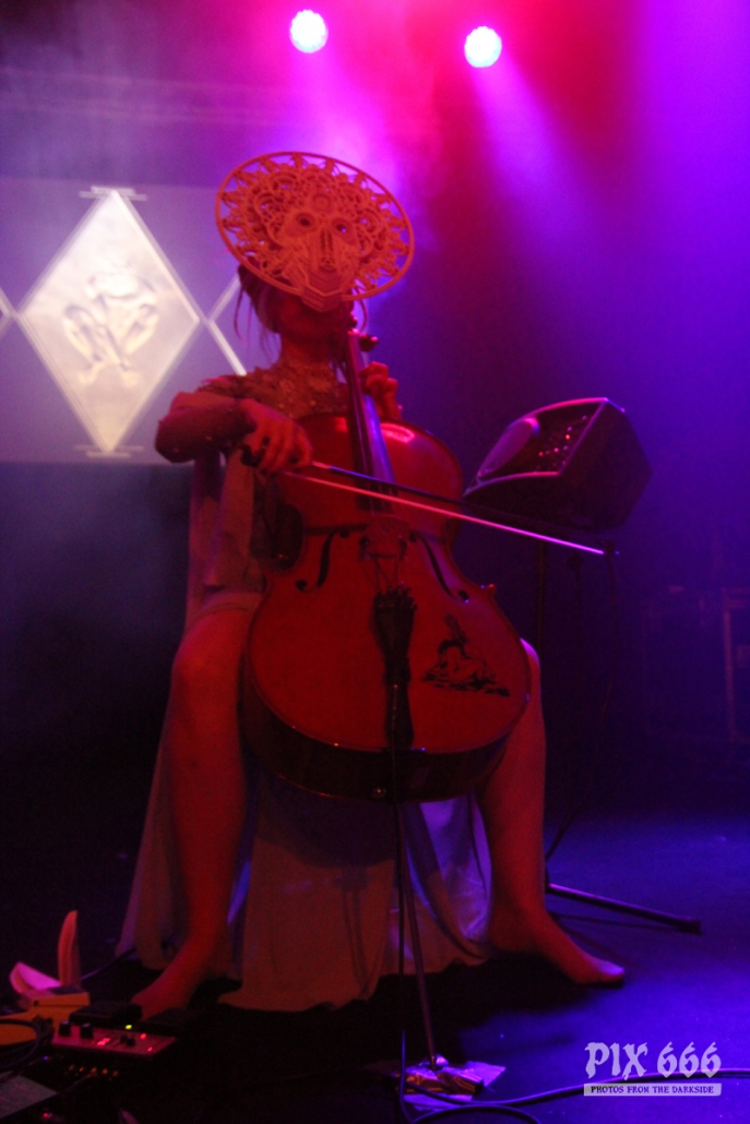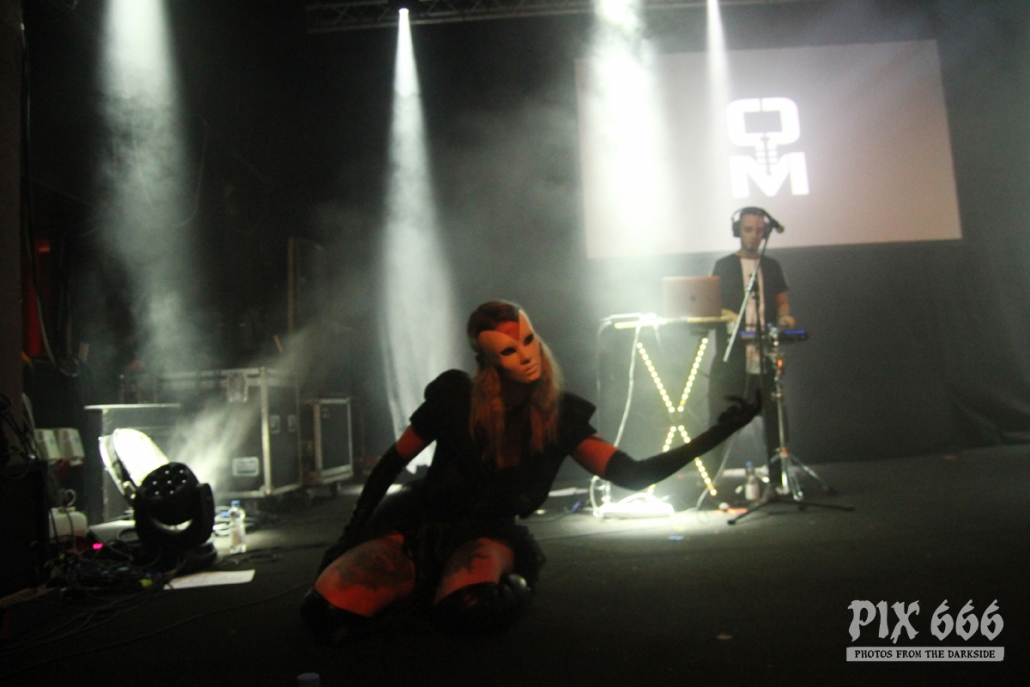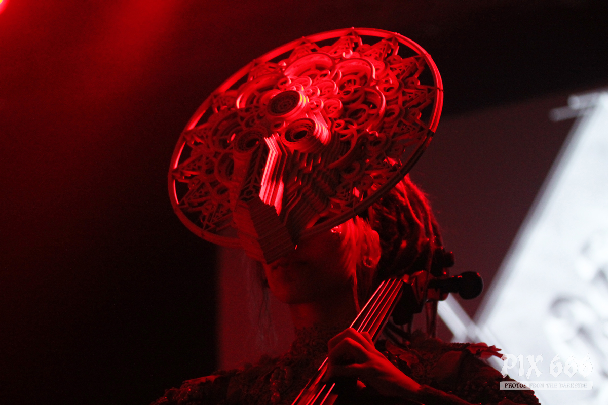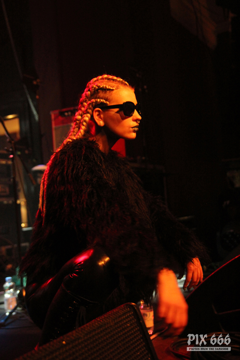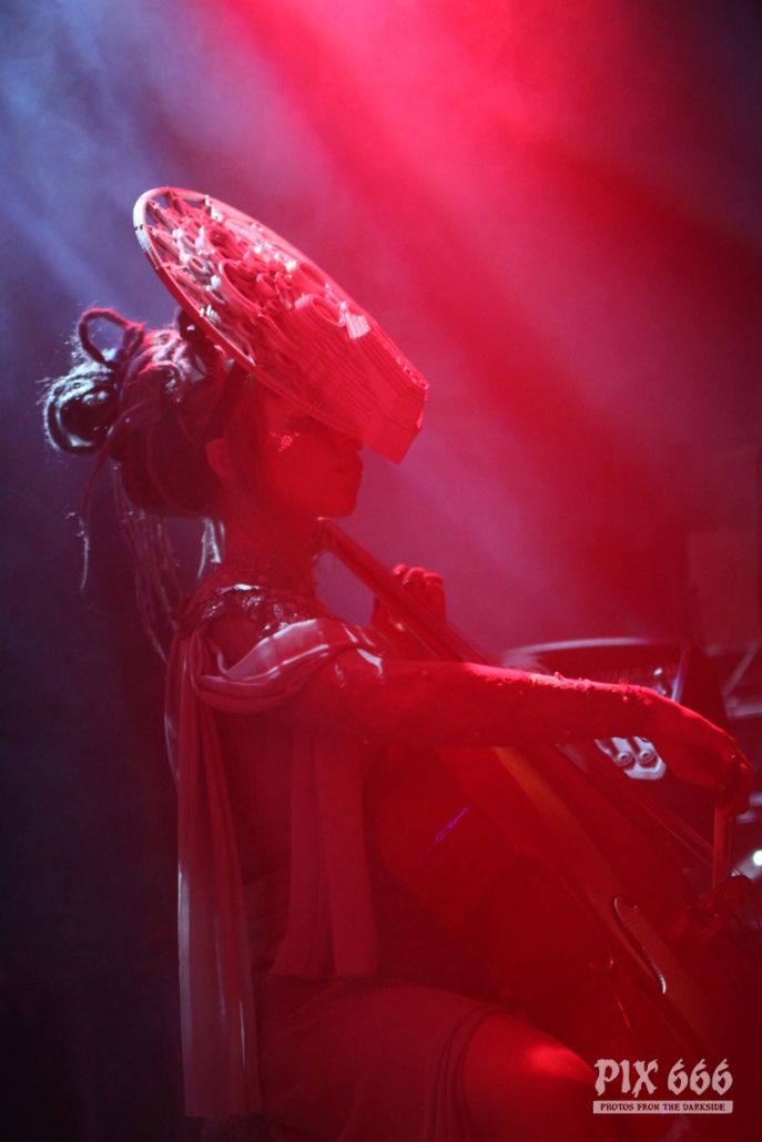 Im Felsenkeller war es jetzt fast so heiss wie in einer Sauna. Aber das war nicht der Grund dafür, warum die Damen halbnackt auf der Bühne standen. Die 2009 gegründete Band Grausame Töchter ist inzwischen für ihre extravaganten Bühnenshows bekannt. Außerdem werden während der Konzerte von der Band selbst produzierte Filme auf der Videoleinwand angezeigt – doch heute beim Auftritt auf dem Wave Gotik Treffen war die Videoleinwand defekt. „Mal sehen, ob wir das noch hinbekommen -sonst müsst ihr zu einem unserer anderen Konzerte kommen“ sagte Sängerin Aranea Peel.