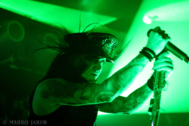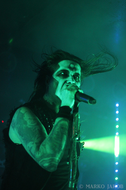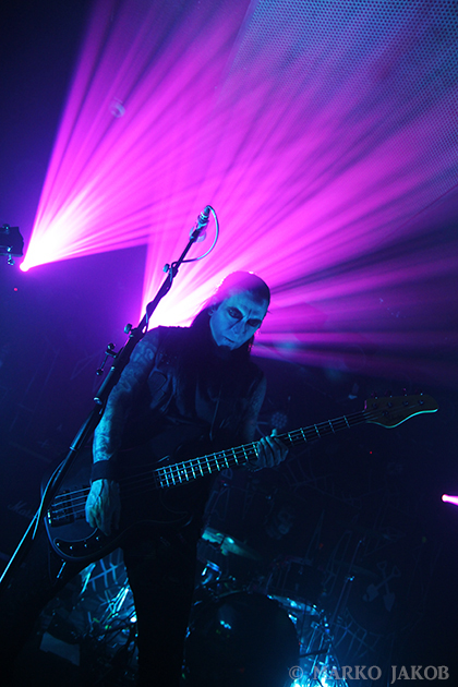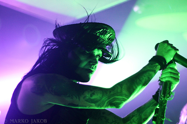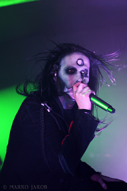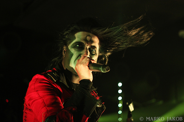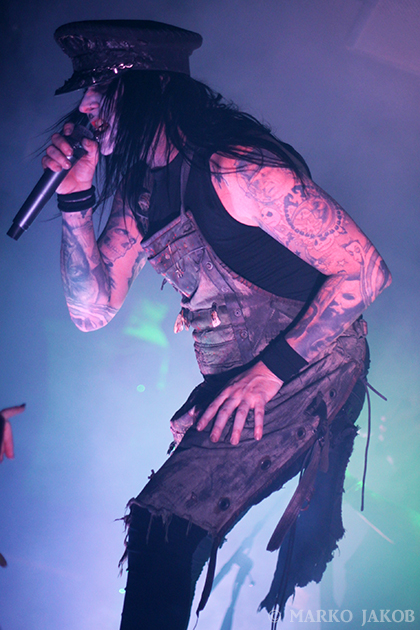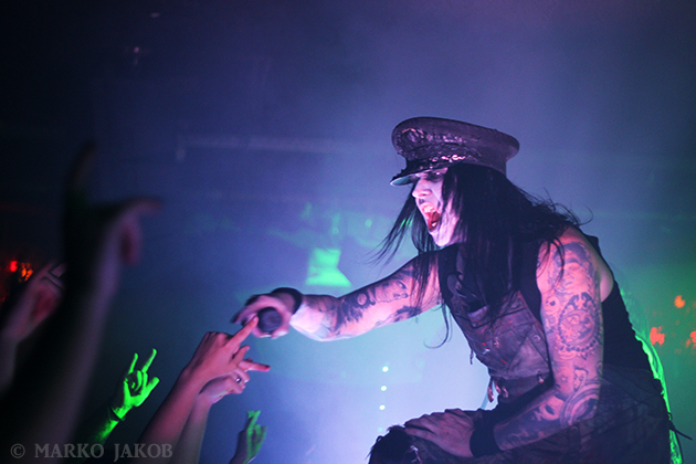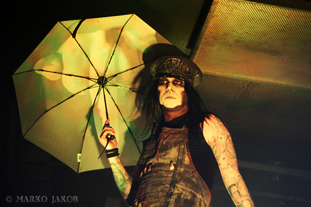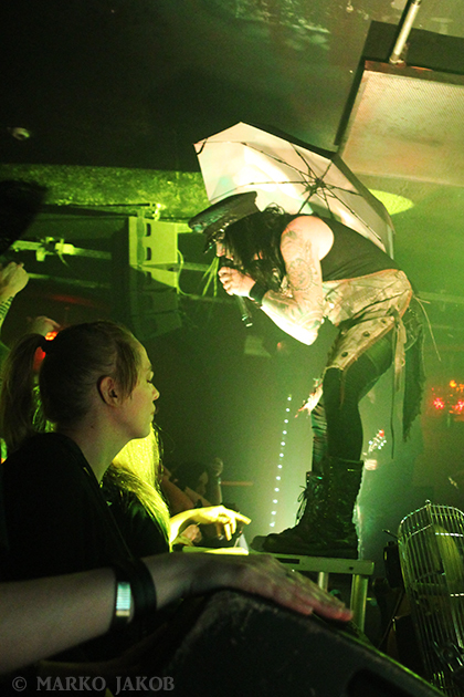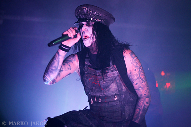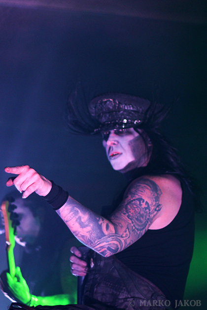 Club Bi Nuu in Berlin-Kreuzberg presented the backdrop for the concert of WEDNESDAY 13. The venue was not quite sold out, but for a Thursday, still many black-dressed horror fans gathered in front of stage. WEDNESDAY 13 showed once again that a live concert not only has to consist of music, but also how important the visual element is. Singer Joseph Poole appeared in no less than five different outfits! The concert started right away with the crashing song ‘What the Night Brings’ from the current album. It didn’t take long before the fans had started dancing and jumping and obviously having fun. The up-tempo title song from the album ‘Condolences’, which is already known as a video clip, was impressive.