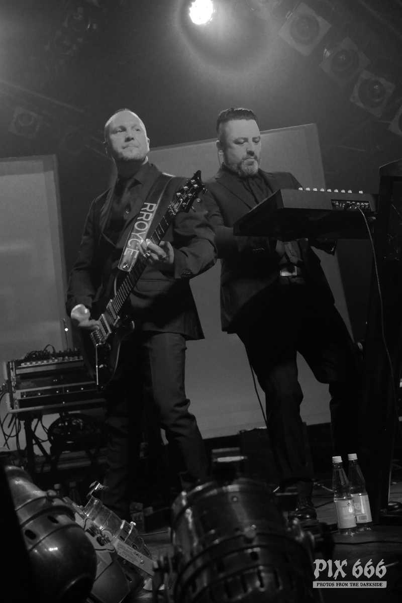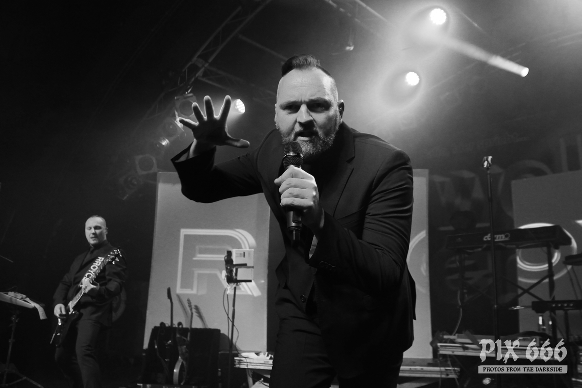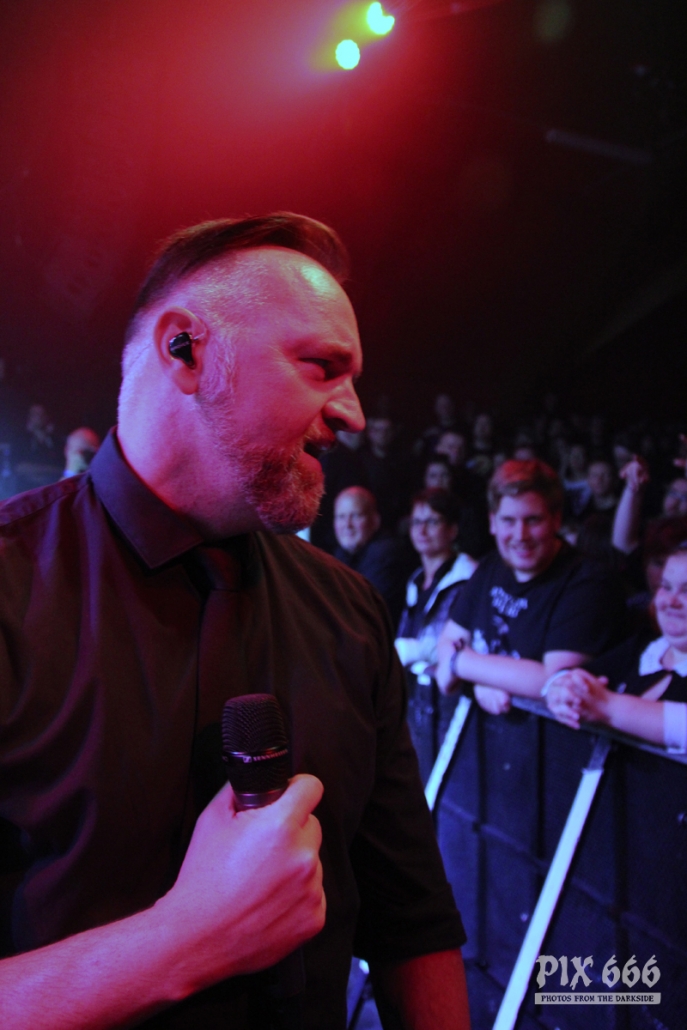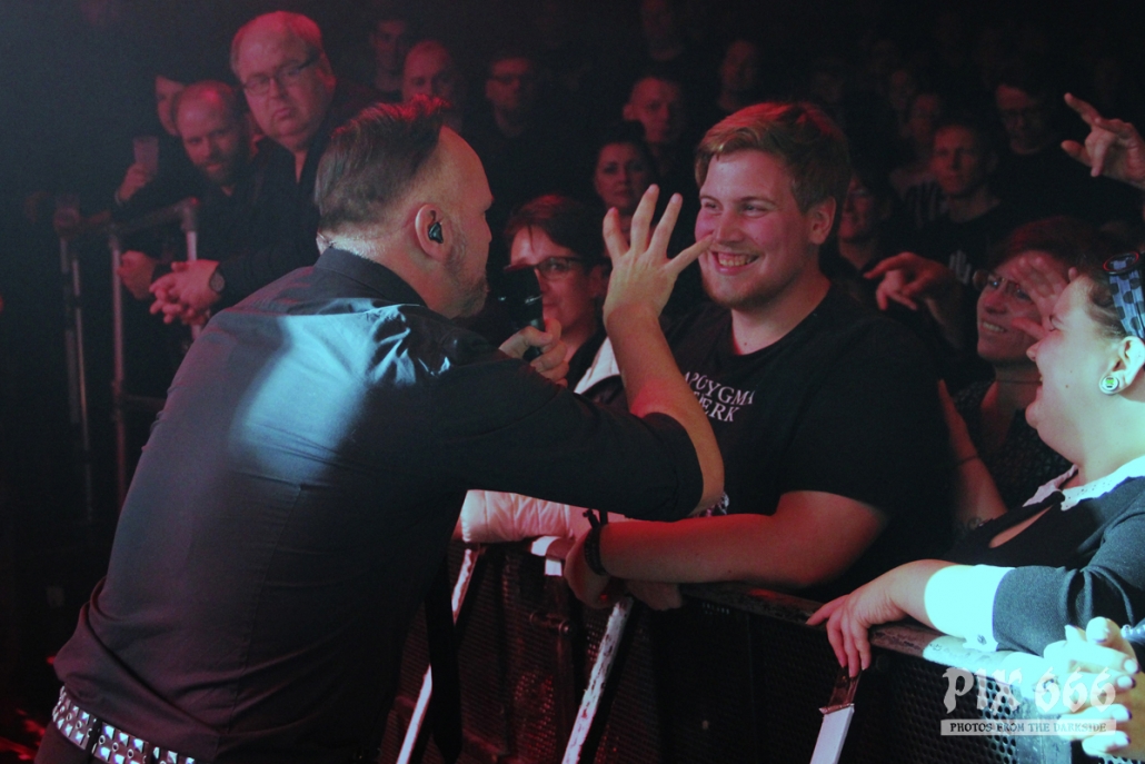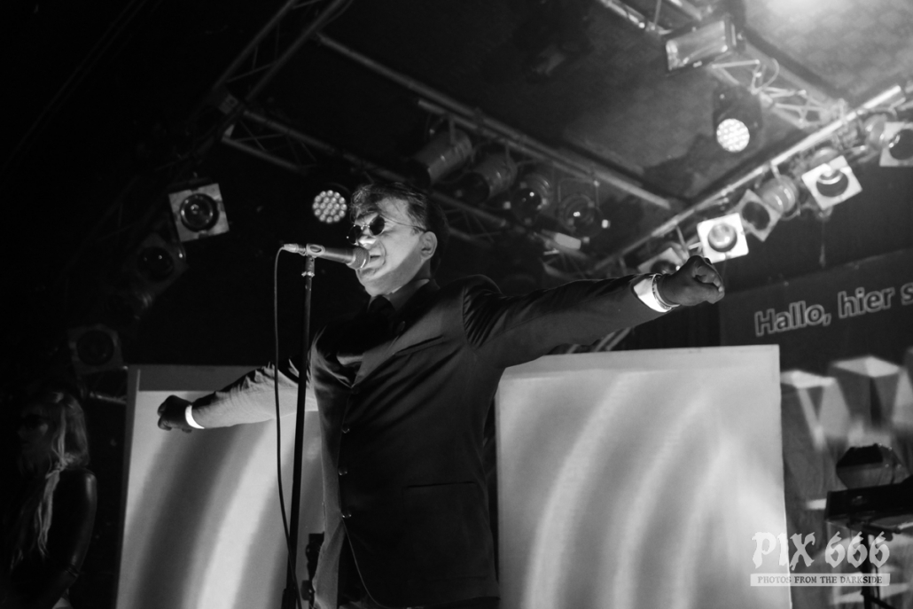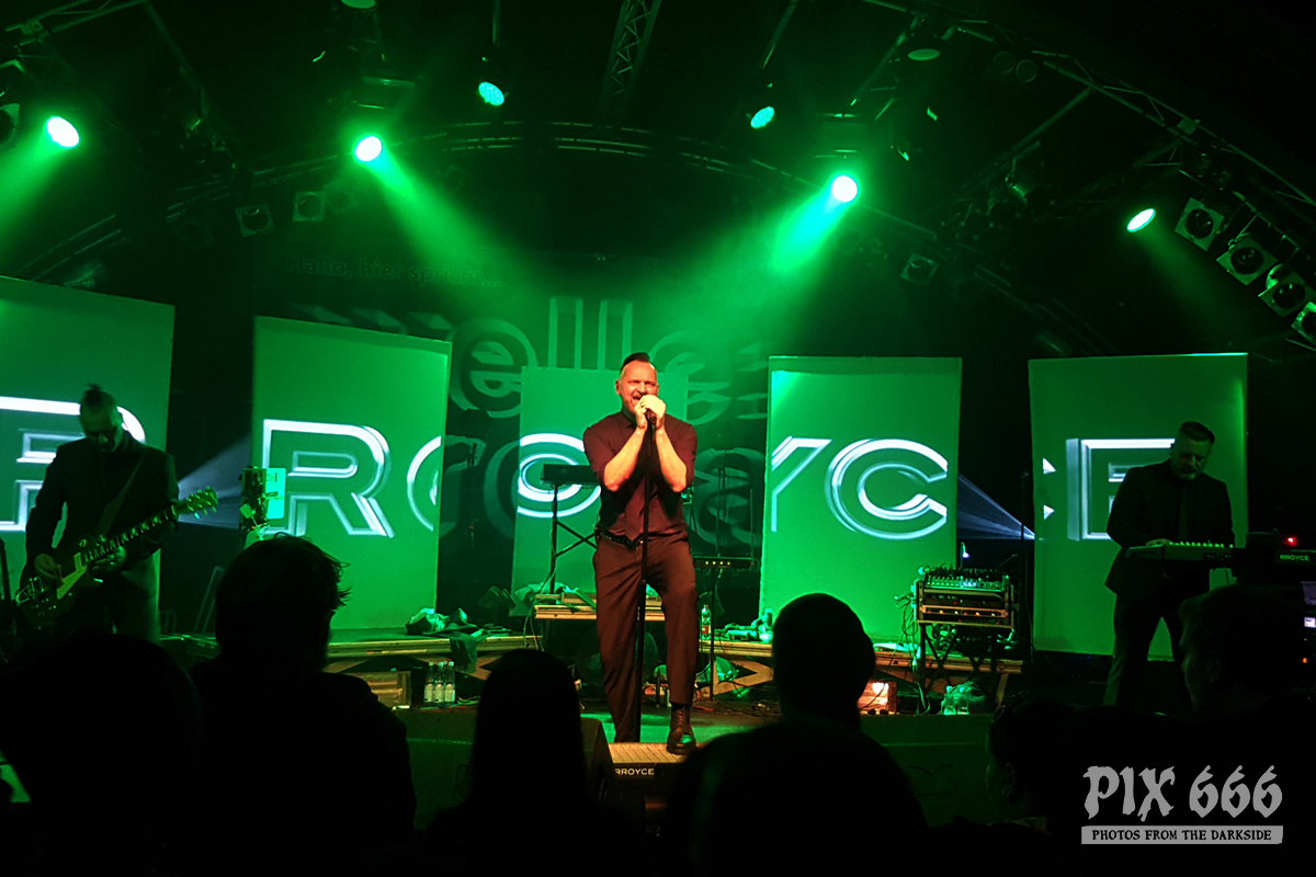„Wollen Sie wirklich noch eins?“ Einer, der in der ‚Sendung‘ auf der Welle:Erdball nicht fehlen darf: ‚Monoton & Minimal‘. Dann bat Honey die Fans am Ausgang auf einer Liste für den Tierschutz zu unterschreiben. „Die Platten sind ja bestimmt schon ausverkauft“ fügte er hinzu. Es schien nicht aufzuhören … es folgte der nächste Song – „Weil es richtig gut war mit Ihnen“. Das Fehlfarben Cover ‚Es geht voran‘ forderte nochmal alles von den Fans ab. Viele aus dem Publikum waren nun so richtig schön angeschwitzt für die ‚Return Of The Living Dead Party‘, die im Anschluss an das Konzert in der Markthalle stattfand. Nun stellte Honey dem Publikum seine Band incl. sich selbst vor: neben dem Sänger waren in Hamburg c0zmo (Synthesizer, Programmierung) und die weiblichen Stimmen von M.A. Peel und MissMoonlight mit dabei. Etwa 800 Leute feierten über drei Stunden lang ausgelassen, ehe Honey Casi, den Sänger von Rroyce zu sich rief. Und tatsächlich gab es noch eine ganz besondere Zugabe – Die Tourhymne ‚A New England‘, die Welle:Erdball und Rroyce gemeinsam performten.