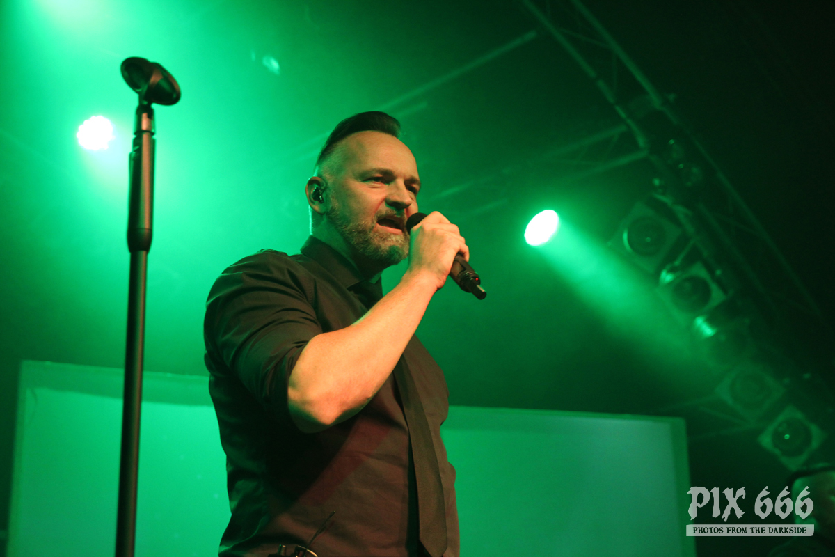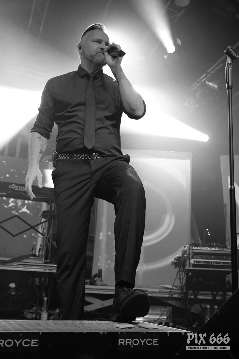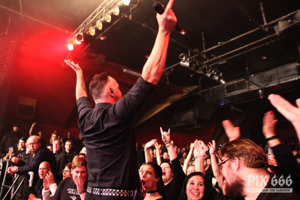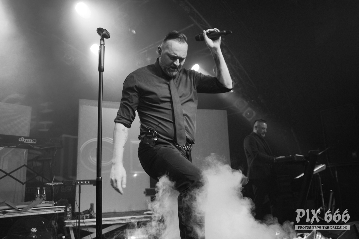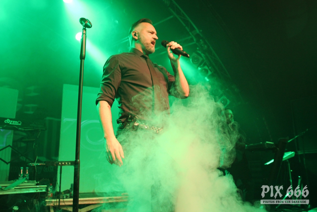 „Wollen Sie wirklich noch eins?“ Einer, der in der ‚Sendung‘ auf der Welle:Erdball nicht fehlen darf: ‚Monoton & Minimal‘. Dann bat Honey die Fans am Ausgang auf einer Liste für den Tierschutz zu unterschreiben. „Die Platten sind ja bestimmt schon ausverkauft“ fügte er hinzu. Es schien nicht aufzuhören … es folgte der nächste Song – „Weil es richtig gut war mit Ihnen“. Das Fehlfarben Cover ‚Es geht voran‘ forderte nochmal alles von den Fans ab. Viele aus dem Publikum waren nun so richtig schön angeschwitzt für die ‚Return Of The Living Dead Party‘, die im Anschluss an das Konzert in der Markthalle stattfand. Nun stellte Honey dem Publikum seine Band incl. sich selbst vor: neben dem Sänger waren in Hamburg c0zmo (Synthesizer, Programmierung) und die weiblichen Stimmen von M.A. Peel und MissMoonlight mit dabei. Etwa 800 Leute feierten über drei Stunden lang ausgelassen, ehe Honey Casi, den Sänger von Rroyce zu sich rief. Und tatsächlich gab es noch eine ganz besondere Zugabe – Die Tourhymne ‚A New England‘, die Welle:Erdball und Rroyce gemeinsam performten.