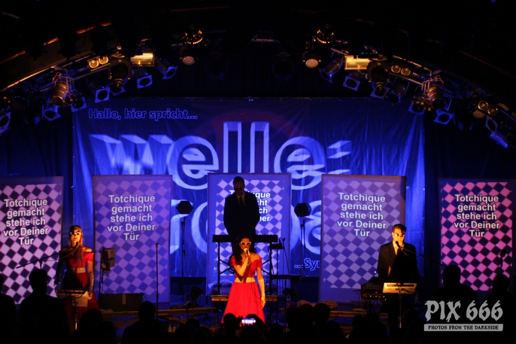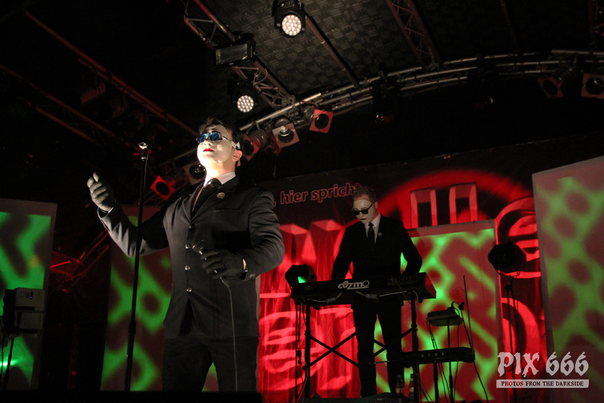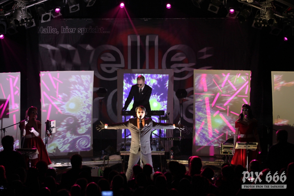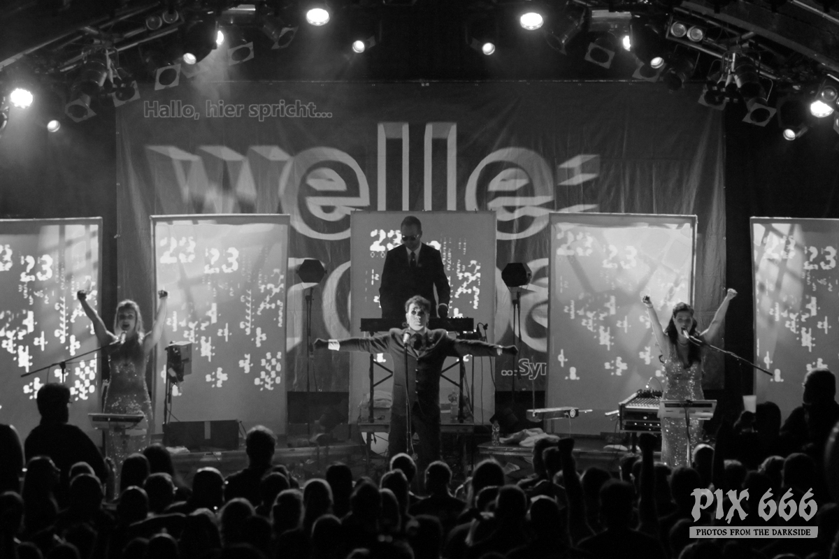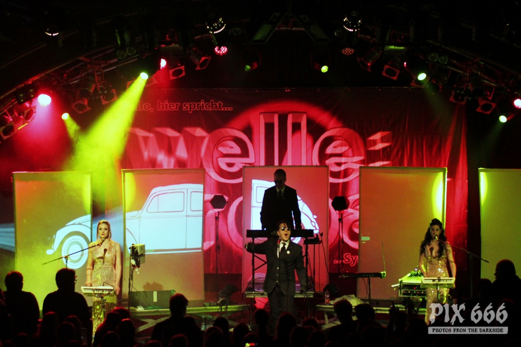 Rekordzeit beim Changeover: Nach nur etwa 12 Minuten ging es schon weiter – kaum Zeit, das Pausenbier in Ruhe auszutrinken. Etwas Hektik brach dann gleich zu Beginn beim Welle:Erdball Sänger Honey aus – er hat auf der dunklen Bühne das Mikrofon nicht mehr gefunden und ein Techniker musste zu Hilfe kommen, um es zu suchen. ‚Wir sind die Roboter‘, ein Cover der Band Kraftwerk, war der erste Song der unglaublich langen Setlist von Welle:Erdball.