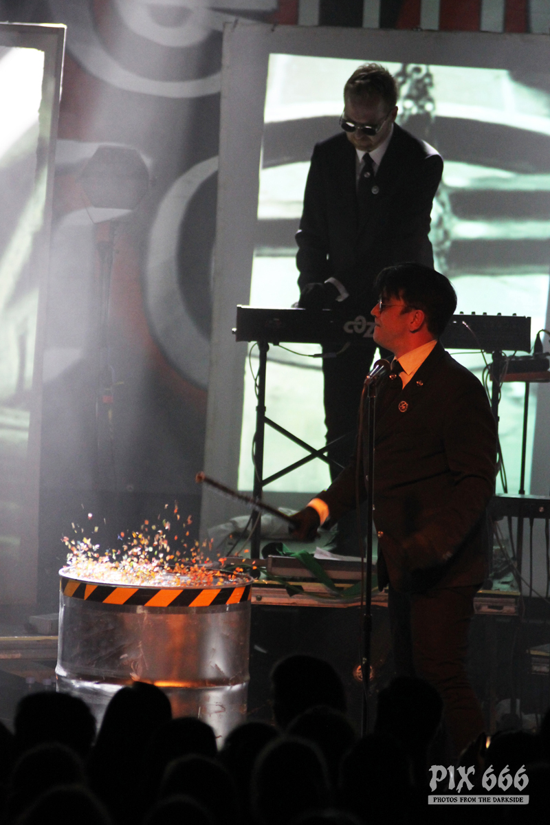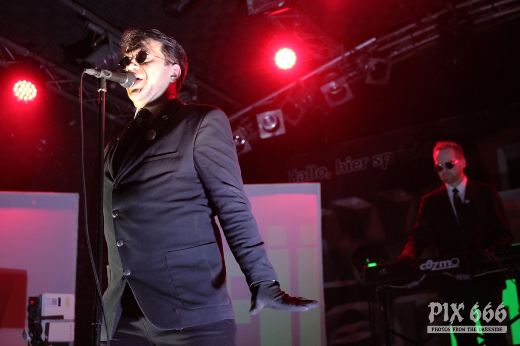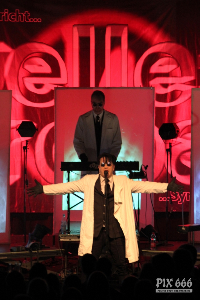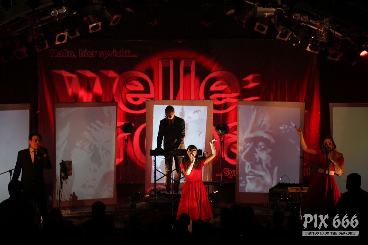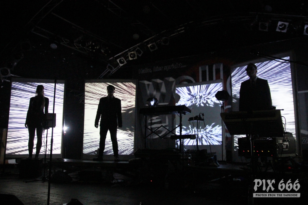 Rekordzeit beim Changeover: Nach nur etwa 12 Minuten ging es schon weiter – kaum Zeit, das Pausenbier in Ruhe auszutrinken. Etwas Hektik brach dann gleich zu Beginn beim Welle:Erdball Sänger Honey aus – er hat auf der dunklen Bühne das Mikrofon nicht mehr gefunden und ein Techniker musste zu Hilfe kommen, um es zu suchen. ‚Wir sind die Roboter‘, ein Cover der Band Kraftwerk, war der erste Song der unglaublich langen Setlist von Welle:Erdball.
