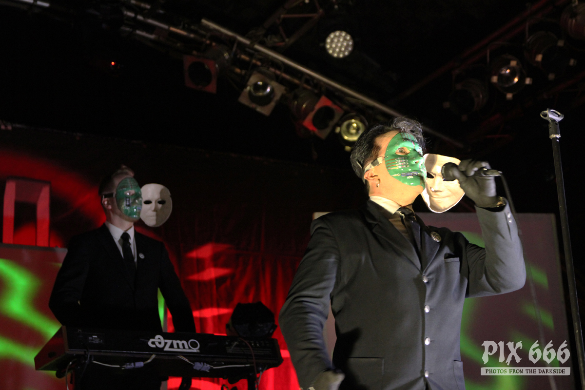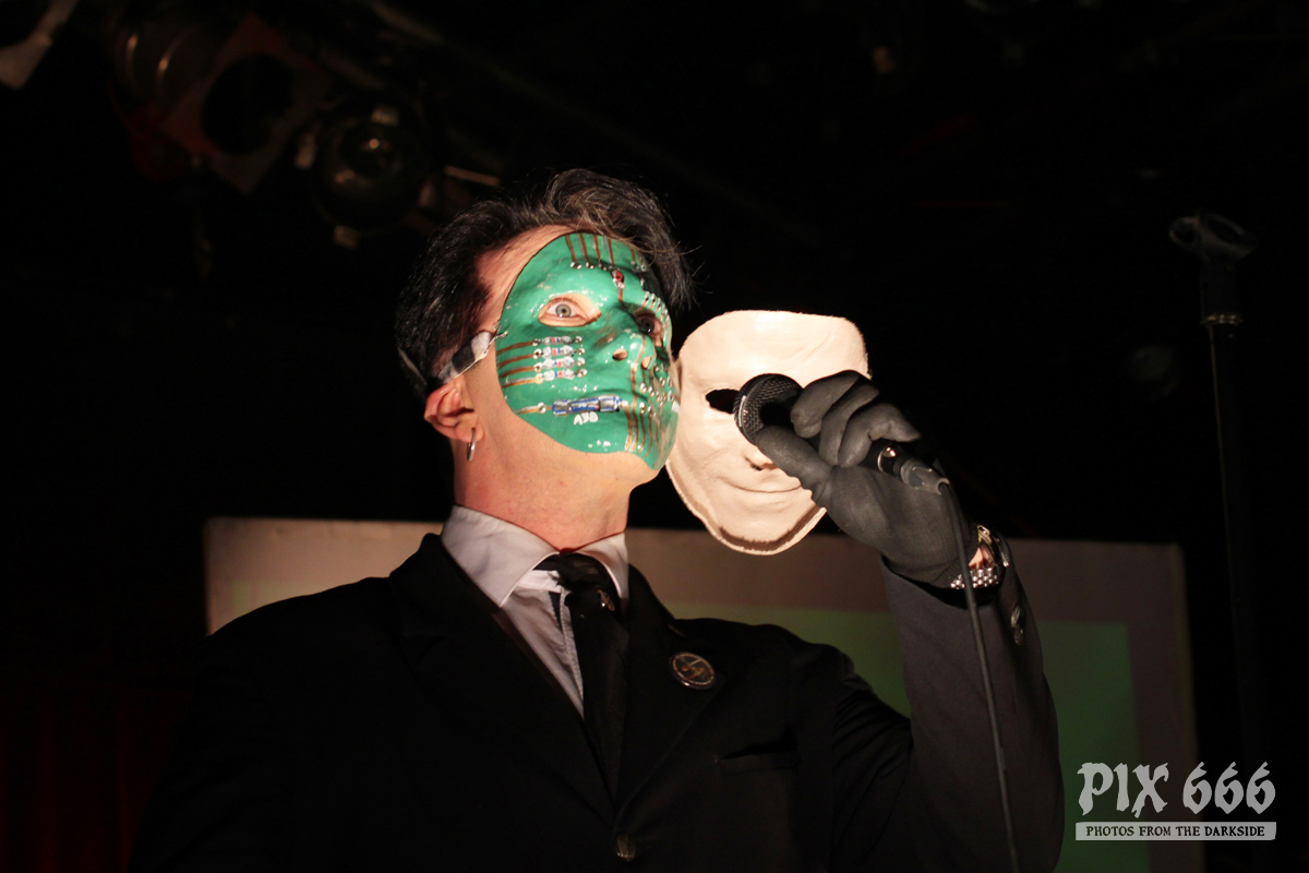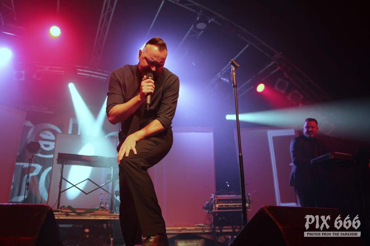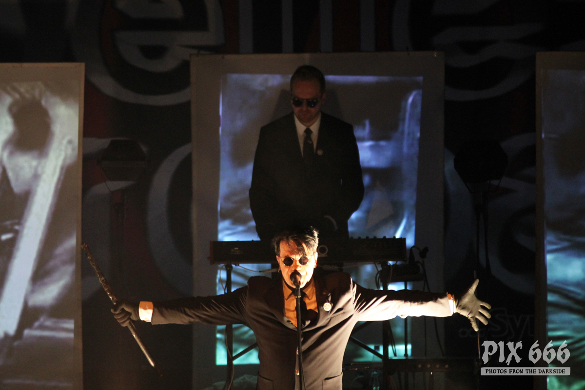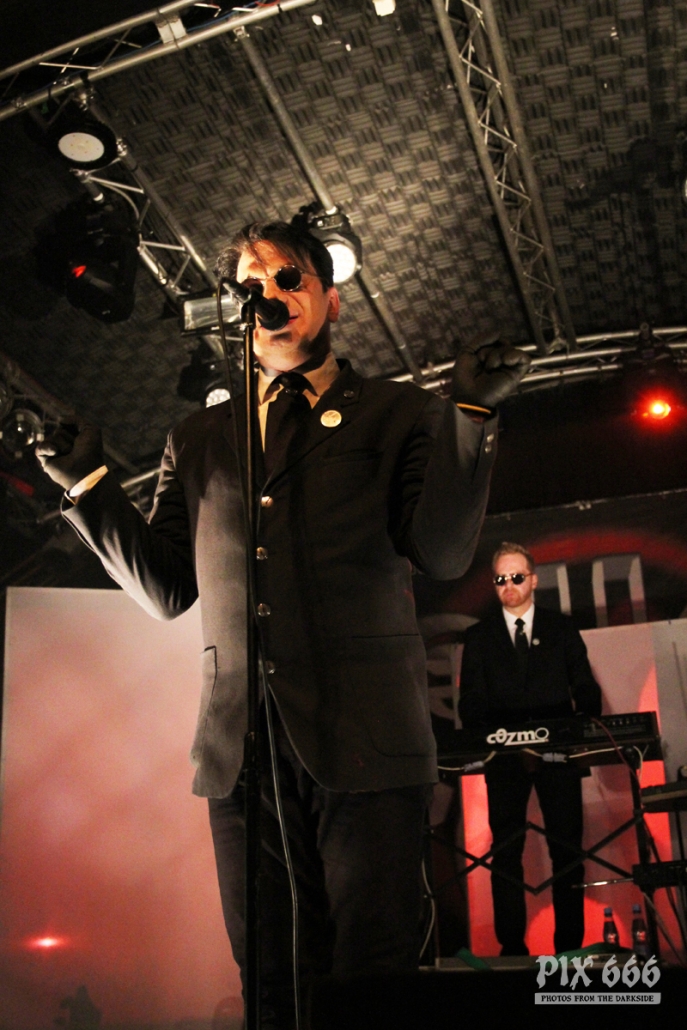 Rekordzeit beim Changeover: Nach nur etwa 12 Minuten ging es schon weiter – kaum Zeit, das Pausenbier in Ruhe auszutrinken. Etwas Hektik brach dann gleich zu Beginn beim Welle:Erdball Sänger Honey aus – er hat auf der dunklen Bühne das Mikrofon nicht mehr gefunden und ein Techniker musste zu Hilfe kommen, um es zu suchen. ‚Wir sind die Roboter‘, ein Cover der Band Kraftwerk, war der erste Song der unglaublich langen Setlist von Welle:Erdball.