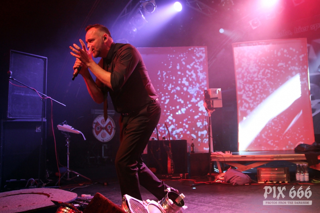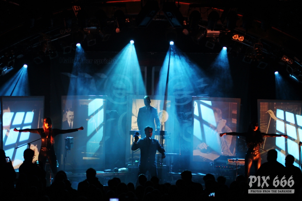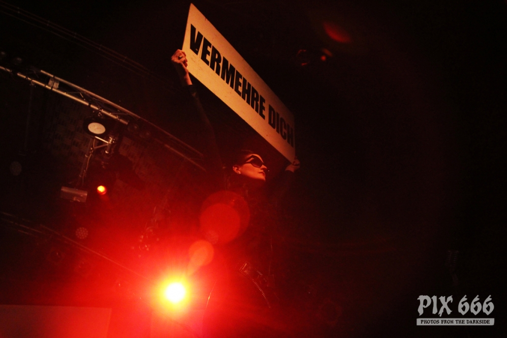 Inzwischen hatte die Frauen rote Kleider an, und sangen gemeinsam im Duett. Bei ‚Tanz den Wahnsinn‘ rückten sie dann in den Hintergrund und standen neben c0zmo’s Keyboard für den Background Gesang. Riesenstimmung nun in der Markthalle – getanzt wurde in allen Ecken der Halle, auch ganz hinten. „Ich merke sie werden schon etwas müde. – Nein? – dann zeigen sie mir das Mal“ Mit solchen Ansagen ist es fast unmöglich, dass es ein Stimmungstief während eines Konzertes gibt. Jetzt war Honey überwältigt vom Jubel, das war schon heftig und laut. „Ich habe verstanden – sie sind nicht müde“ sagte er. Dann bei ‚Der Türspion‘ wurden die Lyrics des Songs auf den fünf Leinwänden angezeigt, die auf der Bühne standen. Nun waren die Mädels rechts und links hinter den zwei äußeren Leinwänden, die auch als Schattenwand funktioniert.
