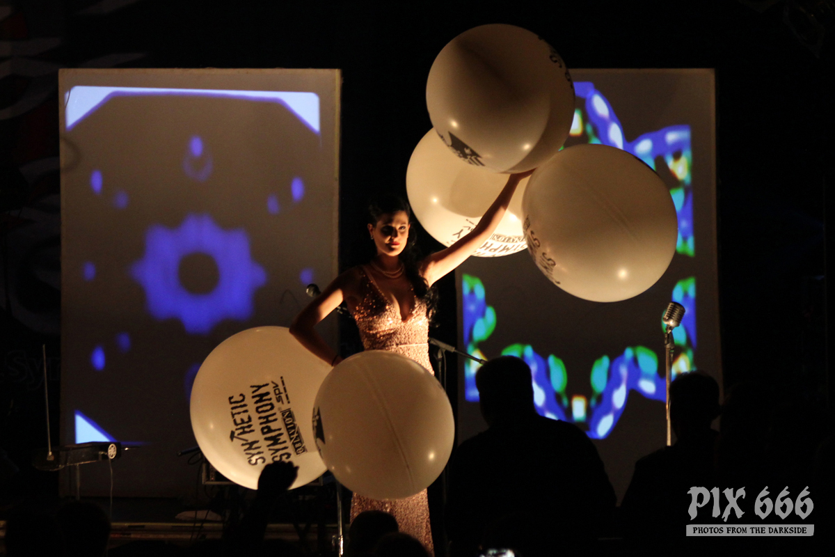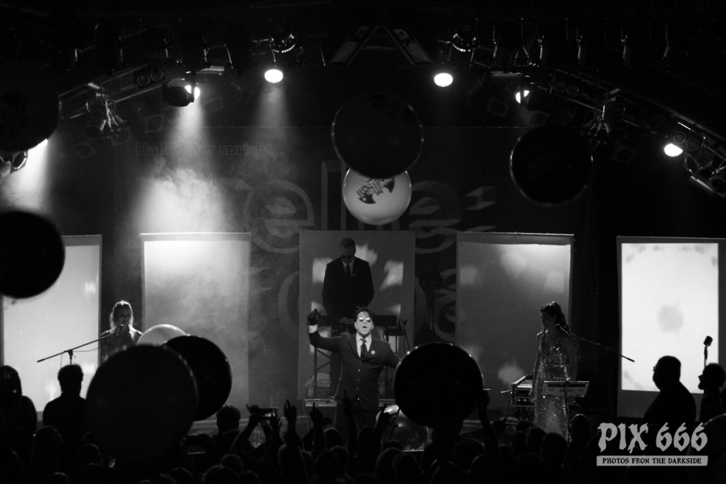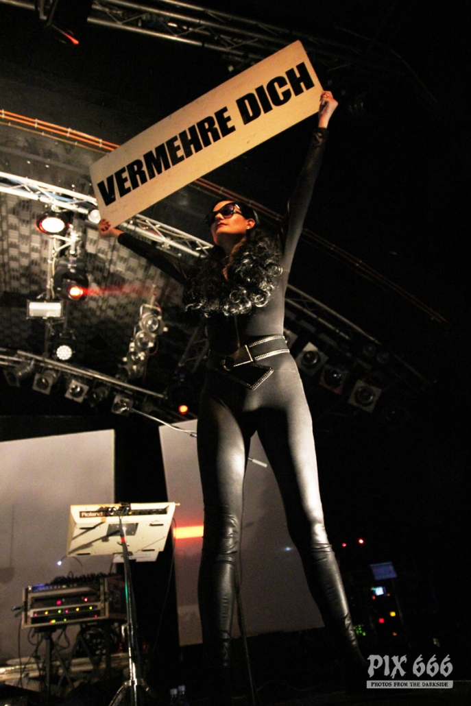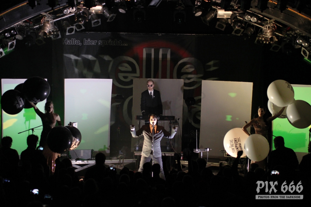 Dann gab es krasse Töne aus dem Theremin, einem elektronischen Musikinstrument, das vor fast 100 Jahren erfunden worden ist – es erzeugt Töne berührungslos. Das waren Geräusche, wie in einer Geisterbahn und passten natürlich perfekt zum Song ‚Wo kommen all die Geister her?‘ Dann zogen sich Honey und c0zmo für den Song ‚Komm in mein Labor‘ weiße Kittel über. Die Mädels zogen sich während dieser Zeit hinter der Bühne einmal mehr um – nun waren die silbernen Paillettenkleider dran – und deckten sich mit den berühmten Welle:Erdball Ballons ein.