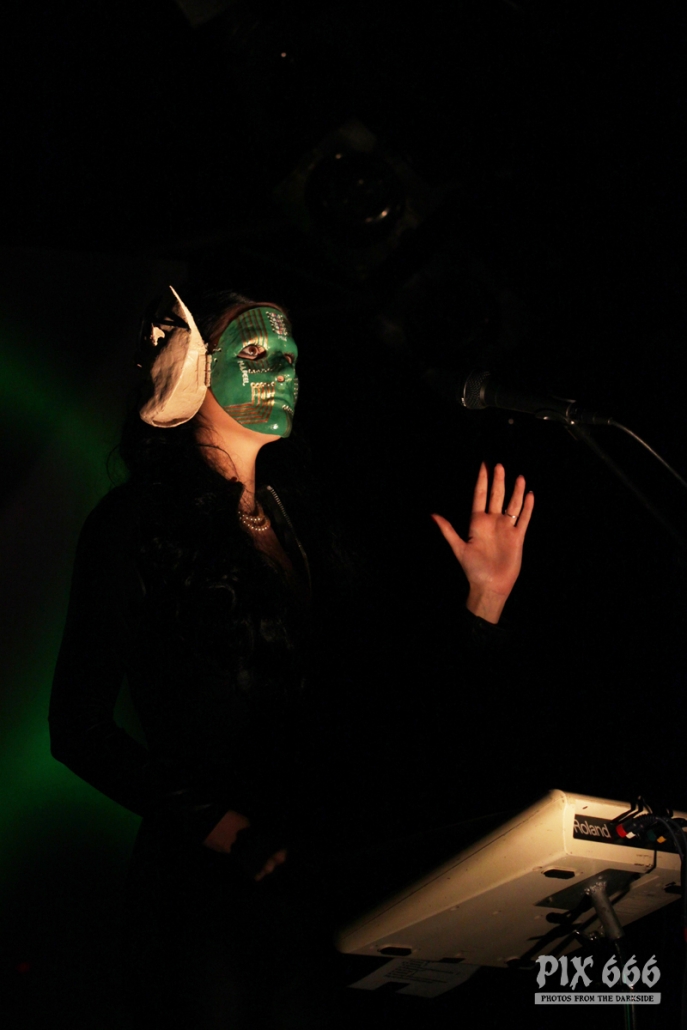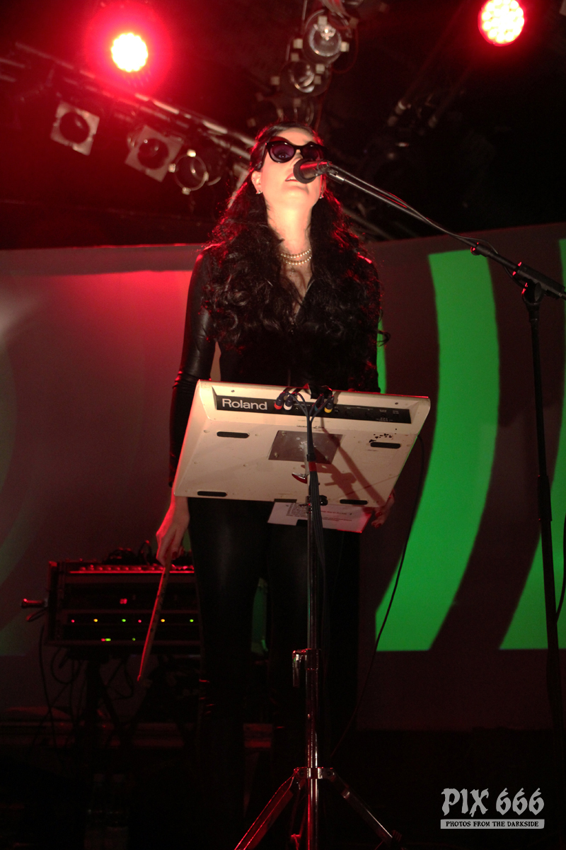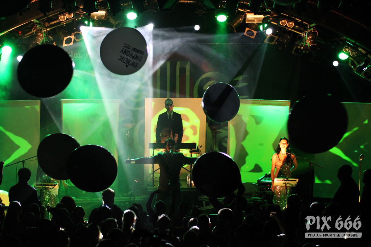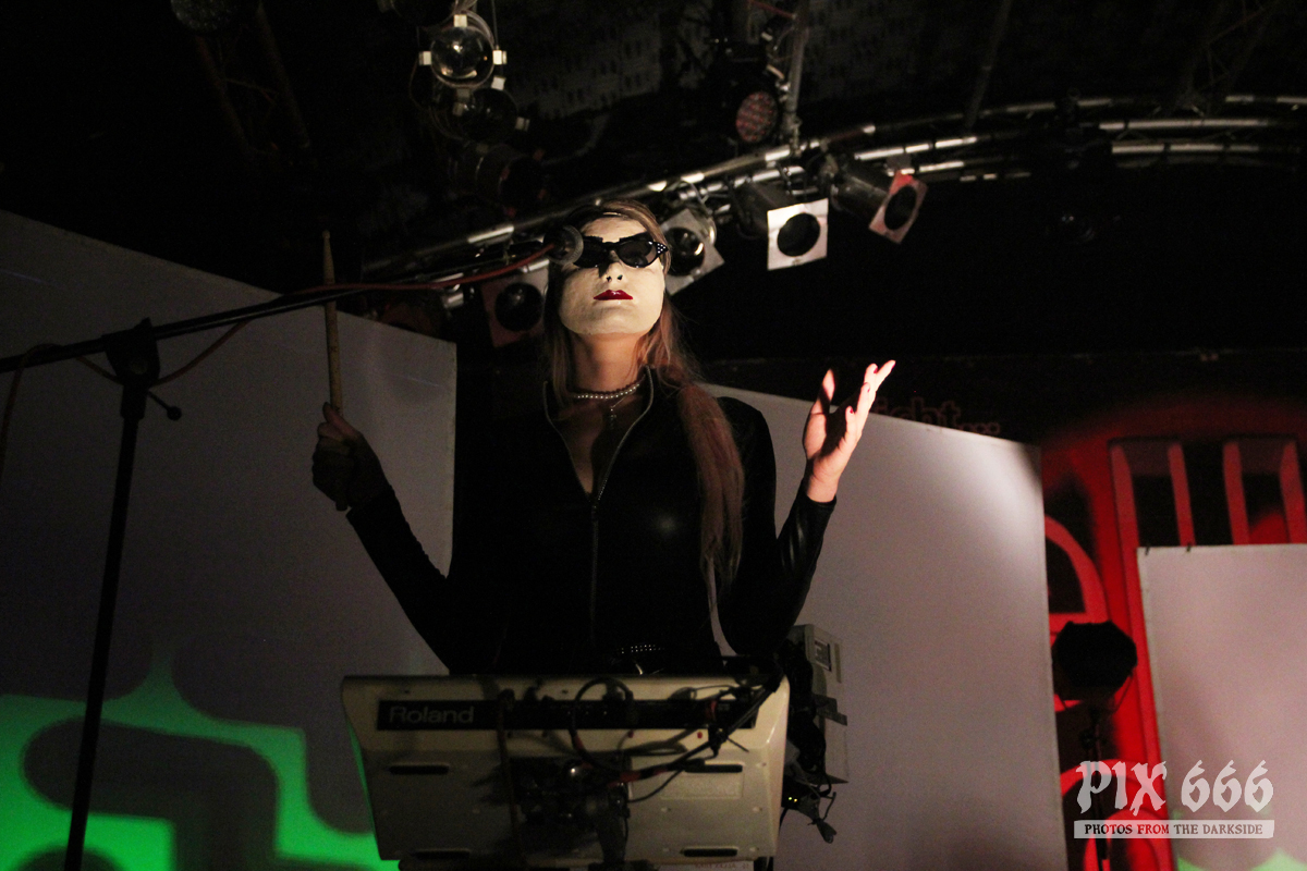 Dann gab es krasse Töne aus dem Theremin, einem elektronischen Musikinstrument, das vor fast 100 Jahren erfunden worden ist – es erzeugt Töne berührungslos. Das waren Geräusche, wie in einer Geisterbahn und passten natürlich perfekt zum Song ‚Wo kommen all die Geister her?‘ Dann zogen sich Honey und c0zmo für den Song ‚Komm in mein Labor‘ weiße Kittel über. Die Mädels zogen sich während dieser Zeit hinter der Bühne einmal mehr um – nun waren die silbernen Paillettenkleider dran – und deckten sich mit den berühmten Welle:Erdball Ballons ein.