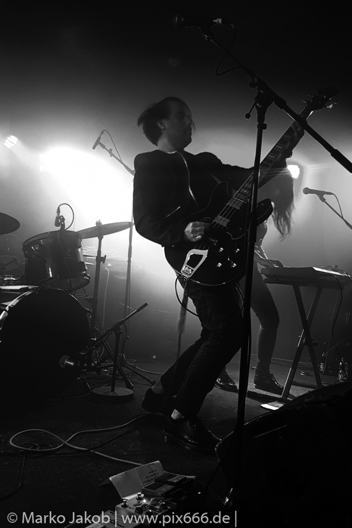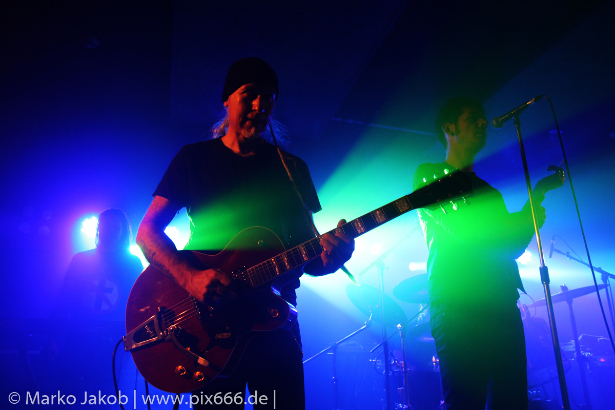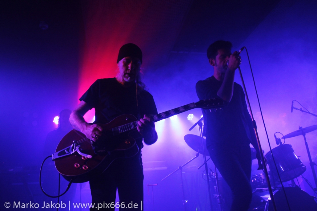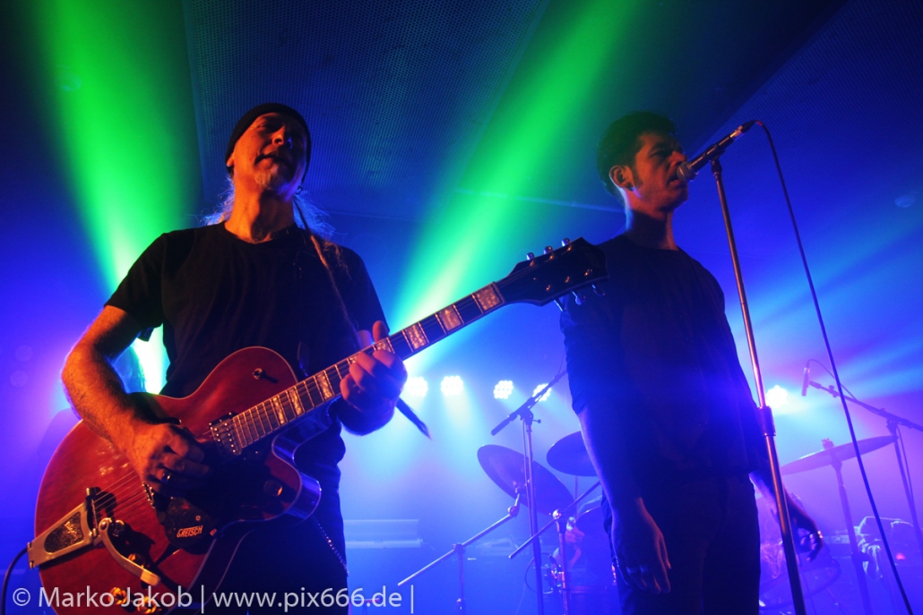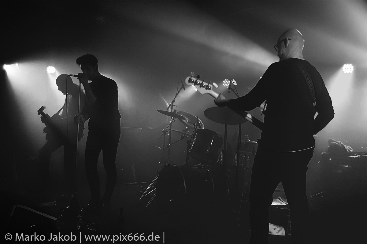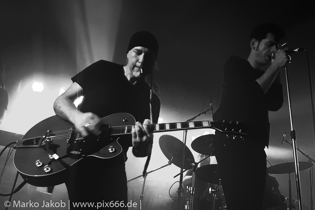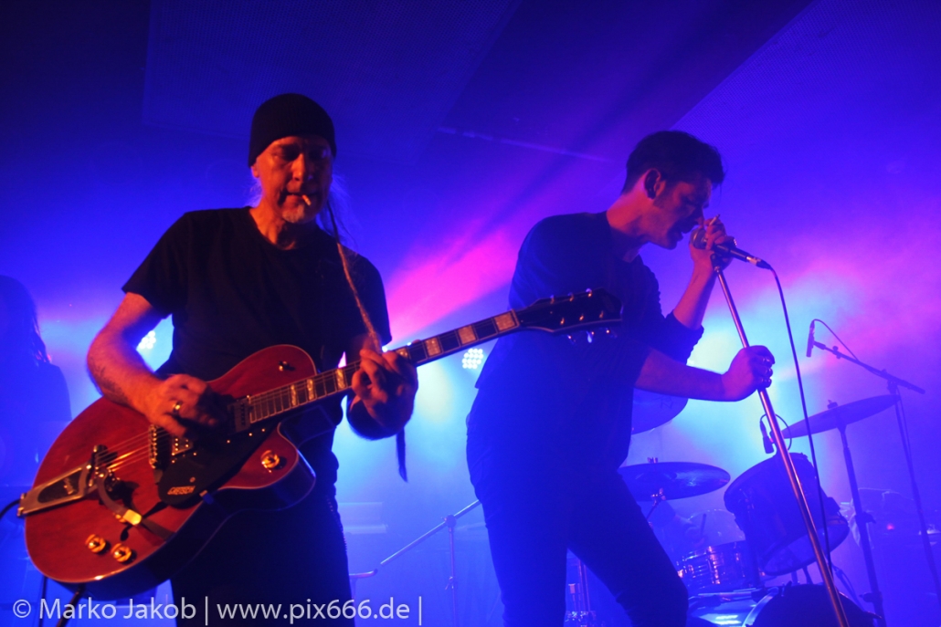 Der geplante Beginn verzögerte sich etwas, das Konzert begann etwa 20 Minuten später als geplant. Die Golden Apes begannen ihr Set mit dem Titel ‚Voykova‘, gefolgt von ‚Ignorance‘ vom aktuellen Album. Es folgten 3 weitere Songs vom Album MɅLVS. Das Publikum tauchte zusammen mit der Band in die düstere Welt der Golden Apes ein. Die Ausstrahlung von Sänger Peer Lebrecht ist beeindruckend – und er muss dafür nicht viel tun. Man merkt ihm an, wie er seine Musik lebt und fühlt. Der Club war nur fast komplett gefüllt und die Zeit verging wie im Flug. Beim Song ‚Missing‘ setzte sich Sänger Peer wie so oft an den Rand der Bühne, und zog genüsslich an seiner Zigarette. ‚Ferryman‘ war eines von nur wenigen älteren Titeln des Abends. Nach etwa fünf Zigaretten fand ein tolles, etwa 45 minütiges Konzert mit dem Song ‚The Happy Losers Sweet Delution‘ vom 2012er Album ‚Riot‘ seinen Abschluss. Im Januar 2019 werden die Berliner unter anderem in Frankreich und der Schweiz auftreten.