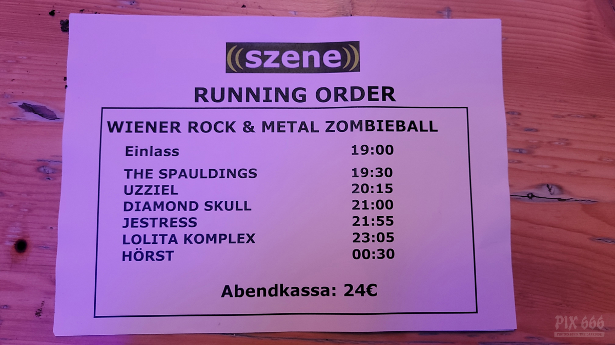 Von 19.30 Uhr bis 01.30 Uhr gab es im großen Saal Livemusik am laufenden Band. Im Vorraum gab es einen Merch, die Kantine bzw. Bar wurde zur Disco umfunktioniert und eine Zombieball Fotocorner aufgebaut. Im Außenbereich hatte man die Gelegenheit zu Rauchen und ohne Nebengeräusche das ein oder andere Gespräch zu führen.