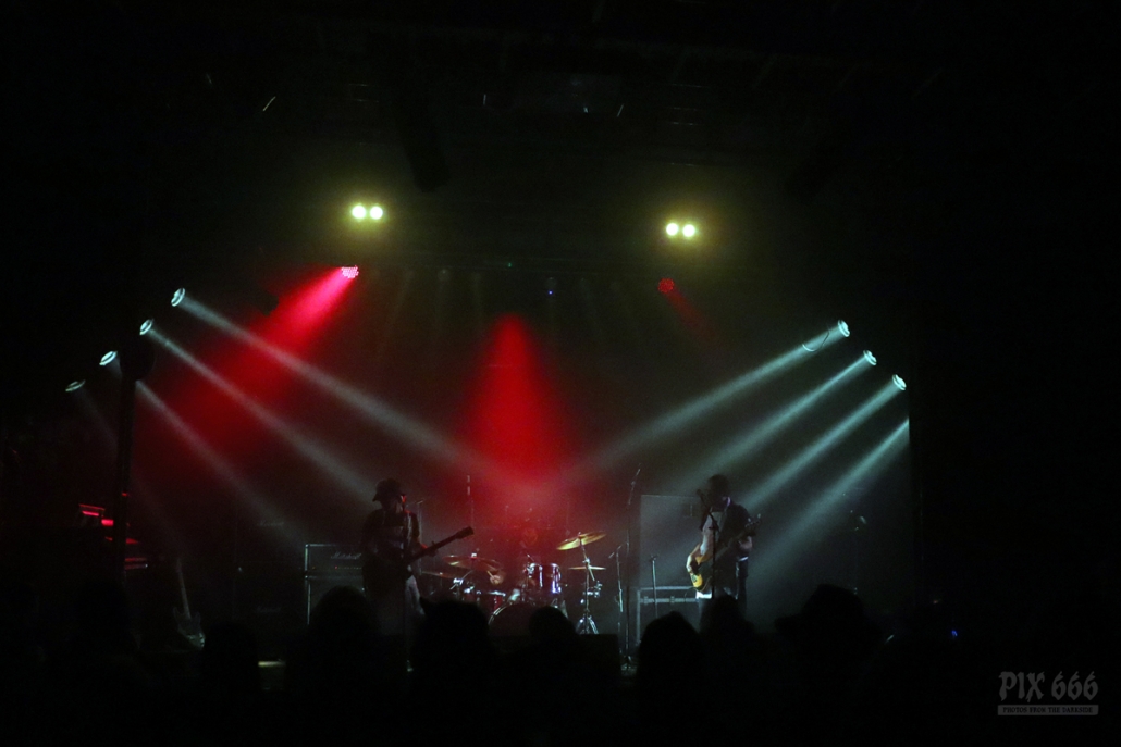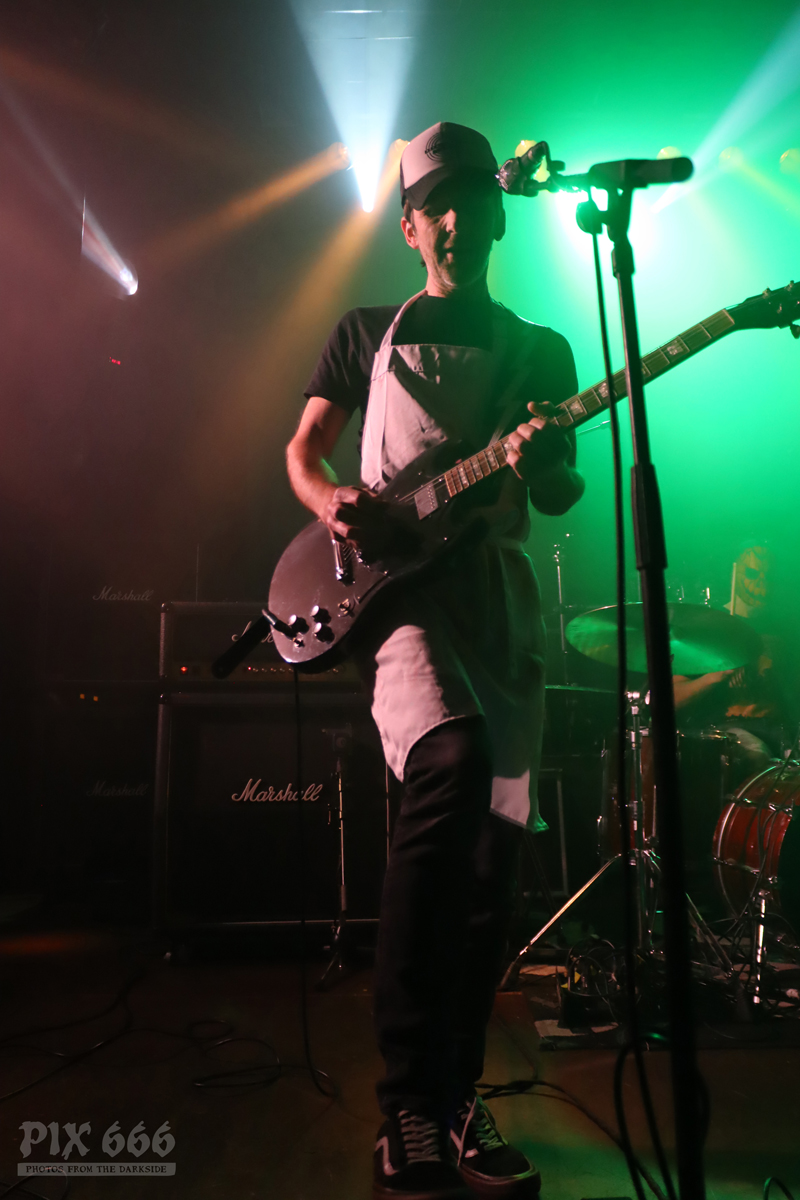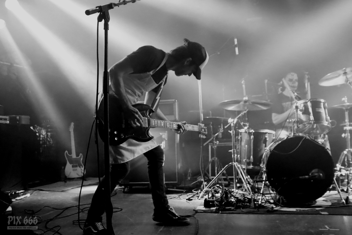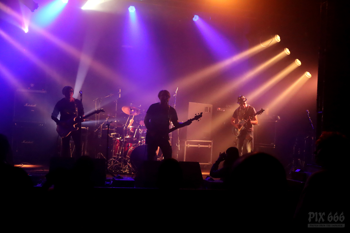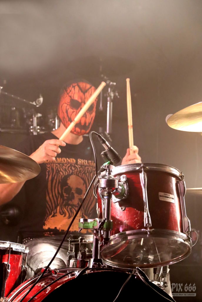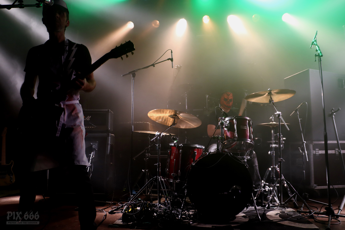Als nächstes war die Wiener Band Diamond Skull am Start. Mit weißen, blutverschmierten Schürzen integrierte sich die Band perfekt in die Horrorszenerie des Abends. Der Drummer mit Horror-Kürbismaske passte sich optisch ebenfalls mehr als punktgenau dem Motto des Abends an. Leider habe ich keine Ahnung, in welchen Outfits das Heavy Stoner Rock Trio ansonsten ihre Shows bestreitet. „Wir sind Diamond Skull aus Wien – Happy Halloween gewünscht“ – so begrüßten die Jungs den nun prallgefüllten Club. Die kleine Horrorshow von Diamond Skull kam beim Publikum richtig gut an. Die Stimmung stieg mit jedem Song, und selbstverständlich auch mit jedem Schluck Bier, das gehört ja irgendwie zu so einem Abend auch dazu.