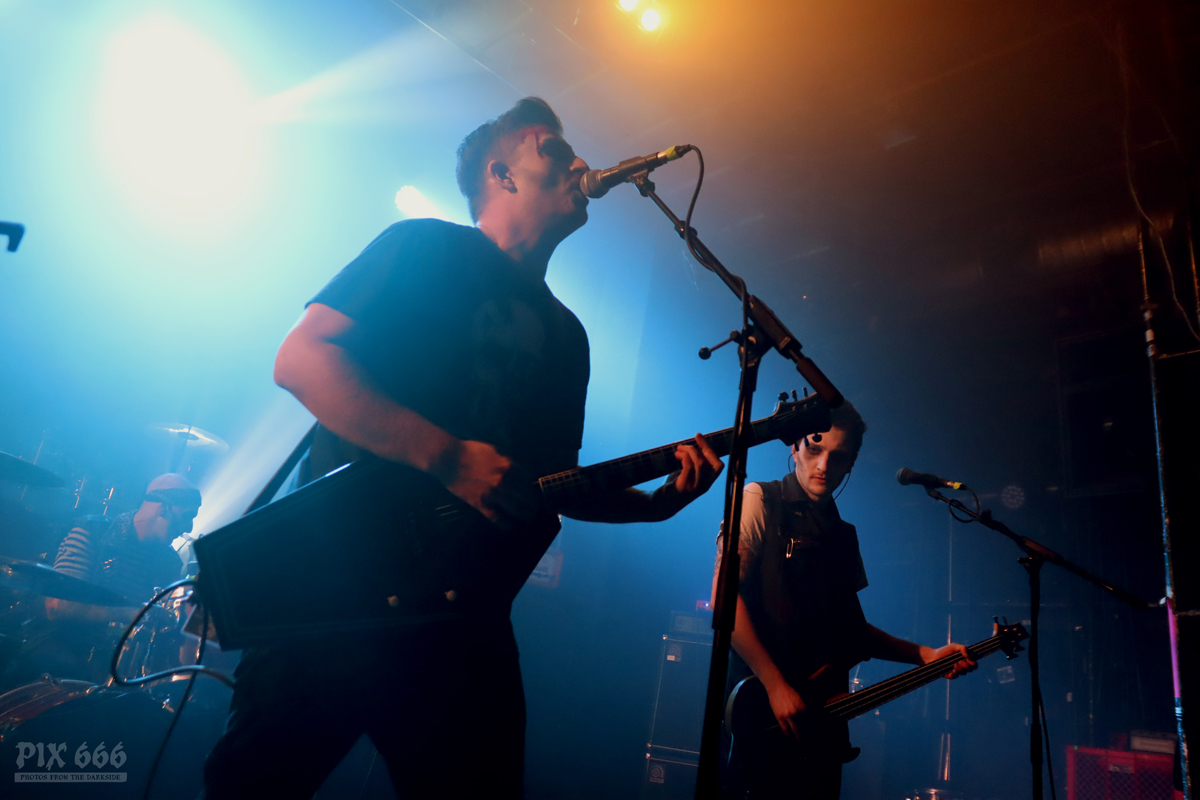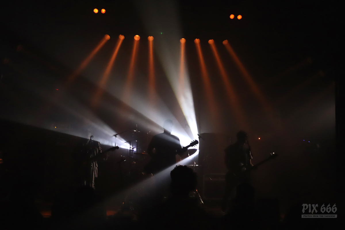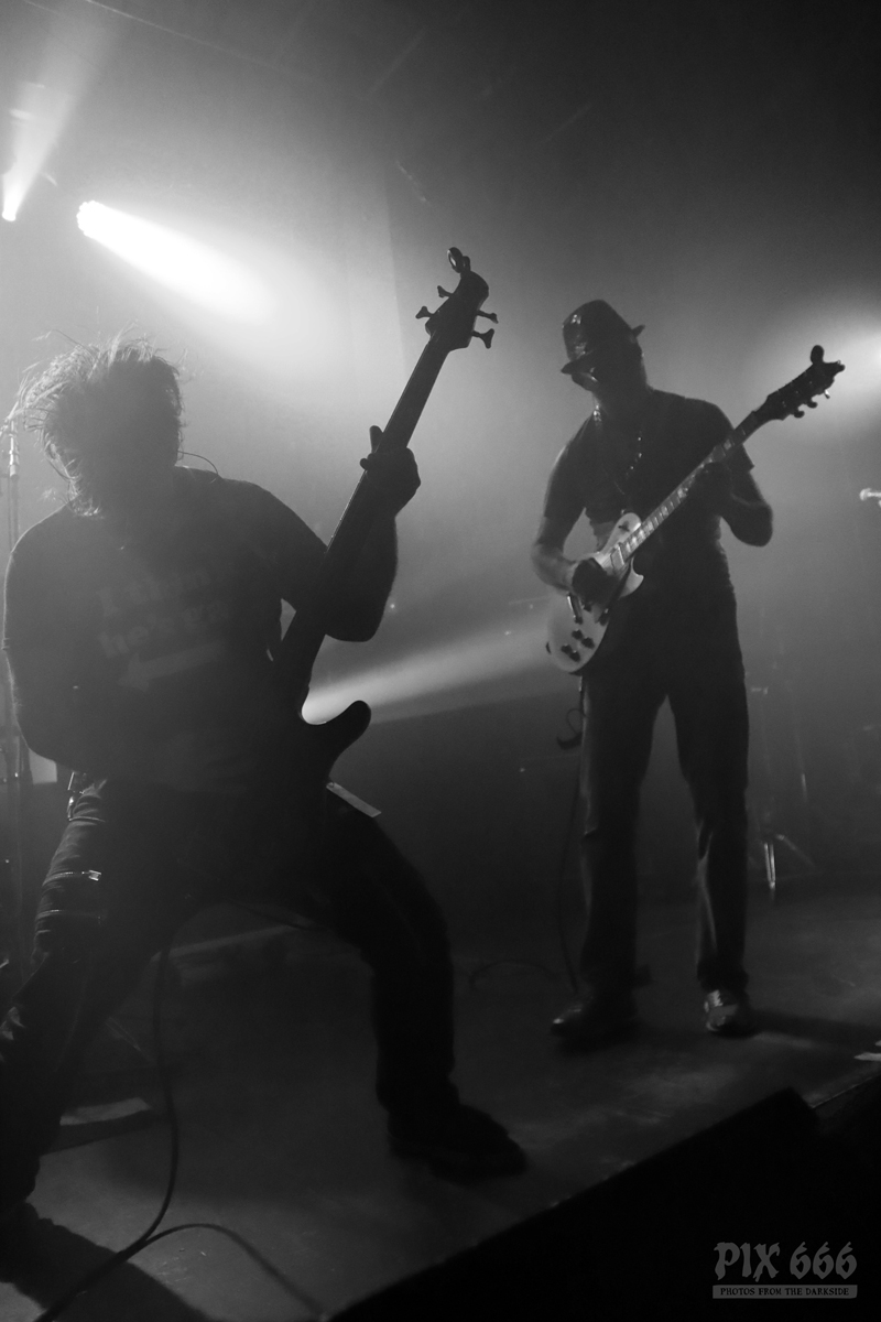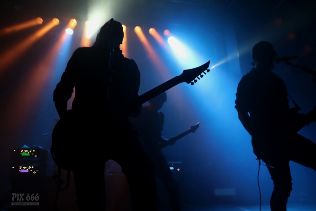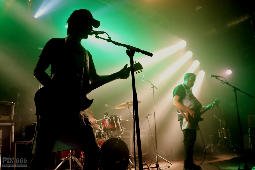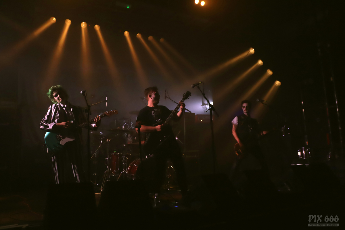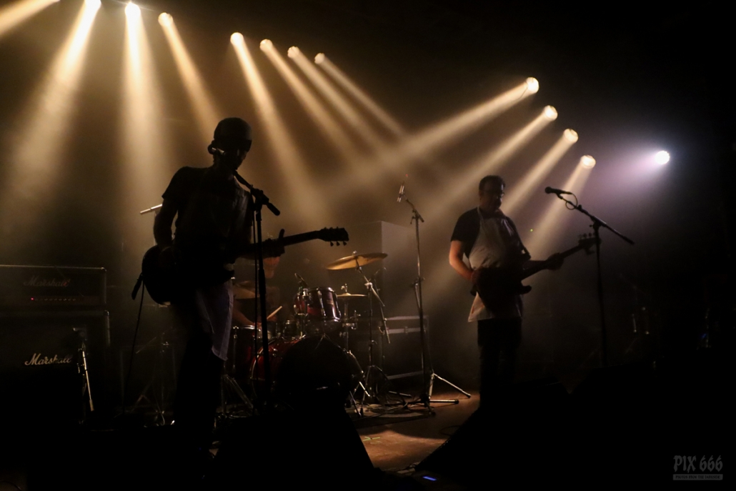 Als nächstes war die Wiener Band Diamond Skull am Start. Mit weißen, blutverschmierten Schürzen integrierte sich die Band perfekt in die Horrorszenerie des Abends. Der Drummer mit Horror-Kürbismaske passte sich optisch ebenfalls mehr als punktgenau dem Motto des Abends an. Leider habe ich keine Ahnung, in welchen Outfits das Heavy Stoner Rock Trio ansonsten ihre Shows bestreitet. „Wir sind Diamond Skull aus Wien – Happy Halloween gewünscht“ – so begrüßten die Jungs den nun prallgefüllten Club. Die kleine Horrorshow von Diamond Skull kam beim Publikum richtig gut an. Die Stimmung stieg mit jedem Song, und selbstverständlich auch mit jedem Schluck Bier, das gehört ja irgendwie zu so einem Abend auch dazu.