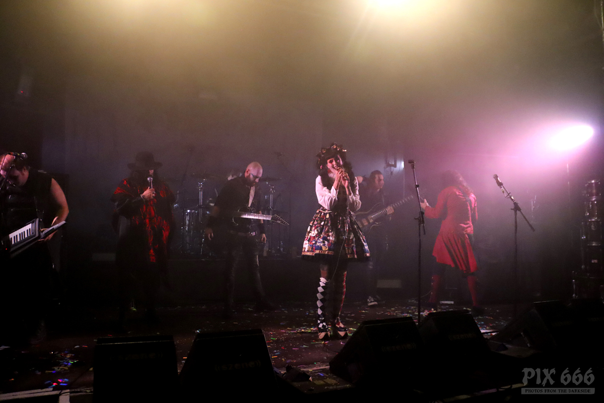Nun war die Zeit des beliebten ‚Musikzirkus‘ Lolita KompleX gekommen. Zum Glück hat die Bühne in der ((Szene)) die nötige Breite und Tiefe für sieben verrückte Musiker, denn die Band sprang, hüpfte und drehte sich pausenlos wie ein ‚Rumpelstilzchen‘, dafür braucht man schon etwas Platz. Die Show begann mit einem überdimensionalen Konfettiregen und dem Song ‚Welcome To The Circus‘.