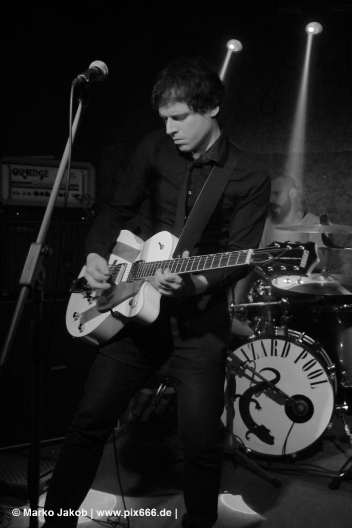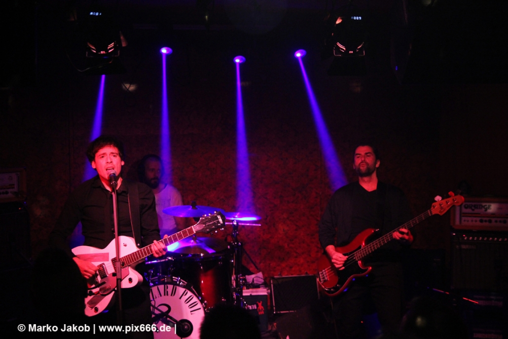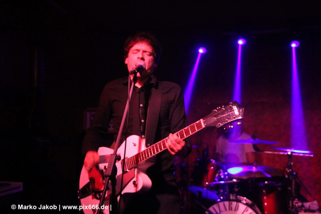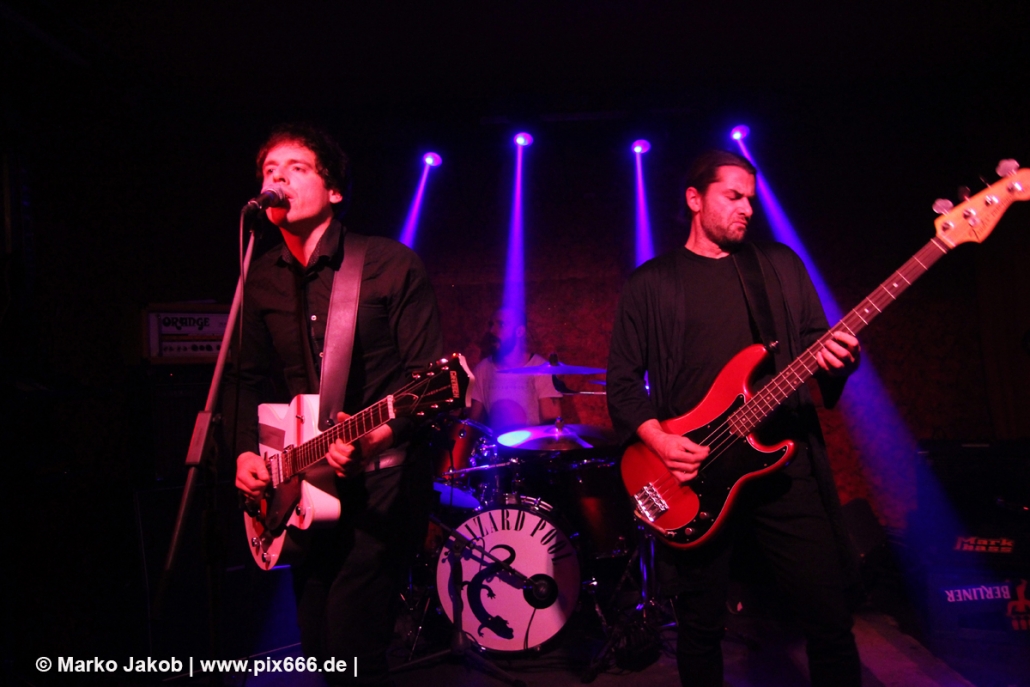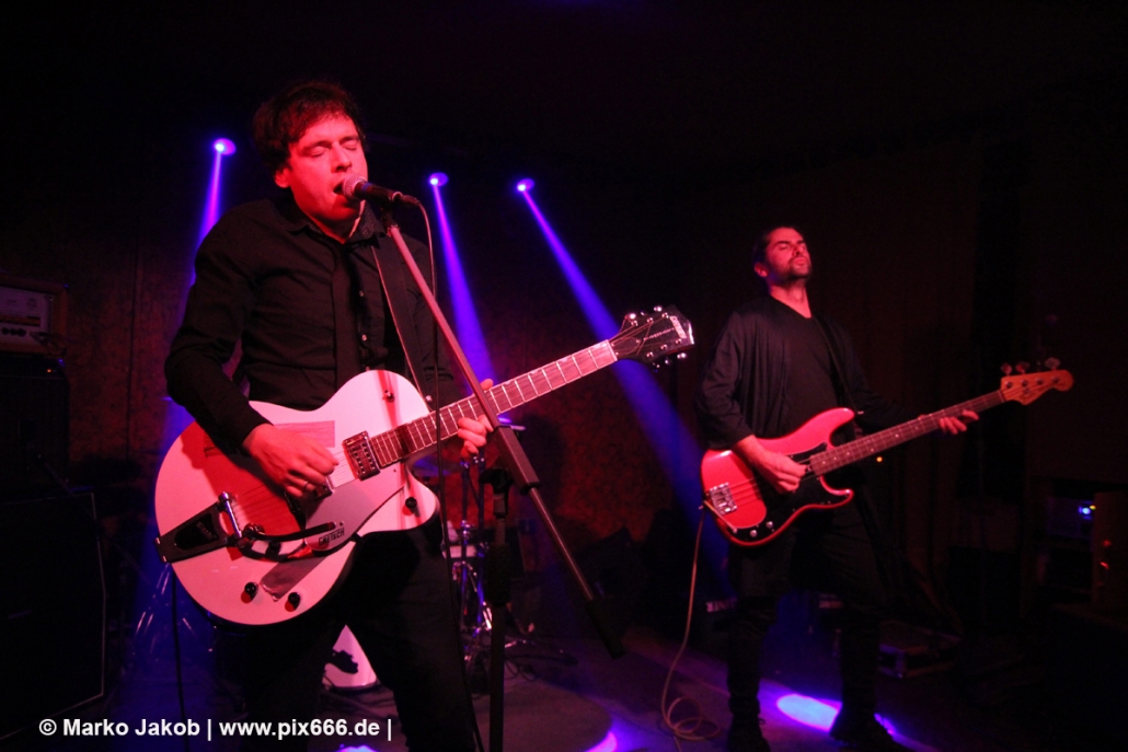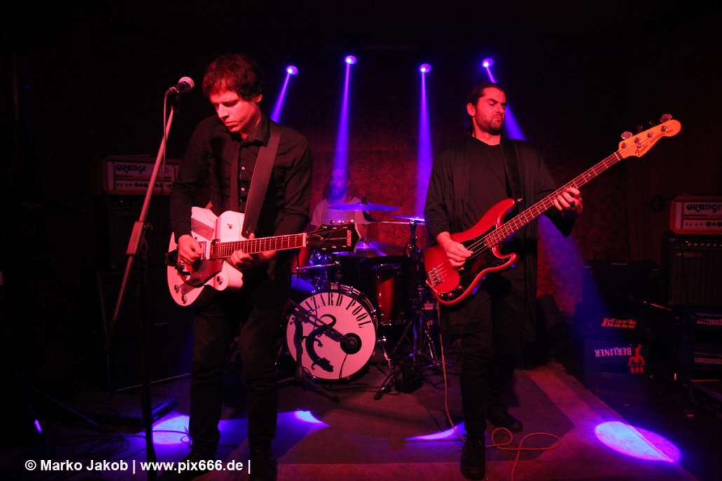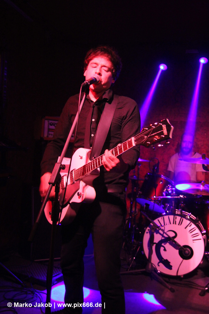 Der flotte Indie-Wave kam bei den Berlinern richtig gut an – von Beginn an war gute Stimmung in der total gemütlichen Kneipe. Die Bühne befand sich gleich neben der Eingangstür – gegenüber der Bühne war eine Art Minitribüne aus Holz – das sorgte für eine sehr besondere Atmosphäre. Im Laufe des Konzertes trafen immer mehr Leute in der Kneipe ein und es war schon bei Lizard Pool sehr sehr voll. Es waren sogar noch einige an der Bar und im Raucherbereich, so dass die Veranstaltung ganz kurz vor ausverkauft war. Lizard Pool animierte mit den flotten und frischen Songs zum Tanzen – und wer sich in dem engen Raum noch bewegen konnte, der tanzte auch. Die Band hatte total Spaß auf der Bühne – nachdem Vincent und Shiva mit ihren Instrumenten kurz kollidierten musste die Gitarre kurz neu gestimmt werden. Aber es ging umgehend weiter.