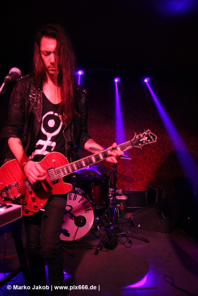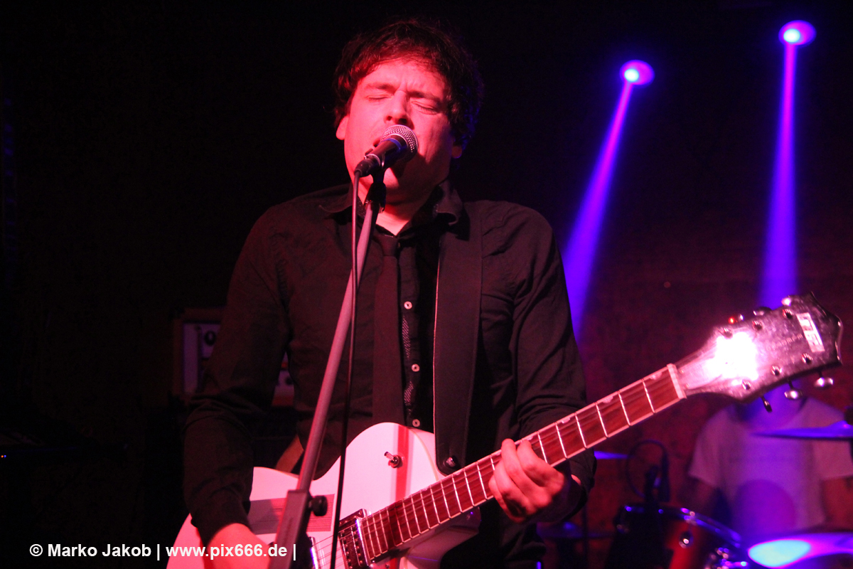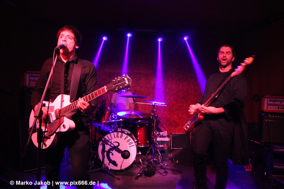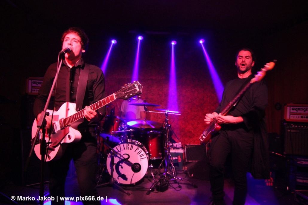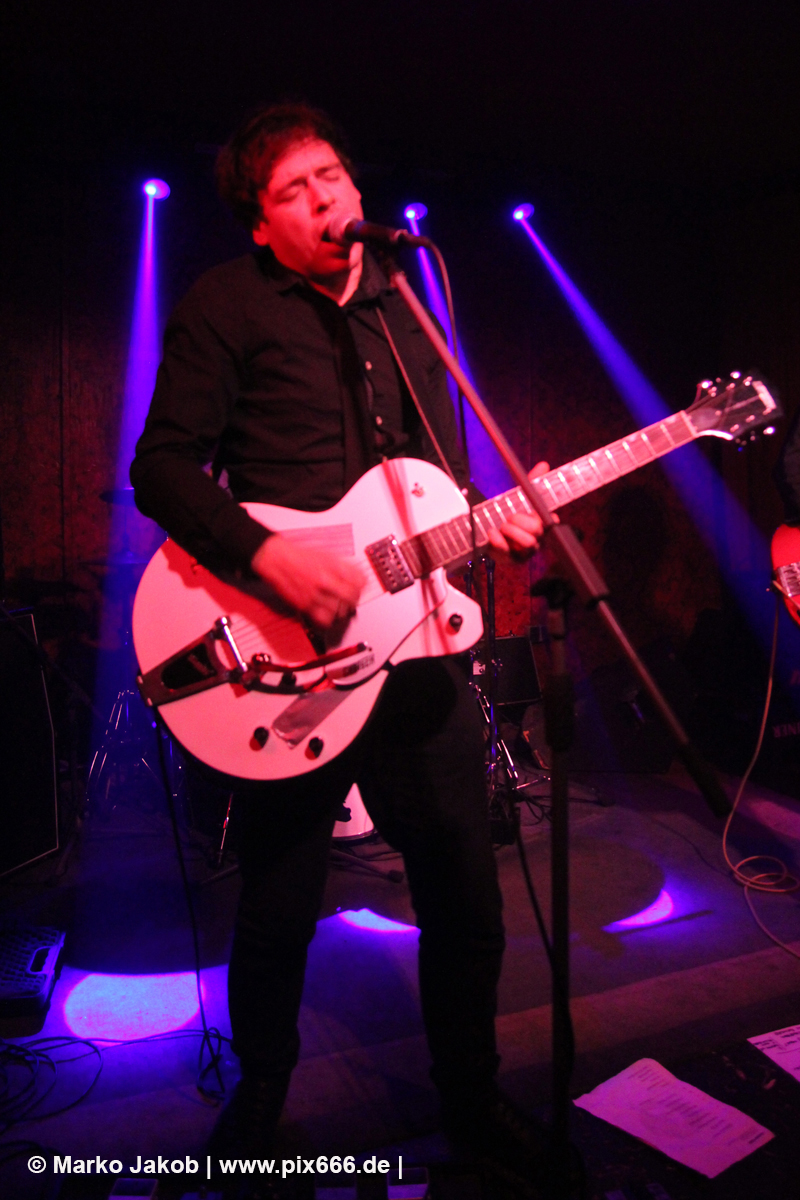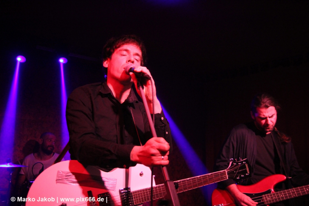 Der flotte Indie-Wave kam bei den Berlinern richtig gut an – von Beginn an war gute Stimmung in der total gemütlichen Kneipe. Die Bühne befand sich gleich neben der Eingangstür – gegenüber der Bühne war eine Art Minitribüne aus Holz – das sorgte für eine sehr besondere Atmosphäre. Im Laufe des Konzertes trafen immer mehr Leute in der Kneipe ein und es war schon bei Lizard Pool sehr sehr voll. Es waren sogar noch einige an der Bar und im Raucherbereich, so dass die Veranstaltung ganz kurz vor ausverkauft war. Lizard Pool animierte mit den flotten und frischen Songs zum Tanzen – und wer sich in dem engen Raum noch bewegen konnte, der tanzte auch. Die Band hatte total Spaß auf der Bühne – nachdem Vincent und Shiva mit ihren Instrumenten kurz kollidierten musste die Gitarre kurz neu gestimmt werden. Aber es ging umgehend weiter.