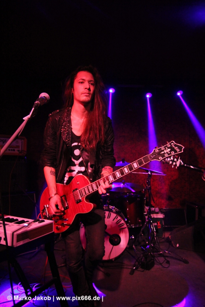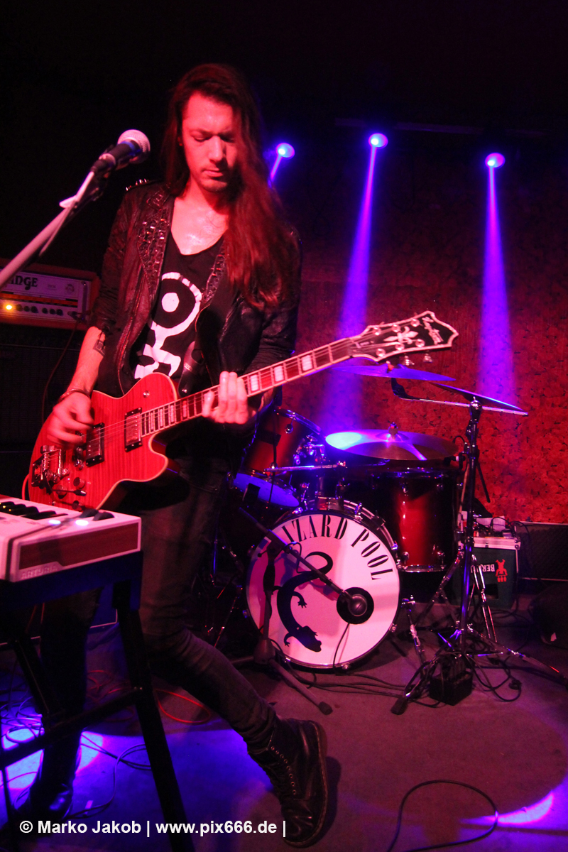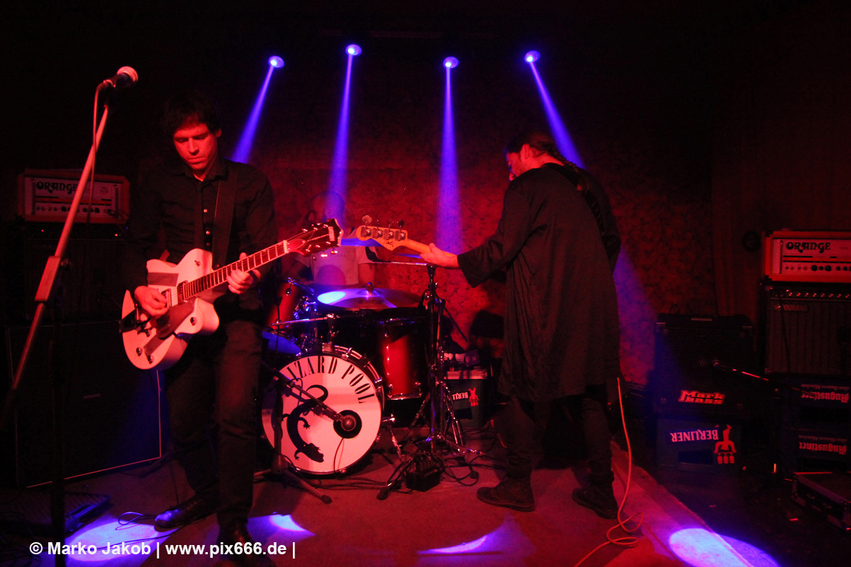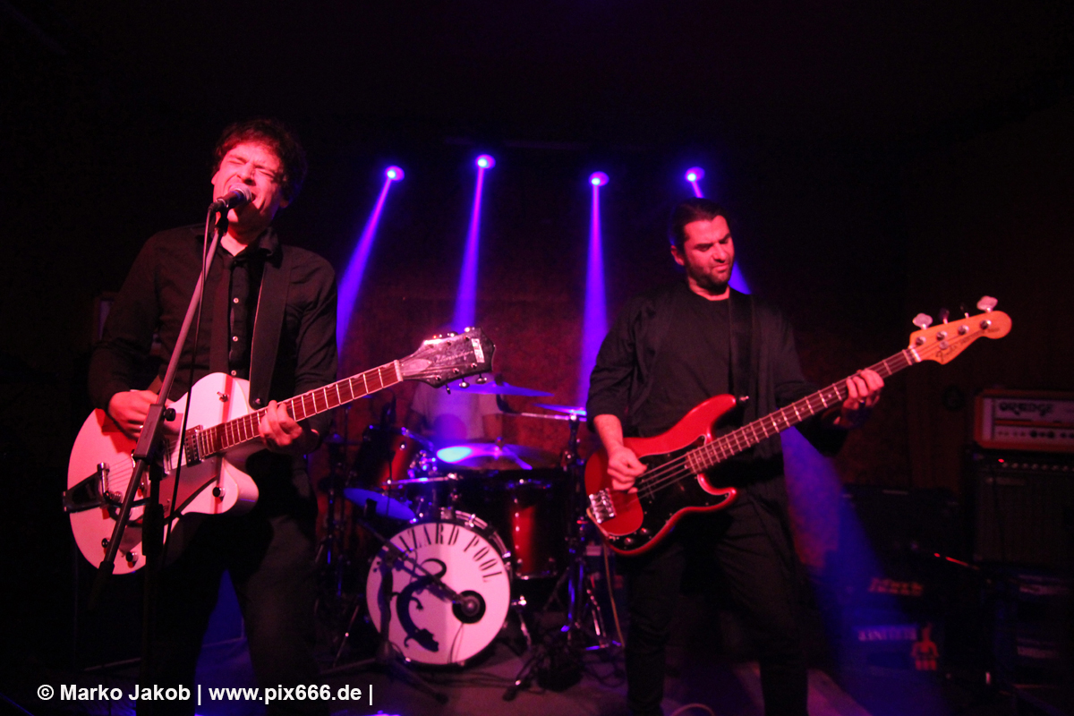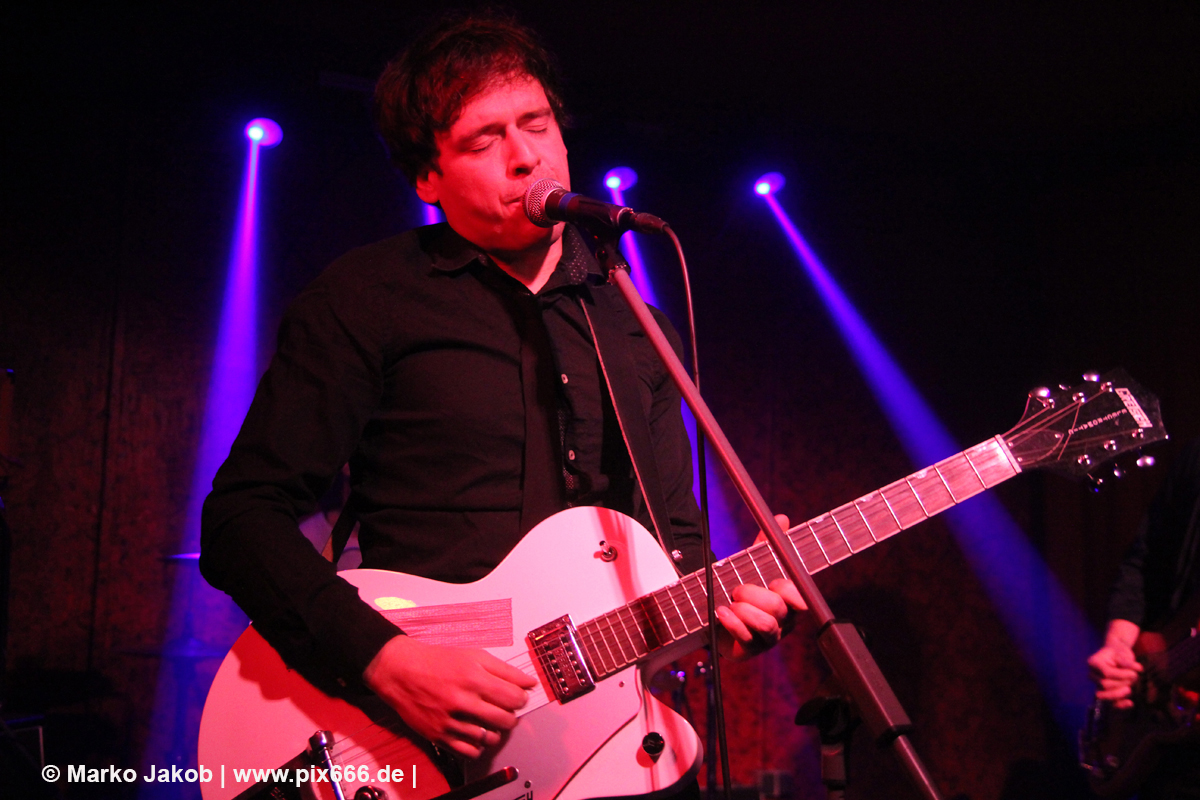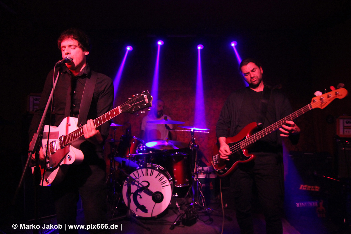 Der flotte Indie-Wave kam bei den Berlinern richtig gut an – von Beginn an war gute Stimmung in der total gemütlichen Kneipe. Die Bühne befand sich gleich neben der Eingangstür – gegenüber der Bühne war eine Art Minitribüne aus Holz – das sorgte für eine sehr besondere Atmosphäre. Im Laufe des Konzertes trafen immer mehr Leute in der Kneipe ein und es war schon bei Lizard Pool sehr sehr voll. Es waren sogar noch einige an der Bar und im Raucherbereich, so dass die Veranstaltung ganz kurz vor ausverkauft war. Lizard Pool animierte mit den flotten und frischen Songs zum Tanzen – und wer sich in dem engen Raum noch bewegen konnte, der tanzte auch. Die Band hatte total Spaß auf der Bühne – nachdem Vincent und Shiva mit ihren Instrumenten kurz kollidierten musste die Gitarre kurz neu gestimmt werden. Aber es ging umgehend weiter.
