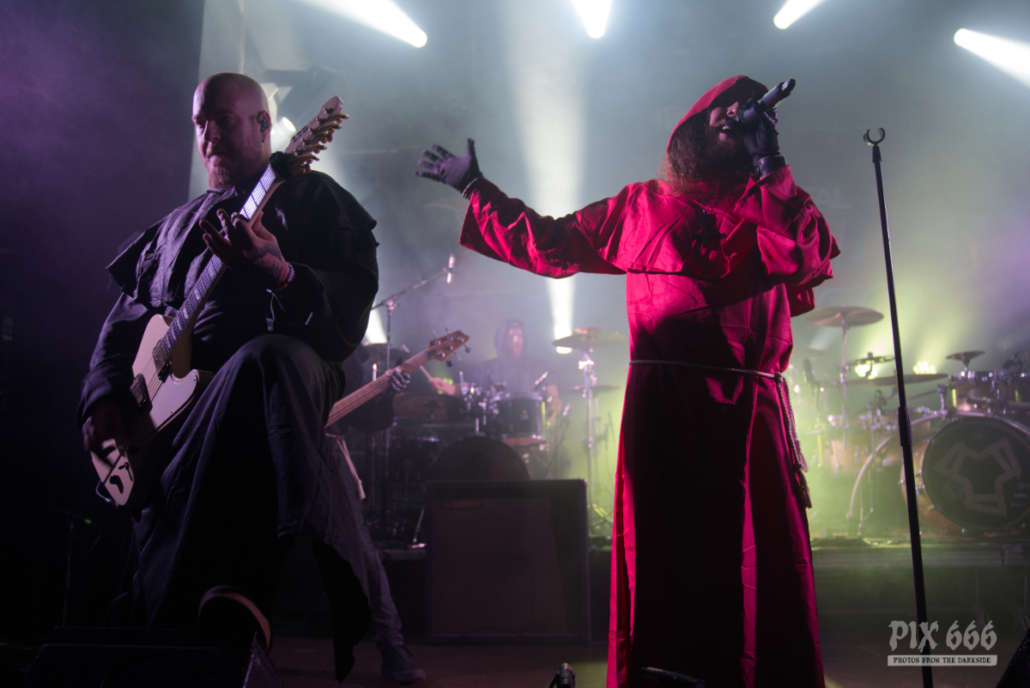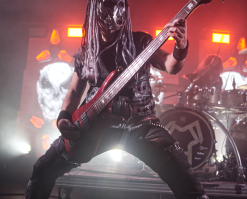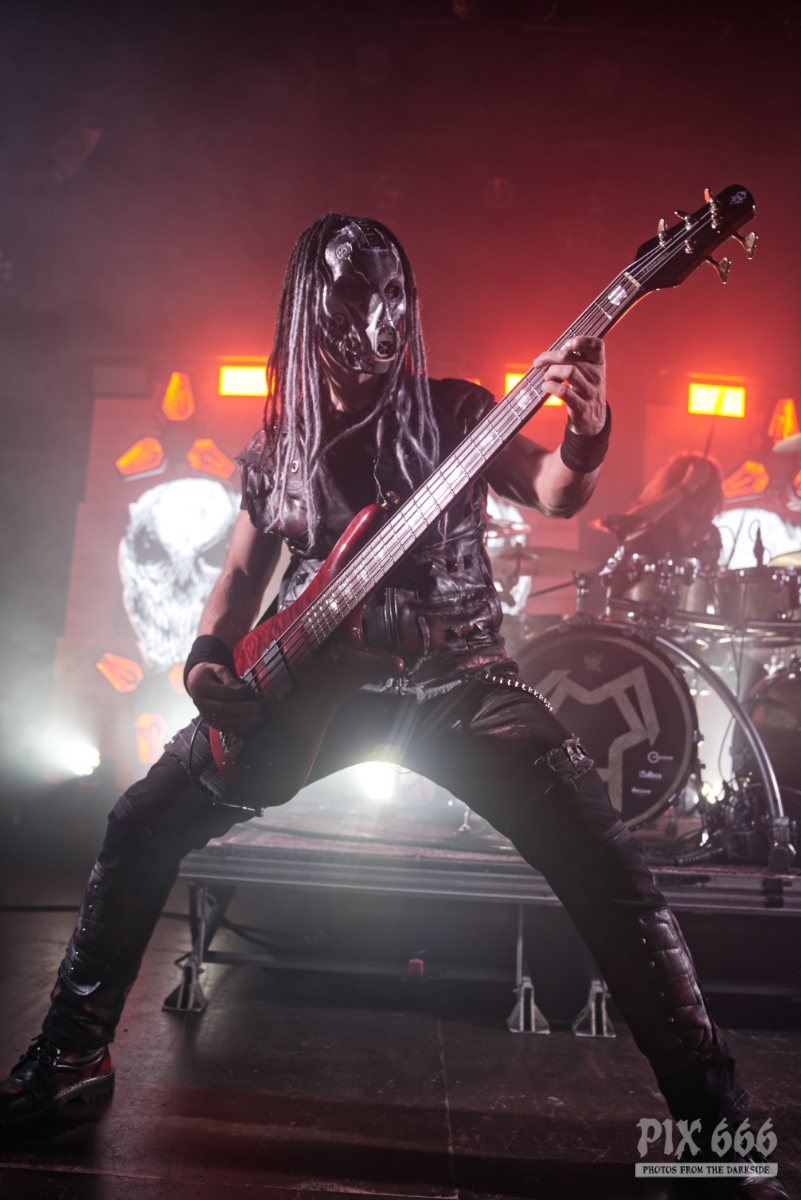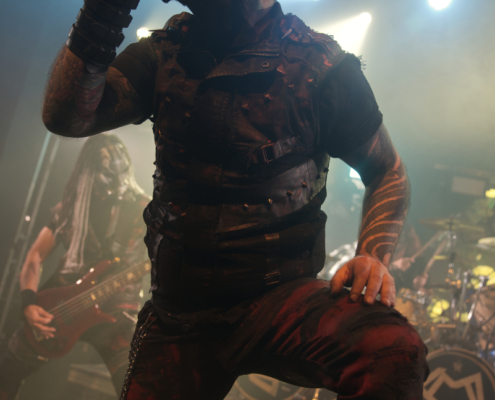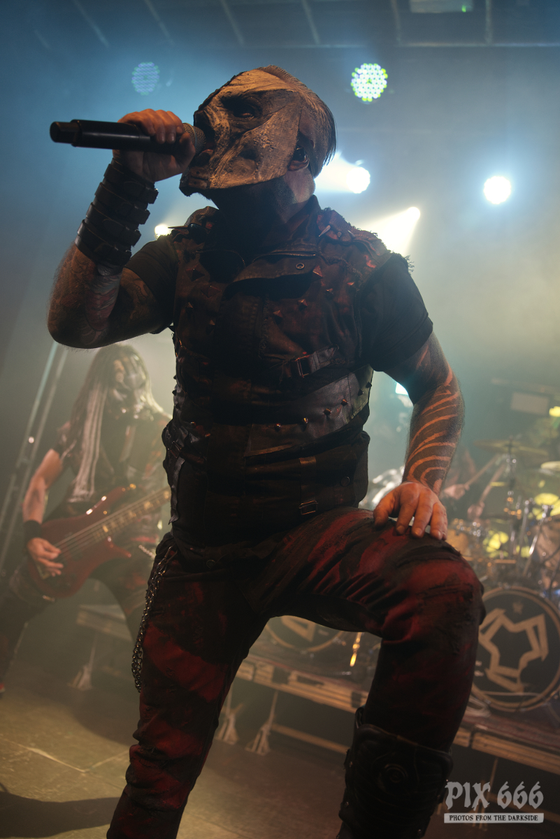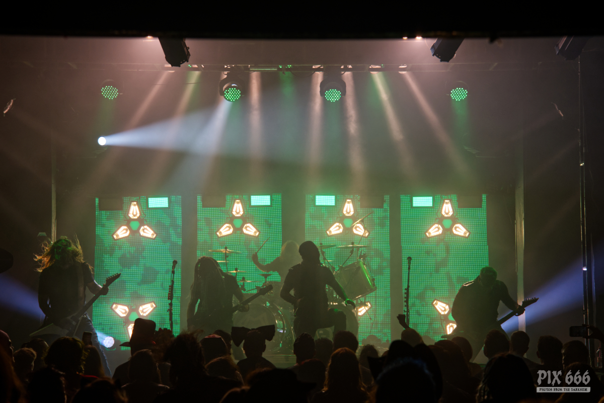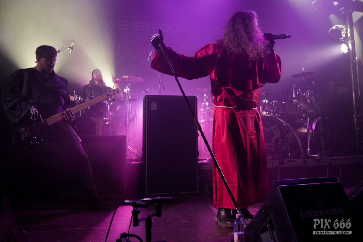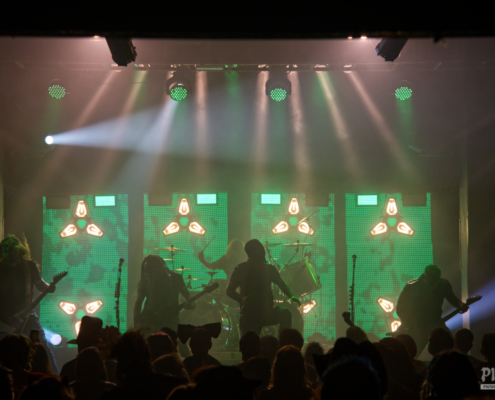 Nun wurde die Bühne bereitet für den Headliner des Abends bzw. der Gruselnacht. FFS Bookings hat es geschafft, die tschechische Megaband Dymytry nach Wien zu holen – anders kann man eine Band kaum bezeichnen, die in ihrem Heimatland für ihr Album ‚Revolter‘ eine Platinauszeichnung erhalten hat. Die Band hat für den Start ihrer internationalen Karriere das Erfolgsalbum auch in englischer Sprache veröffentlicht und sich zu einem kuriosen Schritt entschieden. Sänger Protheus wird bei den internationalen Auftritten von Alen Ljubic ersetzt. Wer wissen will, wie es genau zu dieser Idee kam, sollte sich unbedingt mal bei Google umschauen, das würde jetzt hier den Rahmen sprengen. Dymytry lieferten in der ((Szene)) eine mega leiwande Licht- und Bühnenshow ab. Auch die Songs vom neuen Album ‚Five Angry Men‘ kamen super an, ‚Enemy List‘ und ‚Everything Is Black‘ haben sogar richtige Ohrwurm Qualität. Der Sänger drehte dann eine ausgiebige Runde gemeinsam mit den euphorischen Fans im Circlepit. Die Band nannte den Zombieball die „geilste Halloween Party, auf der wir je waren“. Nun gab es eine tolle Coverversion des Rockwell Hits ‚Somebody‘s Watching Me‘, bei der im Original die Legende Michael Jackson den Refrain singt. Immer wieder wurde auch das Publikum mit in die Show einbezogen. „Lasst und singen, klatschen, moshen – lasst uns im Takt springen. Wir machen ein bisschen Halloween Party“ hiess es dann vorm Klassiker ‚Behind The Mask‘ aus dem Jahr 2018. Nach der ganzen Anstrengung hiess es dann „Alle runter jetzt und auf mein Kommando springen wir dann“. Das hatte wirklich was von ‚Touchdown‘ und dem anschließenden Jubelsprung. Wir waren wirklich sprachlos von der Show und der super Stimmung – eine fantastische Bandauswahl mit einem überragenden Headliner. Wow – danke FFS Bookings, das war großartig.