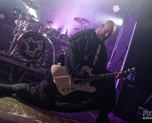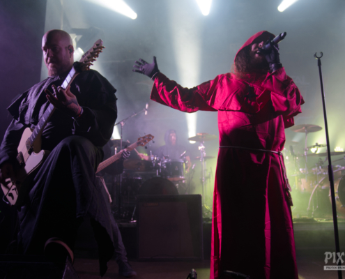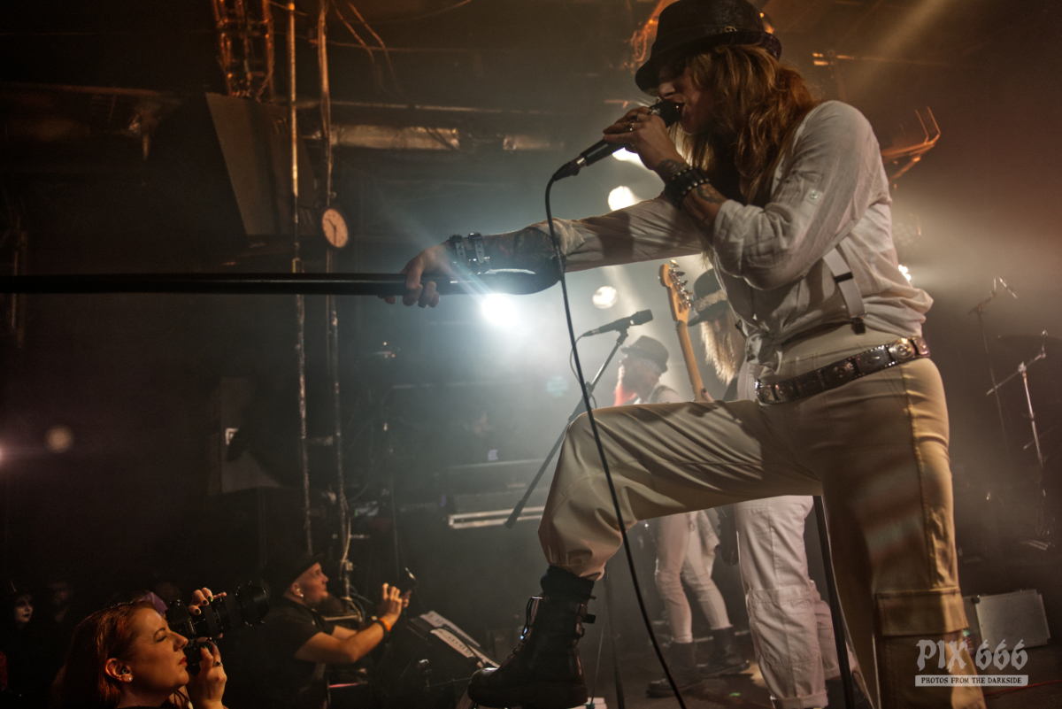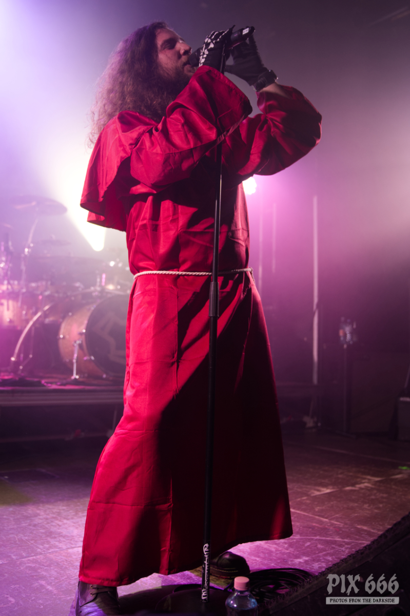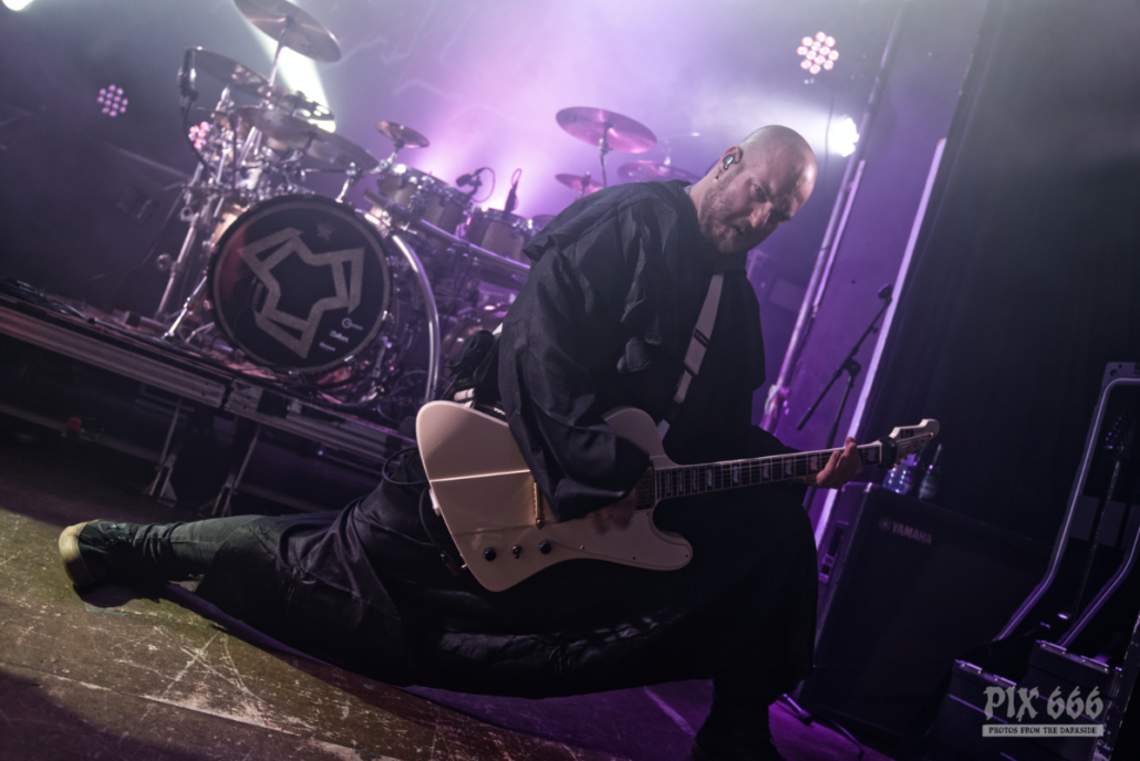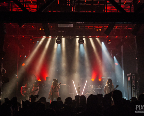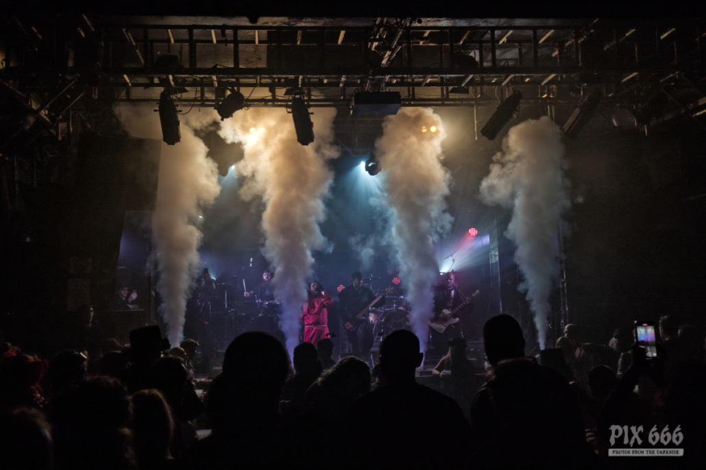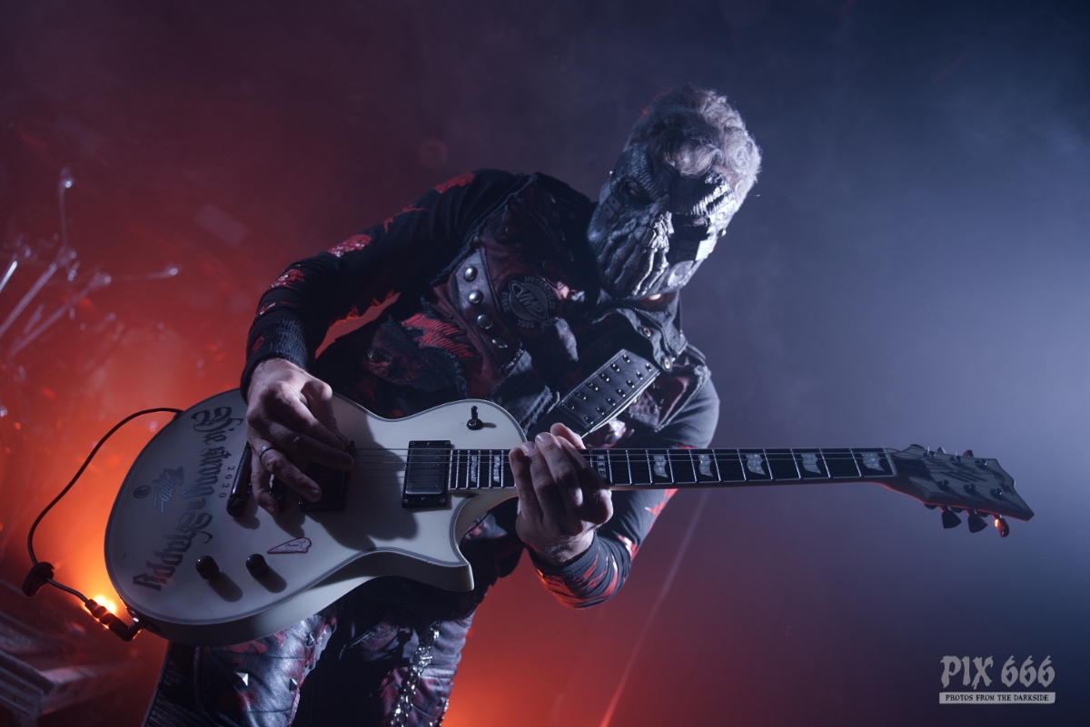 Nun wurde die Bühne bereitet für den Headliner des Abends bzw. der Gruselnacht. FFS Bookings hat es geschafft, die tschechische Megaband Dymytry nach Wien zu holen – anders kann man eine Band kaum bezeichnen, die in ihrem Heimatland für ihr Album ‚Revolter‘ eine Platinauszeichnung erhalten hat. Die Band hat für den Start ihrer internationalen Karriere das Erfolgsalbum auch in englischer Sprache veröffentlicht und sich zu einem kuriosen Schritt entschieden. Sänger Protheus wird bei den internationalen Auftritten von Alen Ljubic ersetzt. Wer wissen will, wie es genau zu dieser Idee kam, sollte sich unbedingt mal bei Google umschauen, das würde jetzt hier den Rahmen sprengen. Dymytry lieferten in der ((Szene)) eine mega leiwande Licht- und Bühnenshow ab. Auch die Songs vom neuen Album ‚Five Angry Men‘ kamen super an, ‚Enemy List‘ und ‚Everything Is Black‘ haben sogar richtige Ohrwurm Qualität. Der Sänger drehte dann eine ausgiebige Runde gemeinsam mit den euphorischen Fans im Circlepit. Die Band nannte den Zombieball die „geilste Halloween Party, auf der wir je waren“. Nun gab es eine tolle Coverversion des Rockwell Hits ‚Somebody‘s Watching Me‘, bei der im Original die Legende Michael Jackson den Refrain singt. Immer wieder wurde auch das Publikum mit in die Show einbezogen. „Lasst und singen, klatschen, moshen – lasst uns im Takt springen. Wir machen ein bisschen Halloween Party“ hiess es dann vorm Klassiker ‚Behind The Mask‘ aus dem Jahr 2018. Nach der ganzen Anstrengung hiess es dann „Alle runter jetzt und auf mein Kommando springen wir dann“. Das hatte wirklich was von ‚Touchdown‘ und dem anschließenden Jubelsprung. Wir waren wirklich sprachlos von der Show und der super Stimmung – eine fantastische Bandauswahl mit einem überragenden Headliner. Wow – danke FFS Bookings, das war großartig.